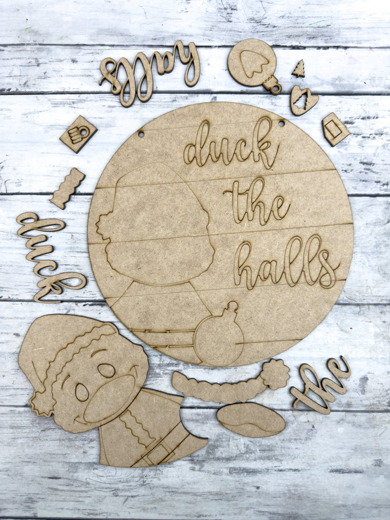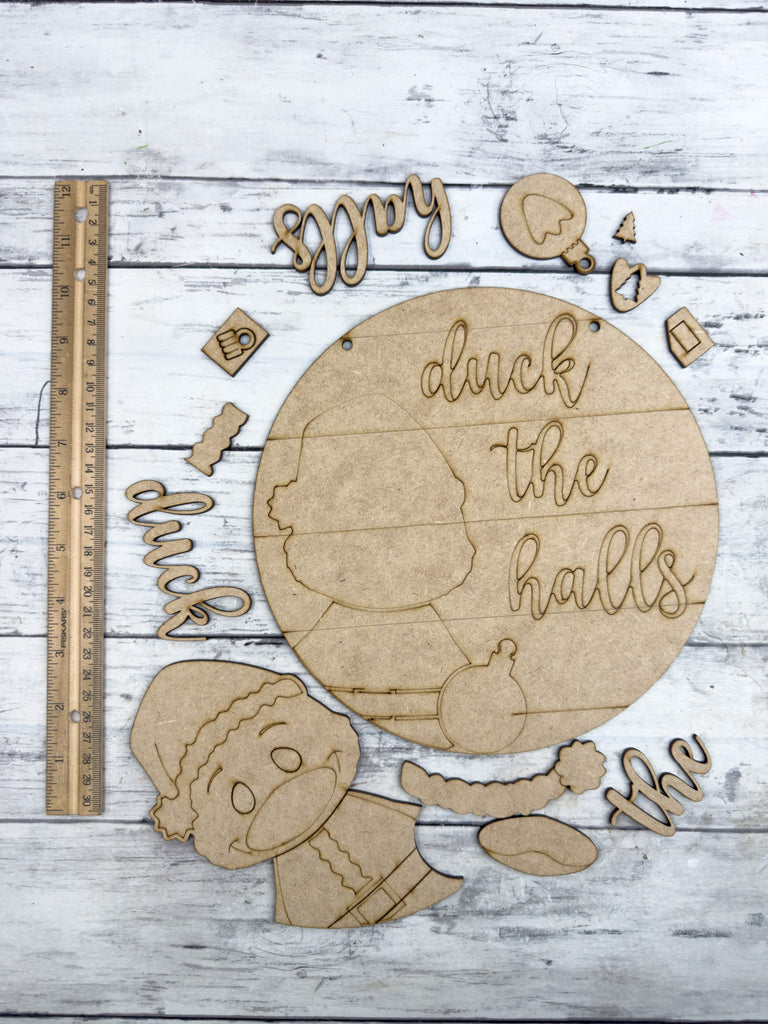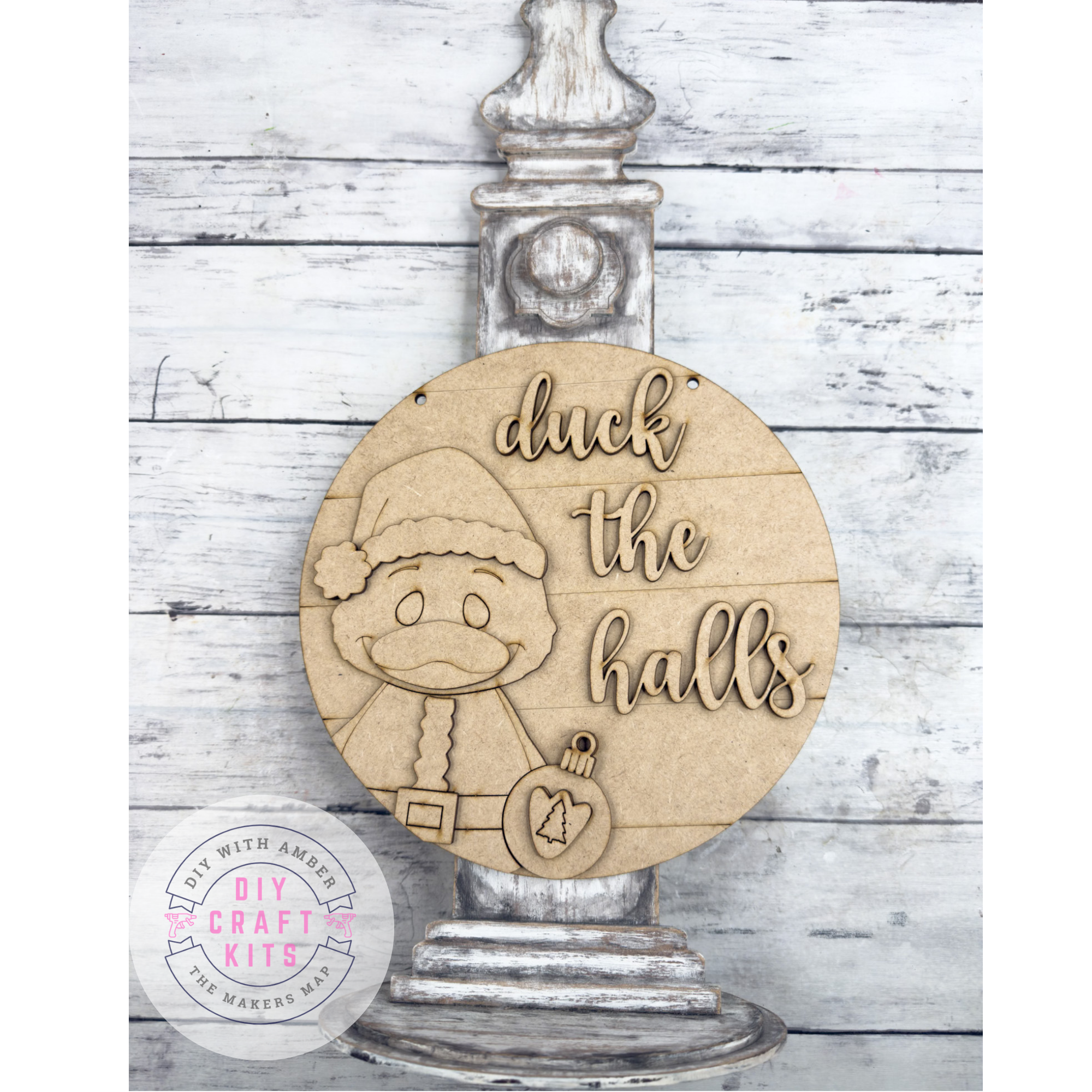 Bring humor and holiday spirit together with the Duck the Halls DIY Craft Kit! This unfinished 9-inch round sign features a festive duck in a Santa hat holding an ornament alongside the playful phrase Duck the Halls. It’s a fun seasonal project for crafters who love unique farmhouse-style Christmas décor.