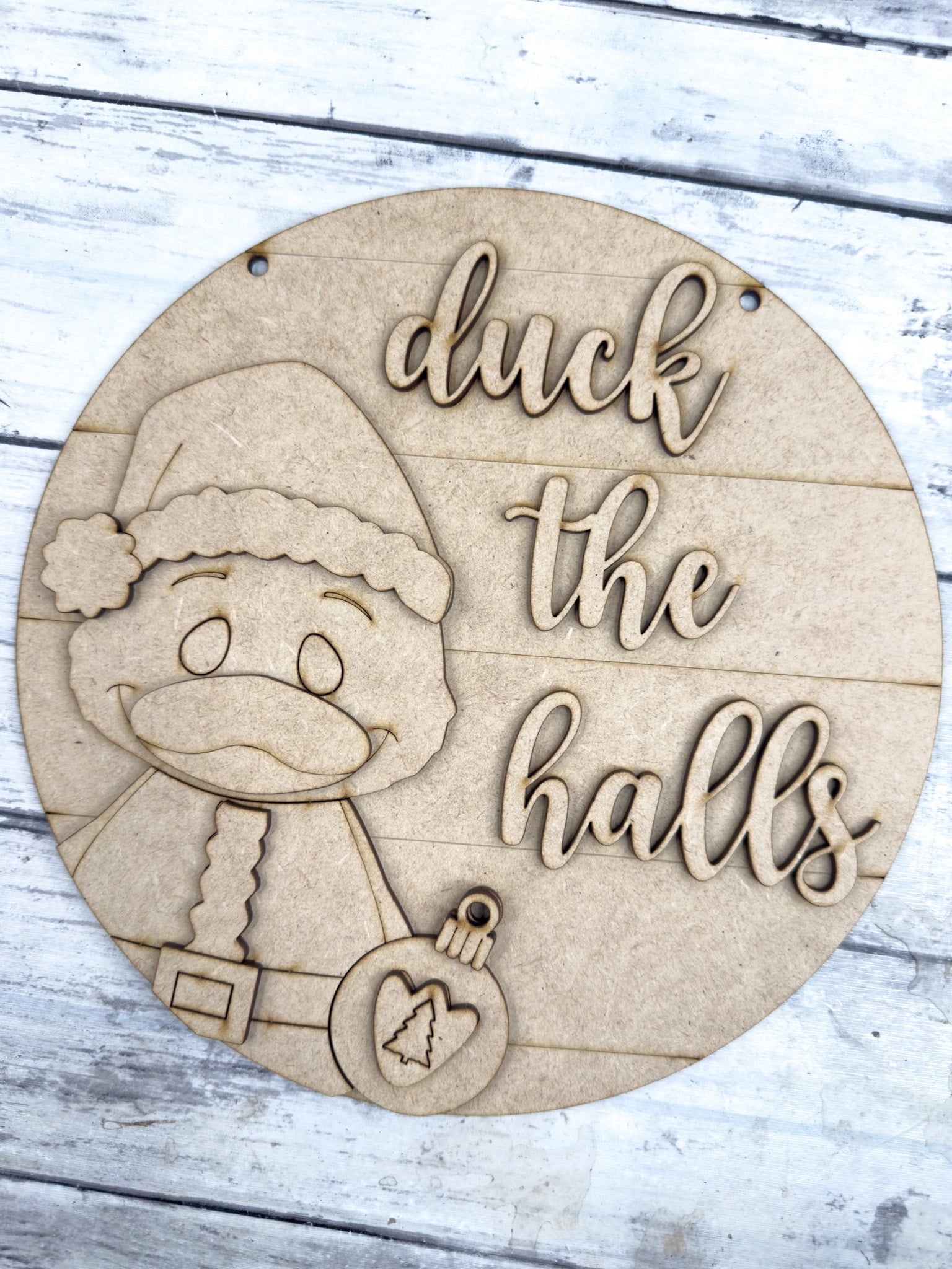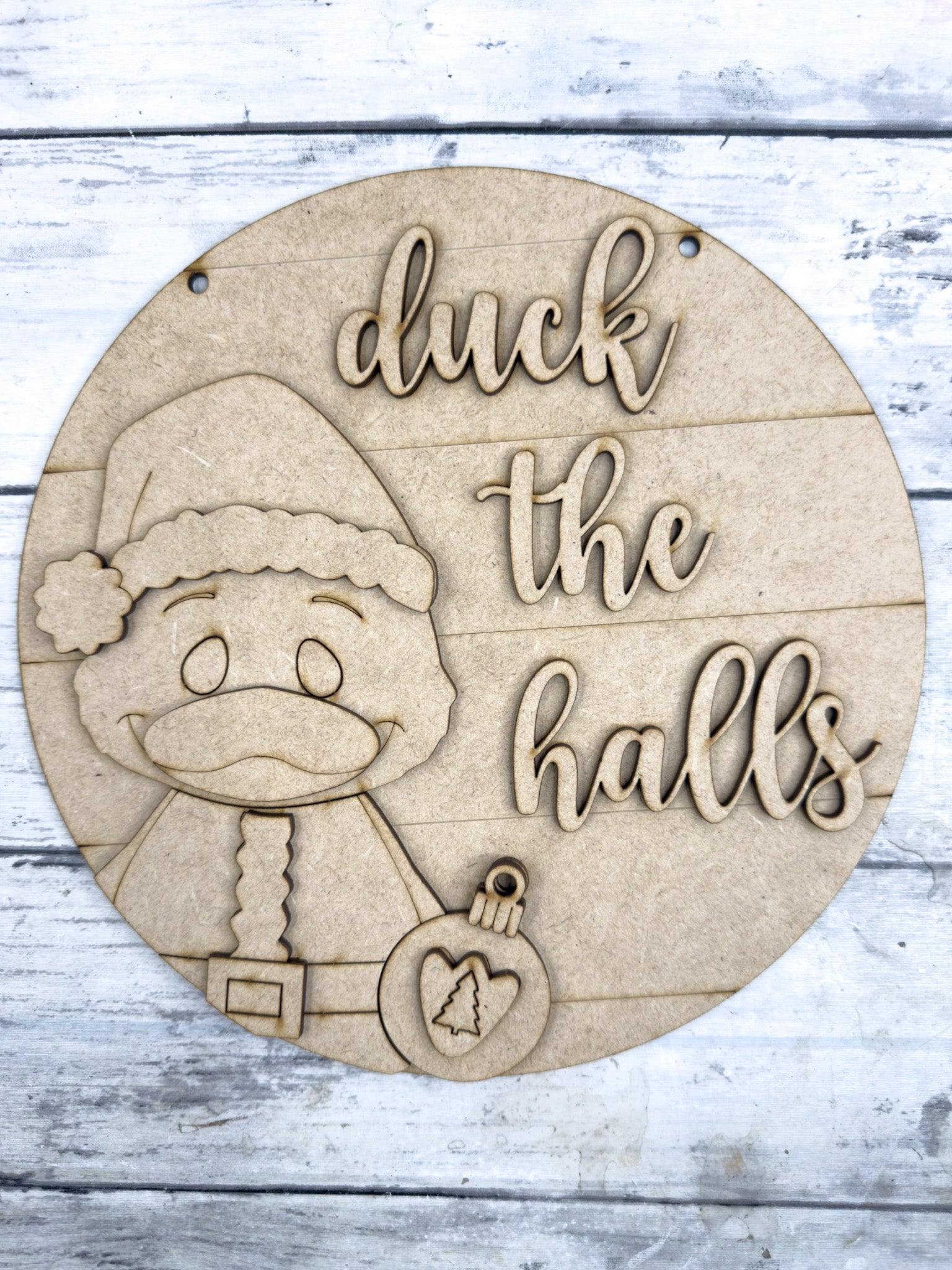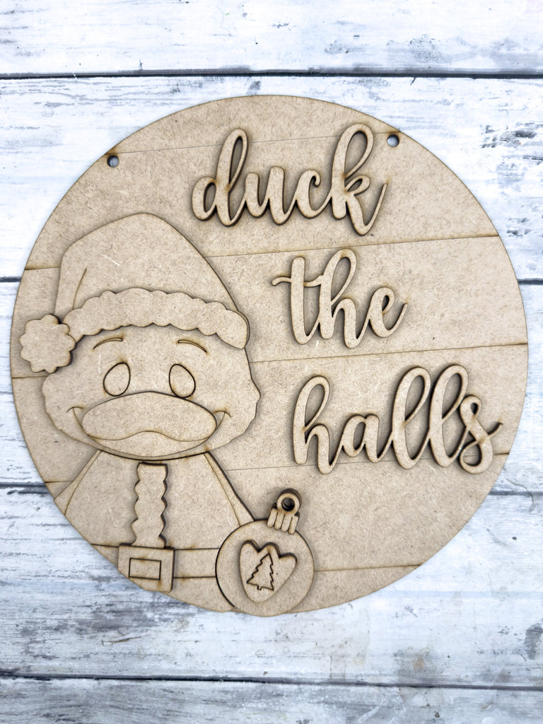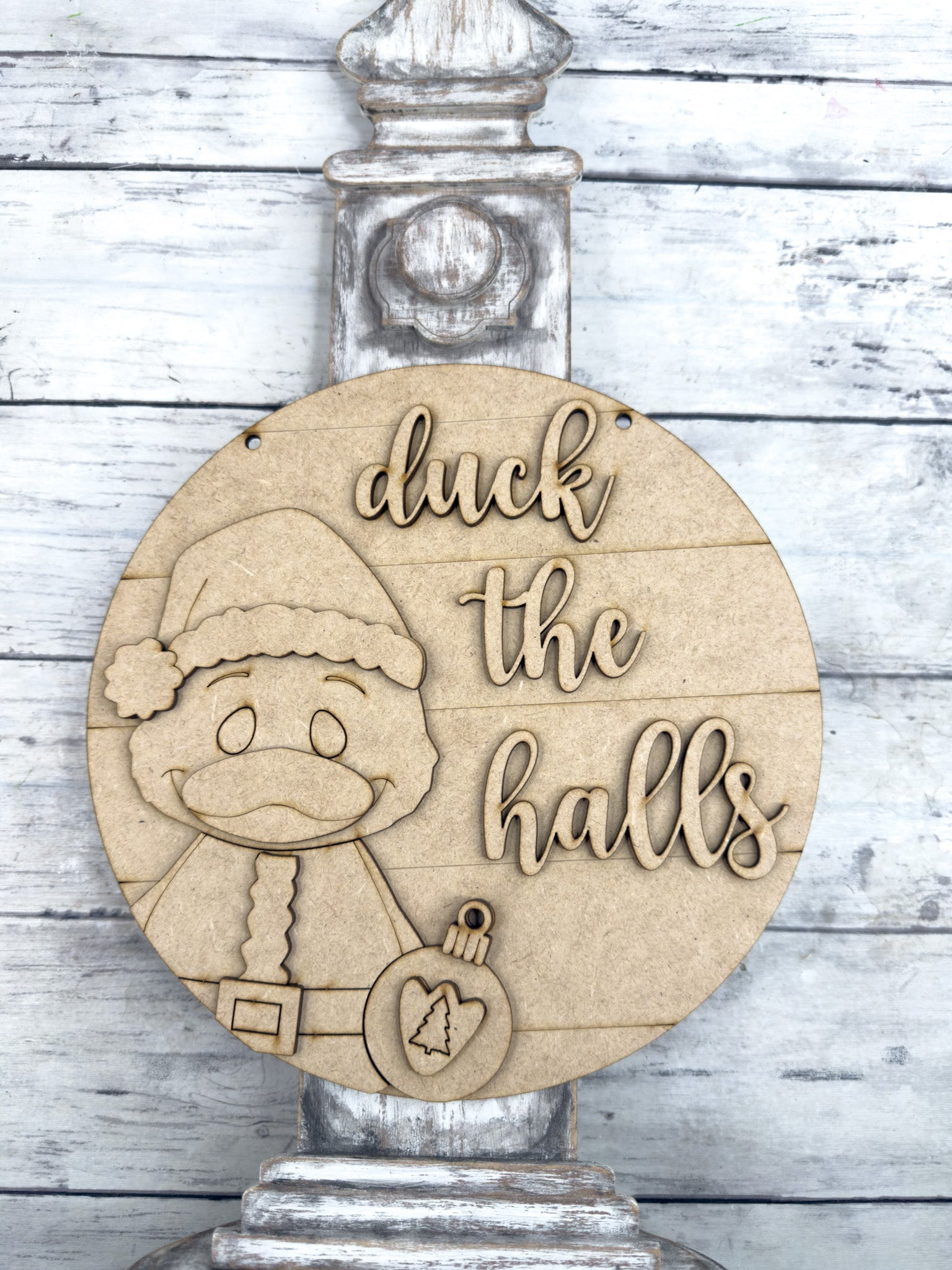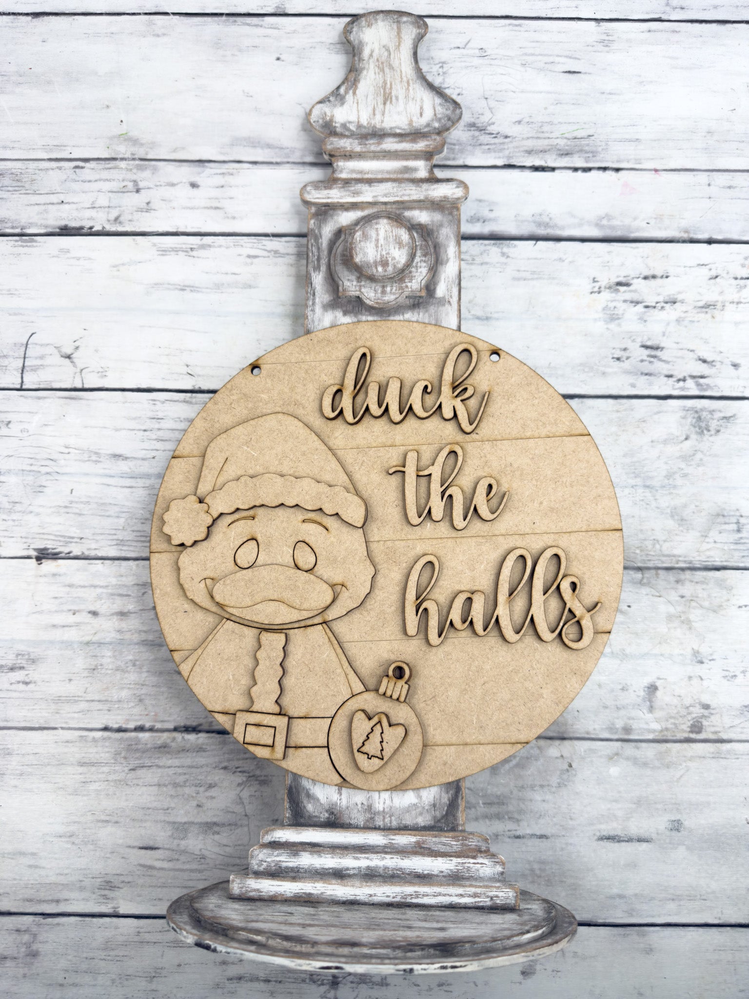 Round duck sign with “Duck the Halls” lettering and ornament detail