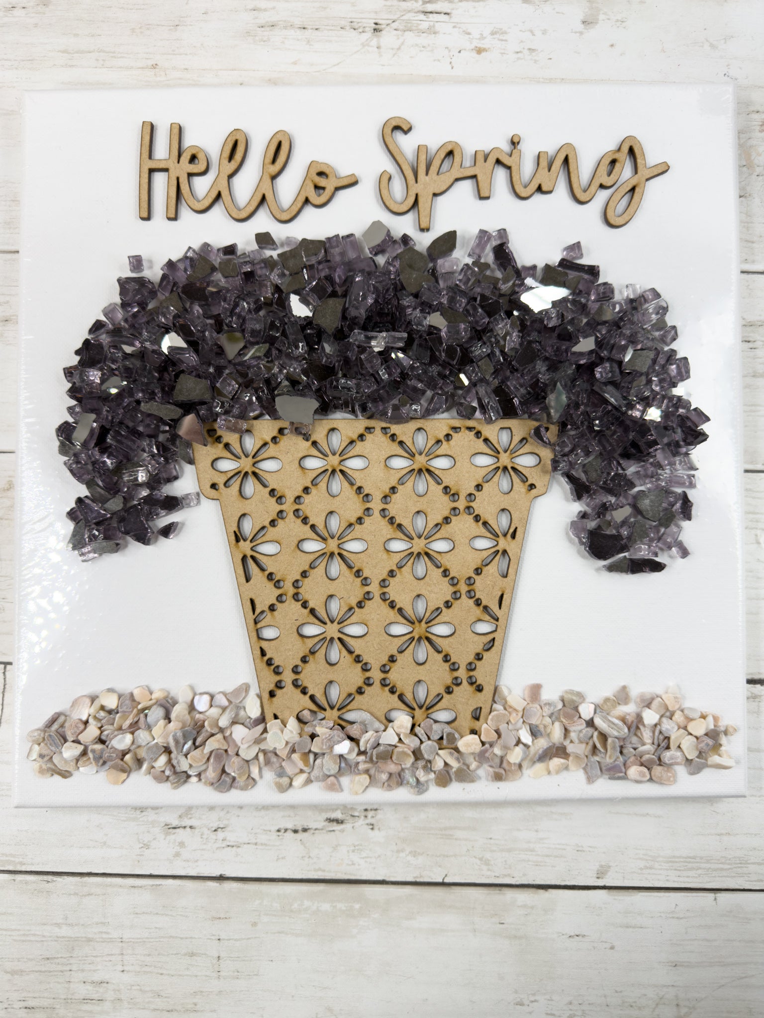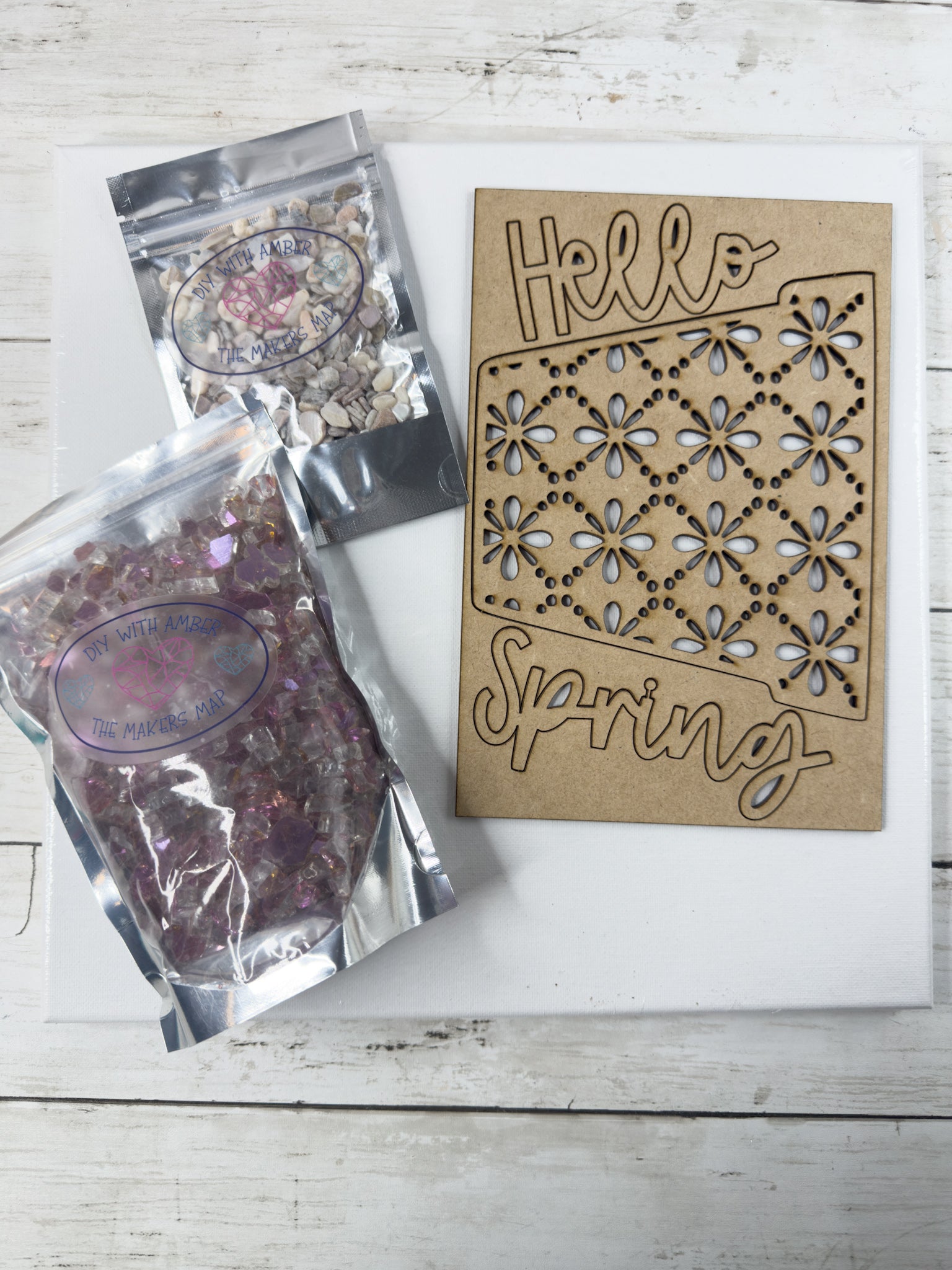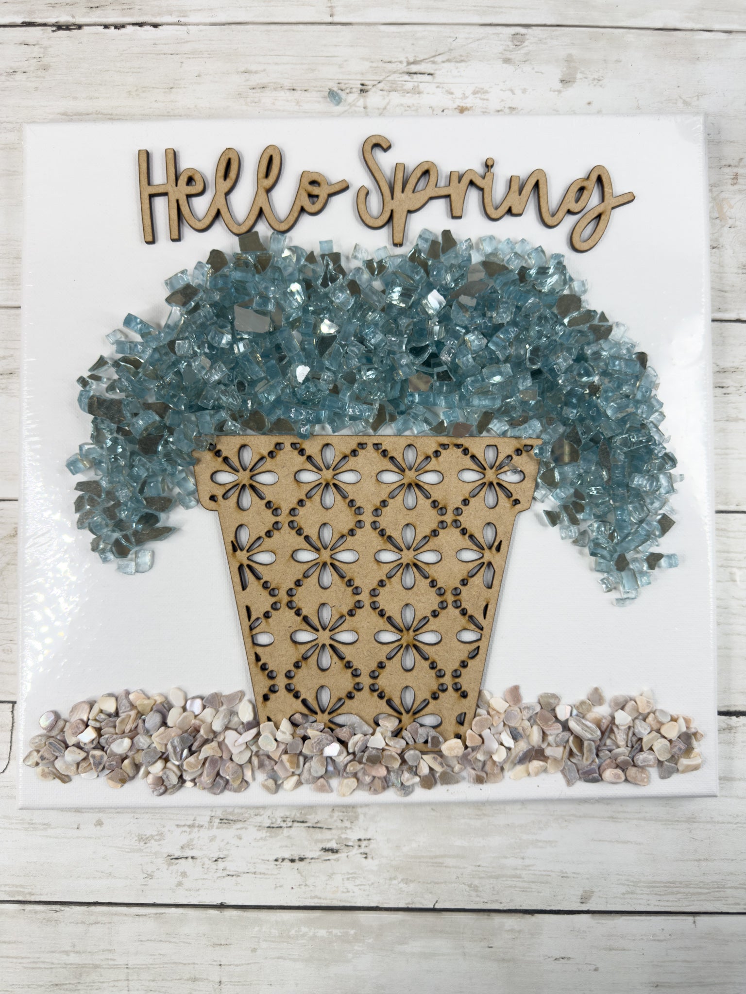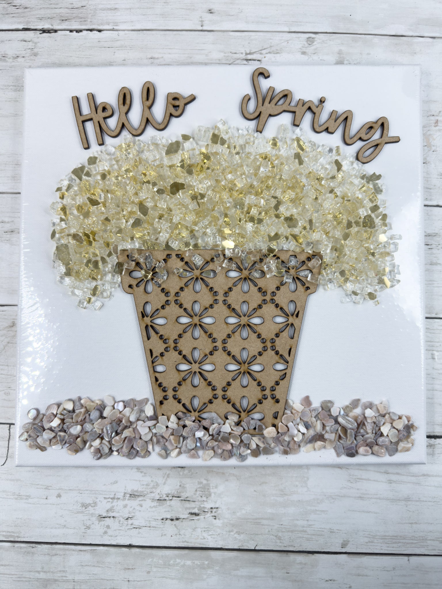 Create beautiful crushed glass flower pot with hello spring canvas art with this kit. purchase Resin here