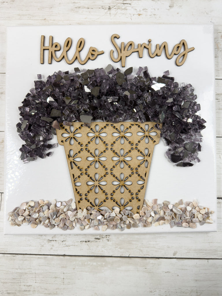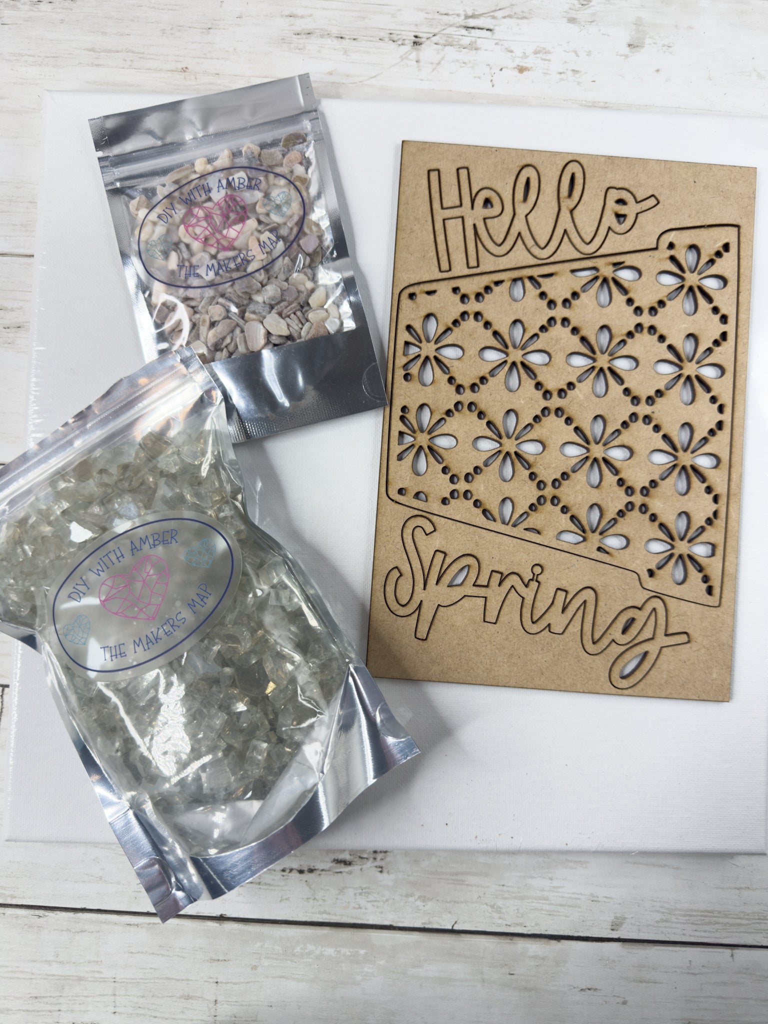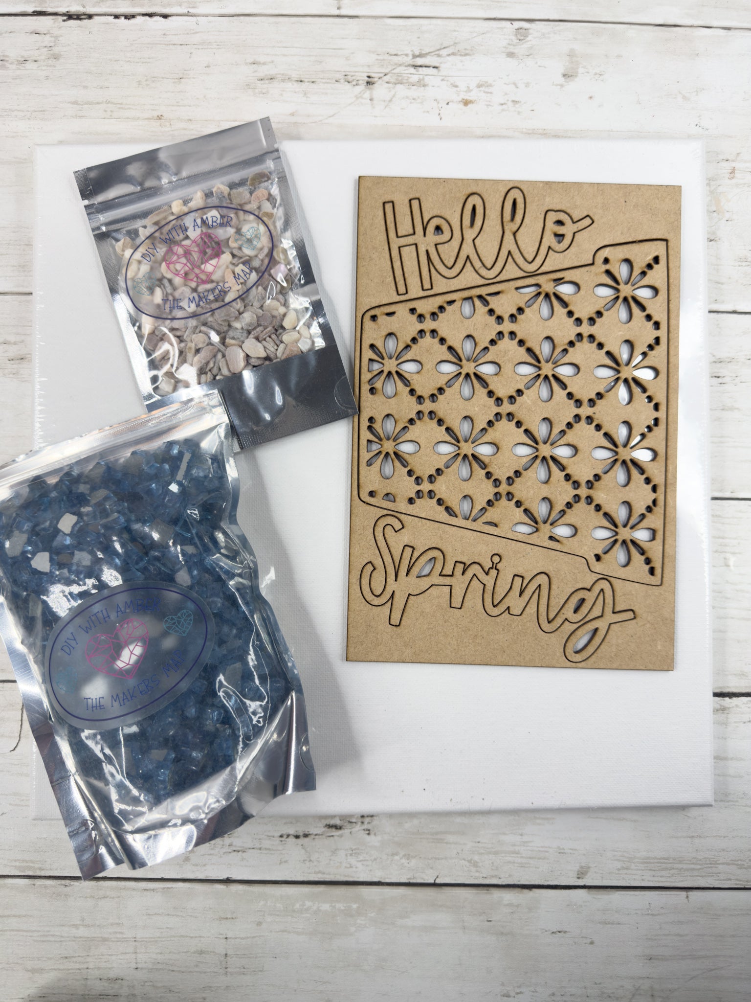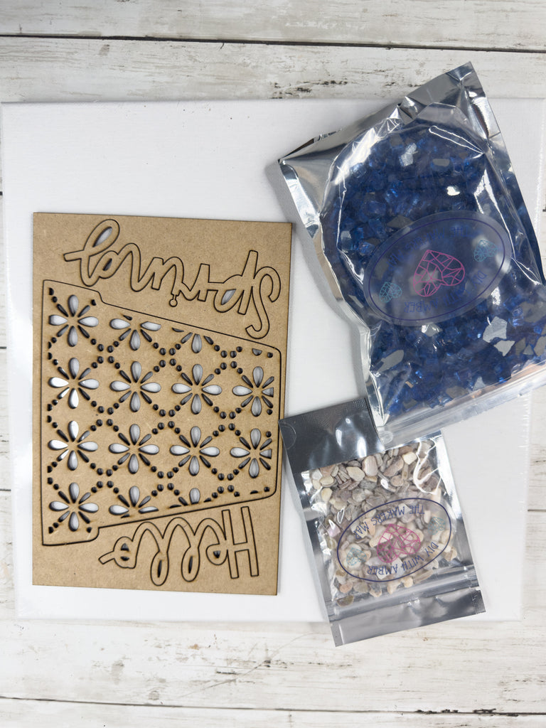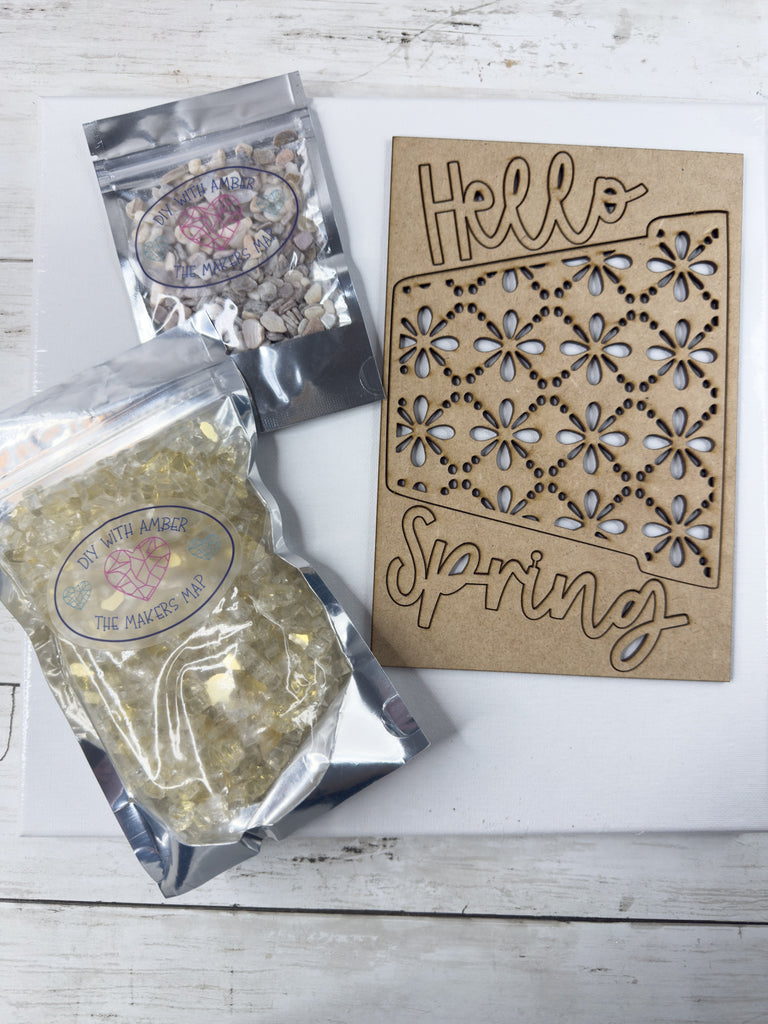 Create beautiful crushed glass flower pot with hello spring canvas art with this kit. purchase Resin here