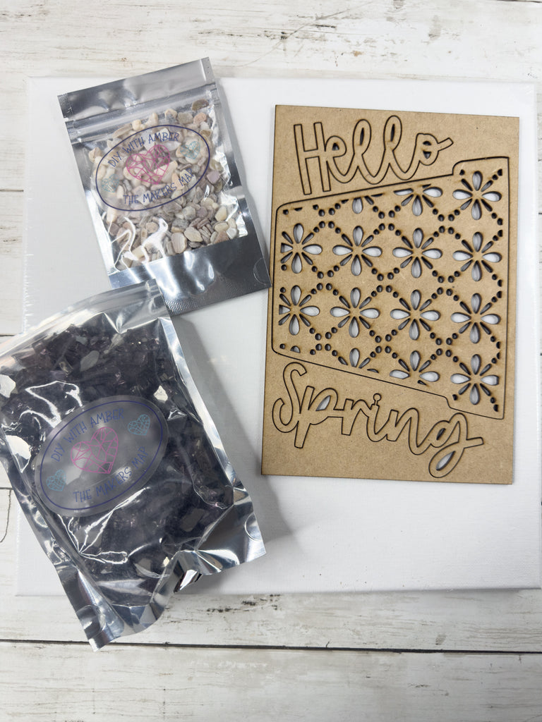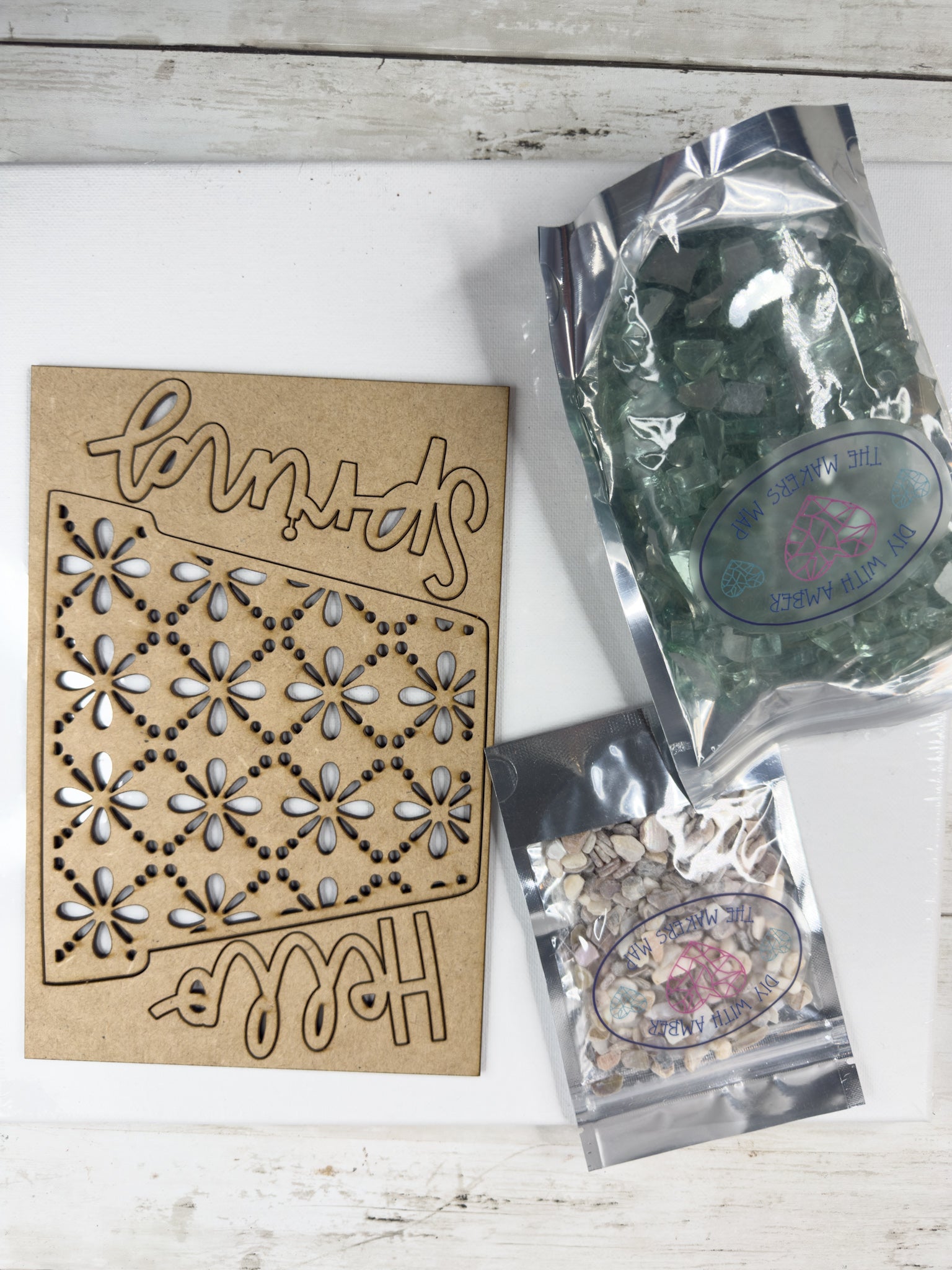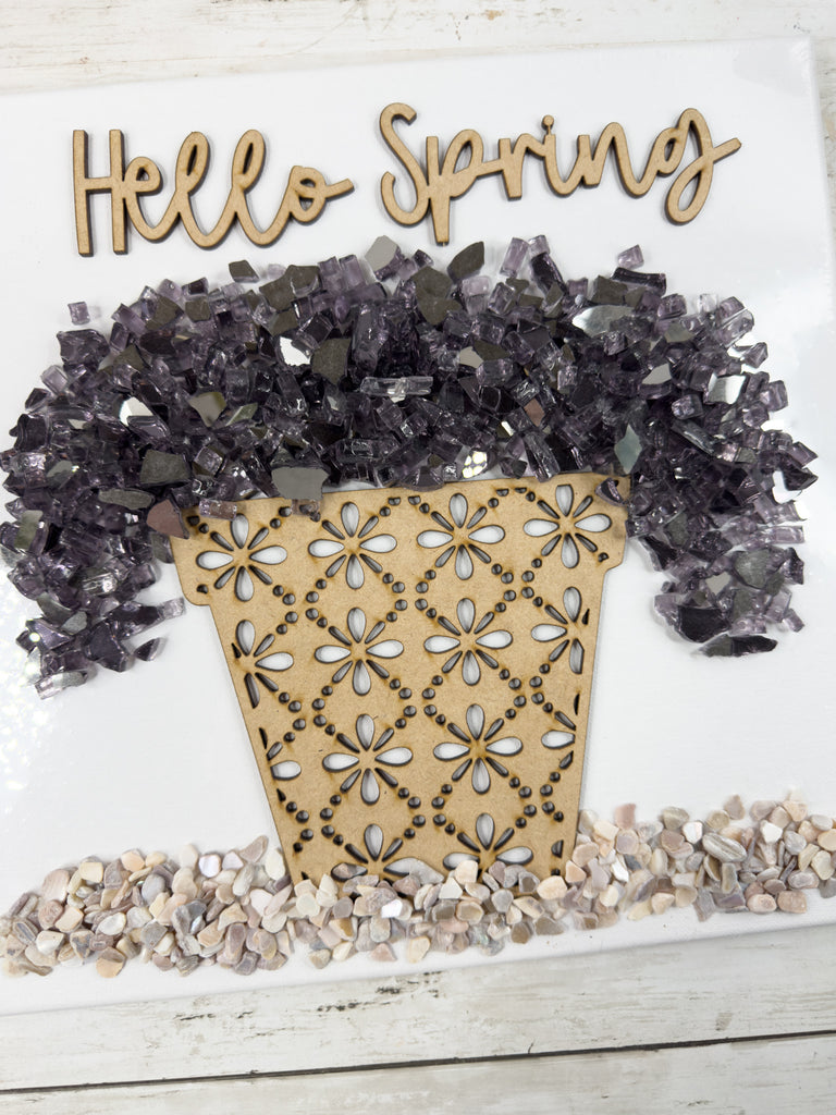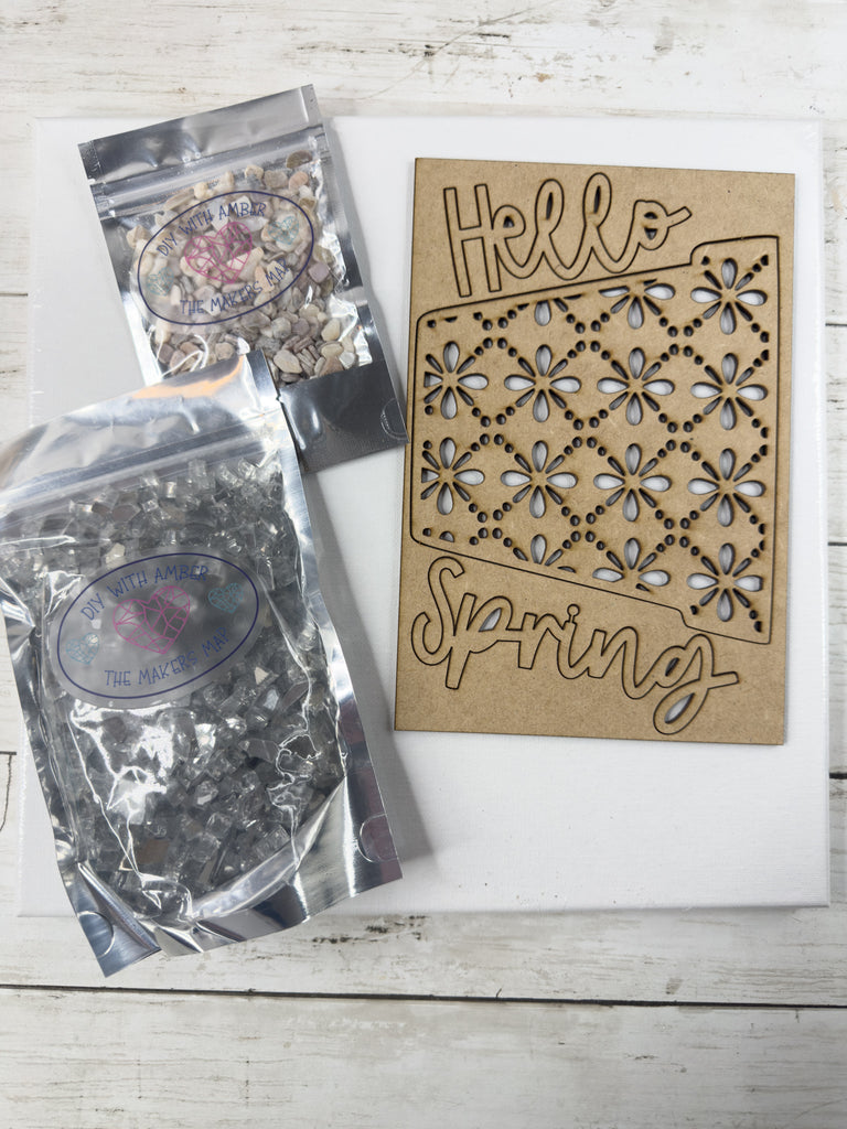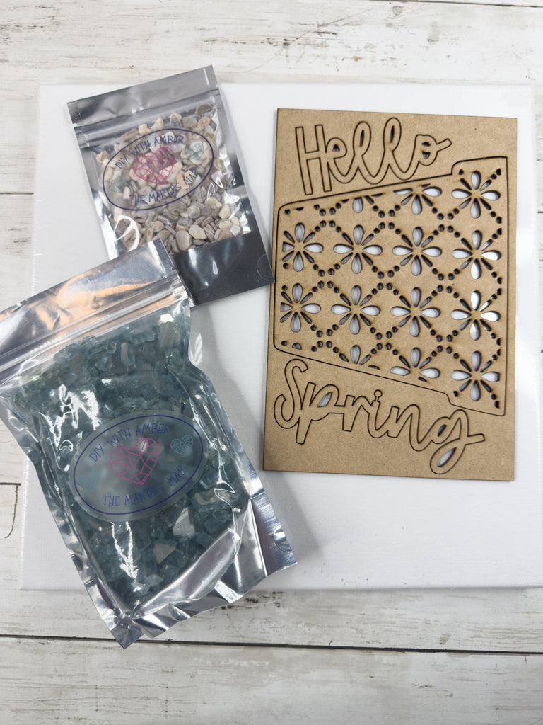 Create beautiful crushed glass flower pot with hello spring canvas art with this kit. purchase Resin here