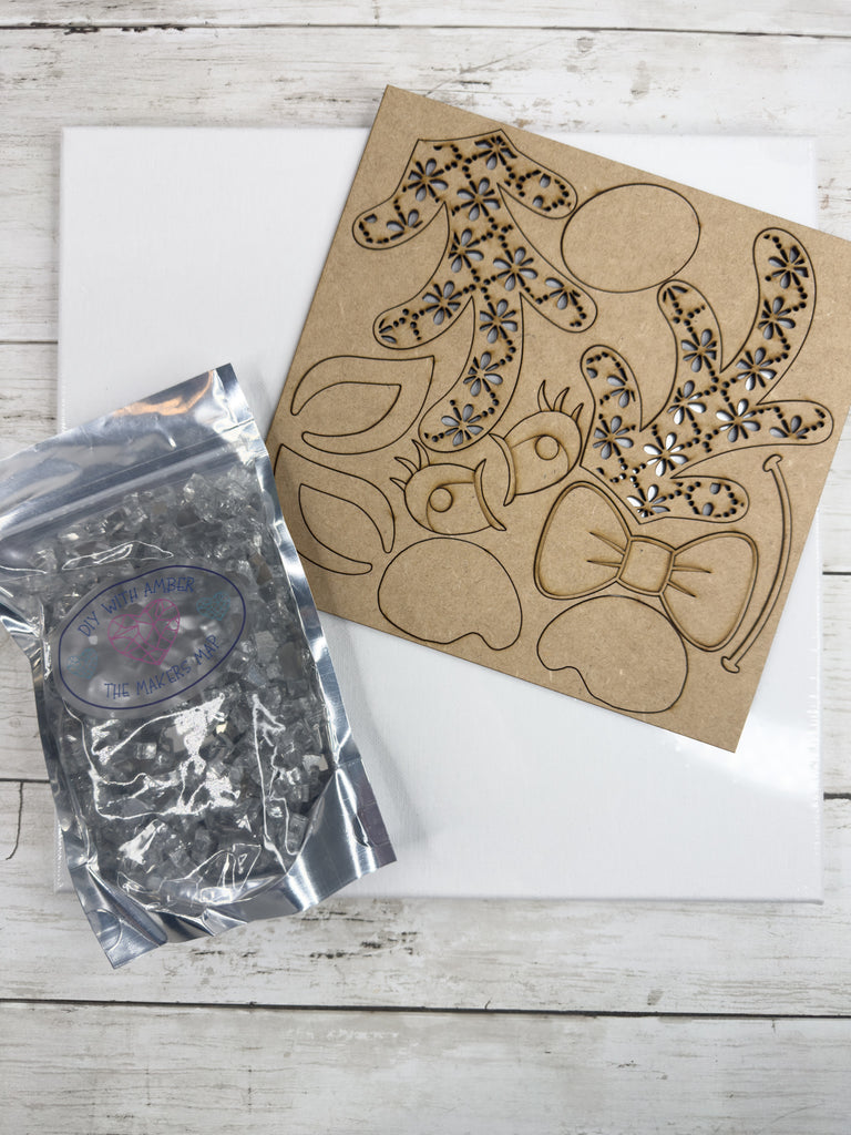 This project kit includes the 12x12 canvas, 16 oz reflective glass (single color of your choice), laser cut out embellishments