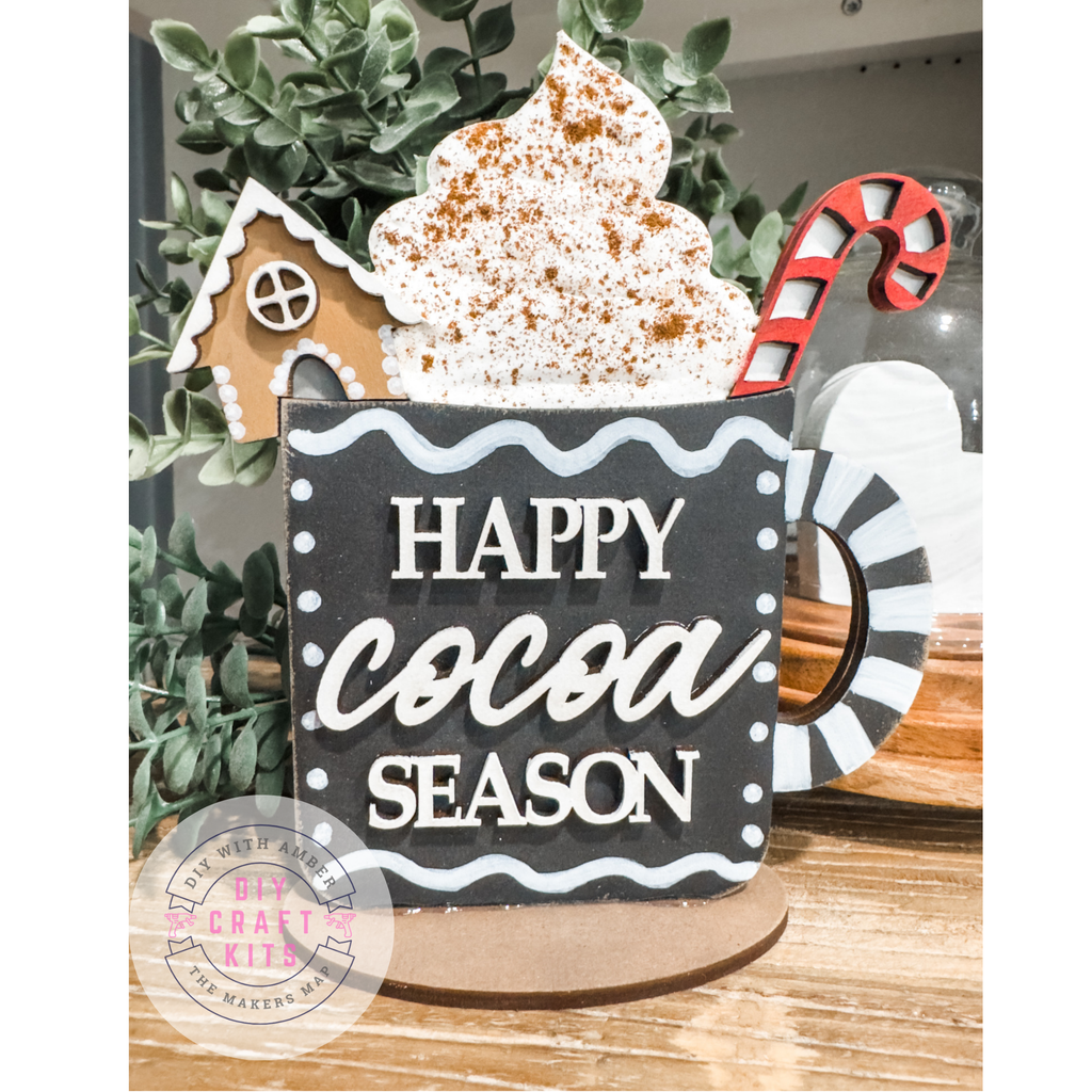 Celebrate cozy days with this Happy Cocoa Season Mug DIY Craft Kit! This adorable layered wood design features a steaming mug topped with whipped cream, a candy cane, and a tiny gingerbread-style house tucked on the side — all with the phrase “Happy Cocoa Season” front and center.