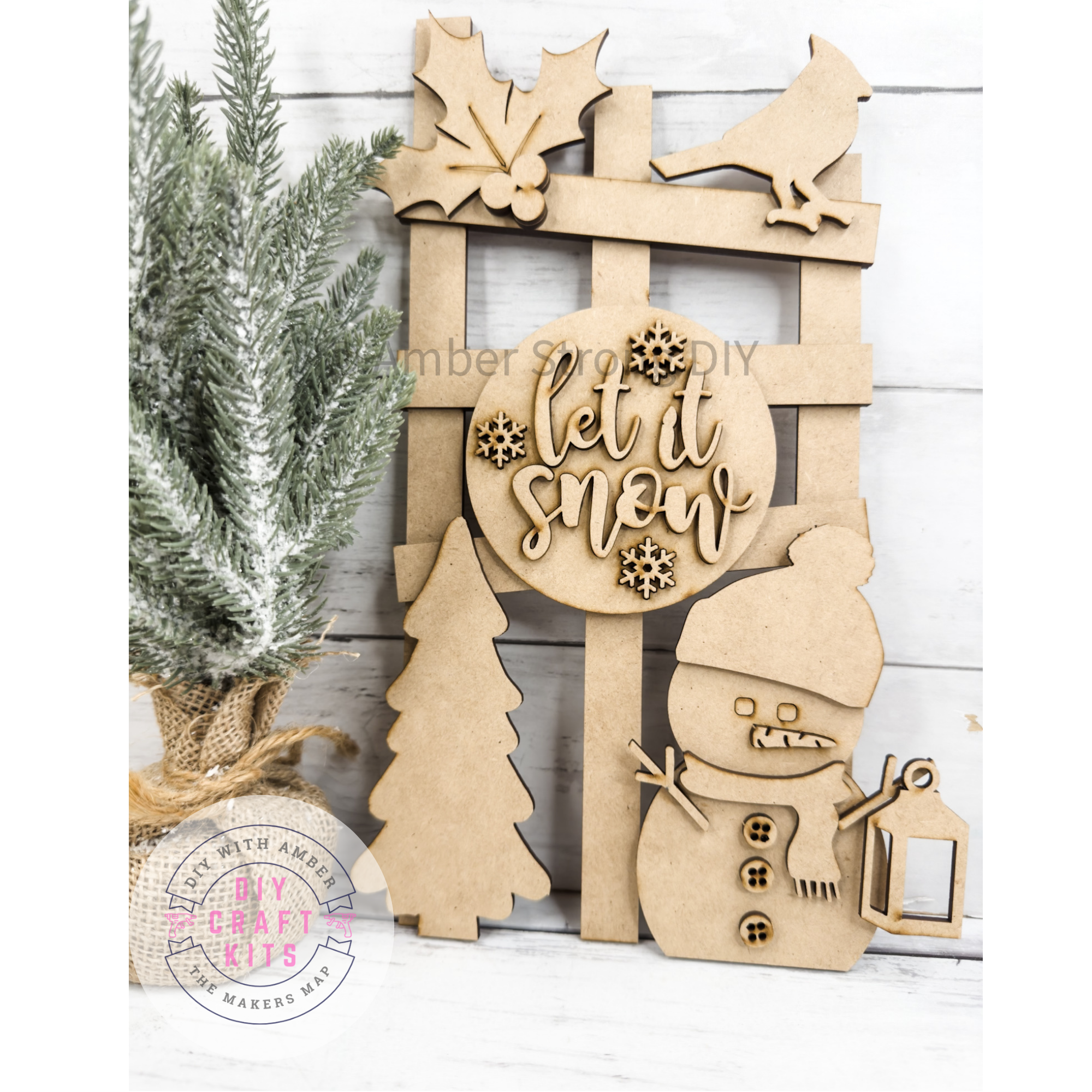 Create a charming winter scene with this Let It Snow Winter Fence DIY Craft Kit! This detailed layered design features a rustic fence backdrop with holly leaves, a cardinal, a snowman holding a lantern, pine tree, and a “let it snow” circle sign accented with snowflakes.