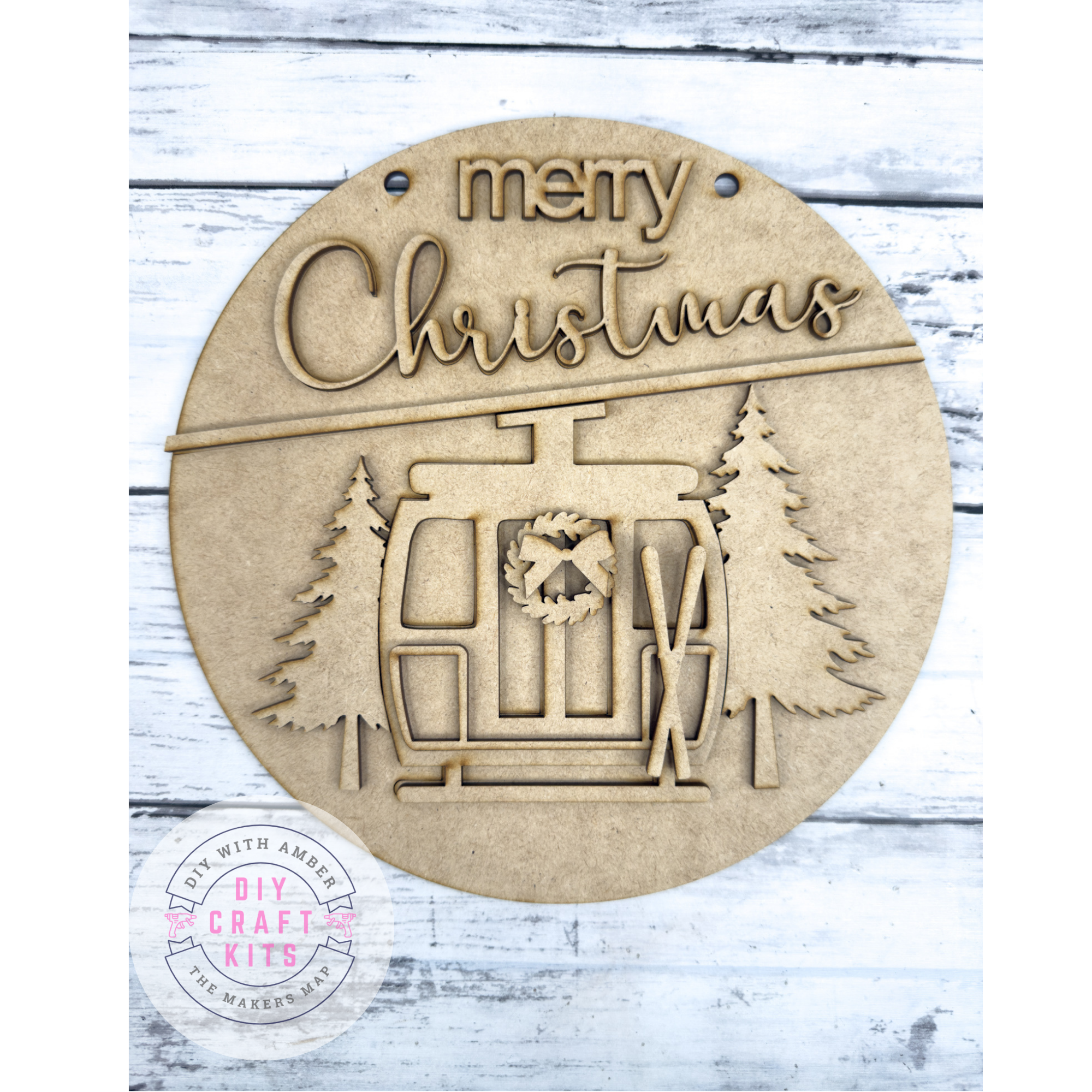 Hit the slopes with holiday spirit! 🎿🎄 This Merry Christmas gondola ornament kit features a cozy ski lift scene nestled between evergreen trees, complete with skis and a festive wreath. The playful lettering and layered design bring dimension and winter wonder to your Christmas décor.