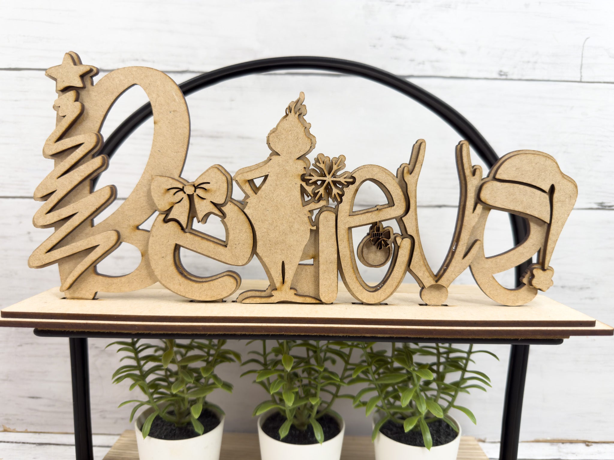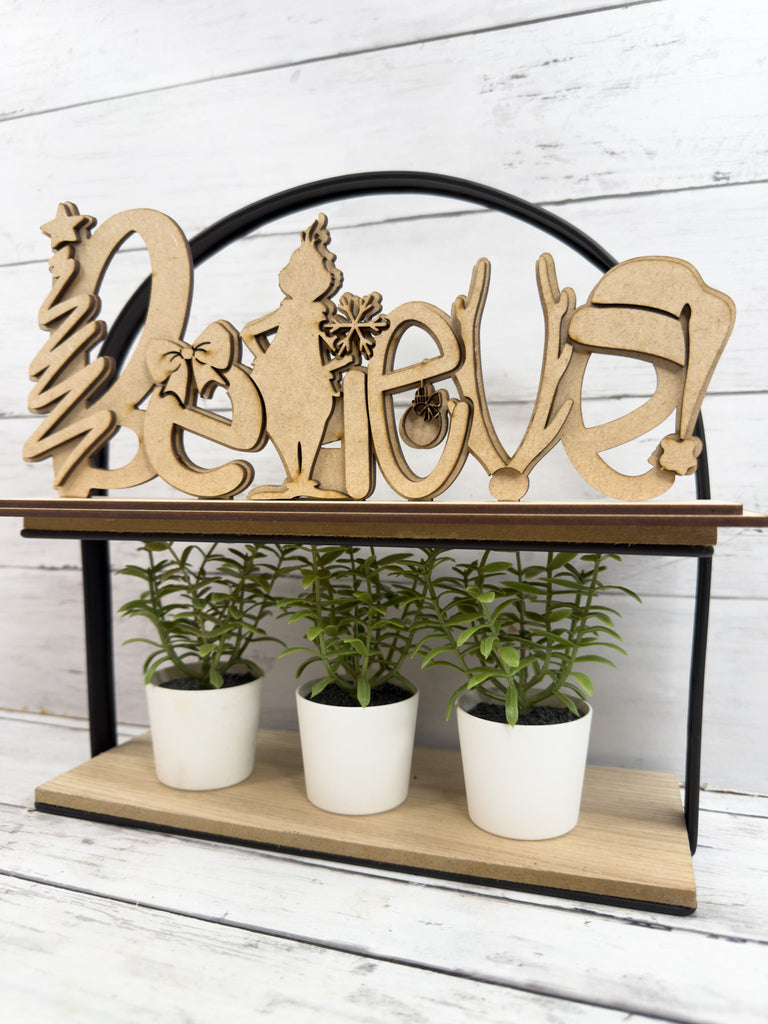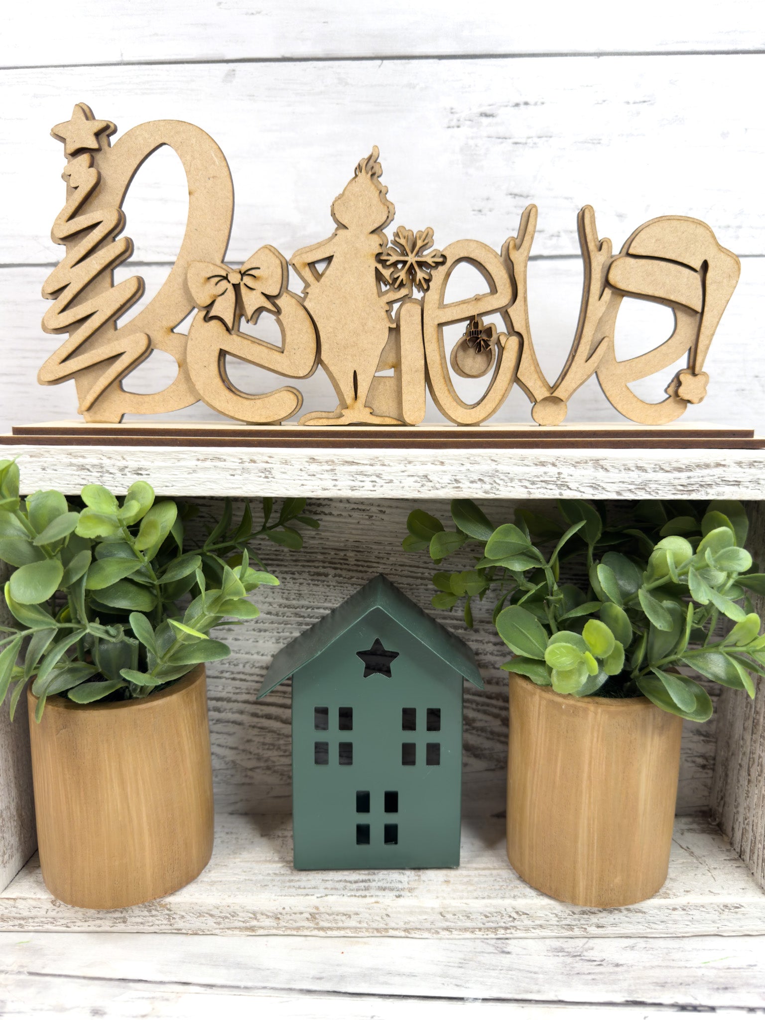 Add a touch of holiday magic to your décor with this Believe Word Sign Sitter! Designed with whimsical details including a Christmas tree, bow, ornaments, Santa hat, and a playful character silhouette, this piece brings farmhouse charm and festive cheer to mantels, shelves, or tiered trays.