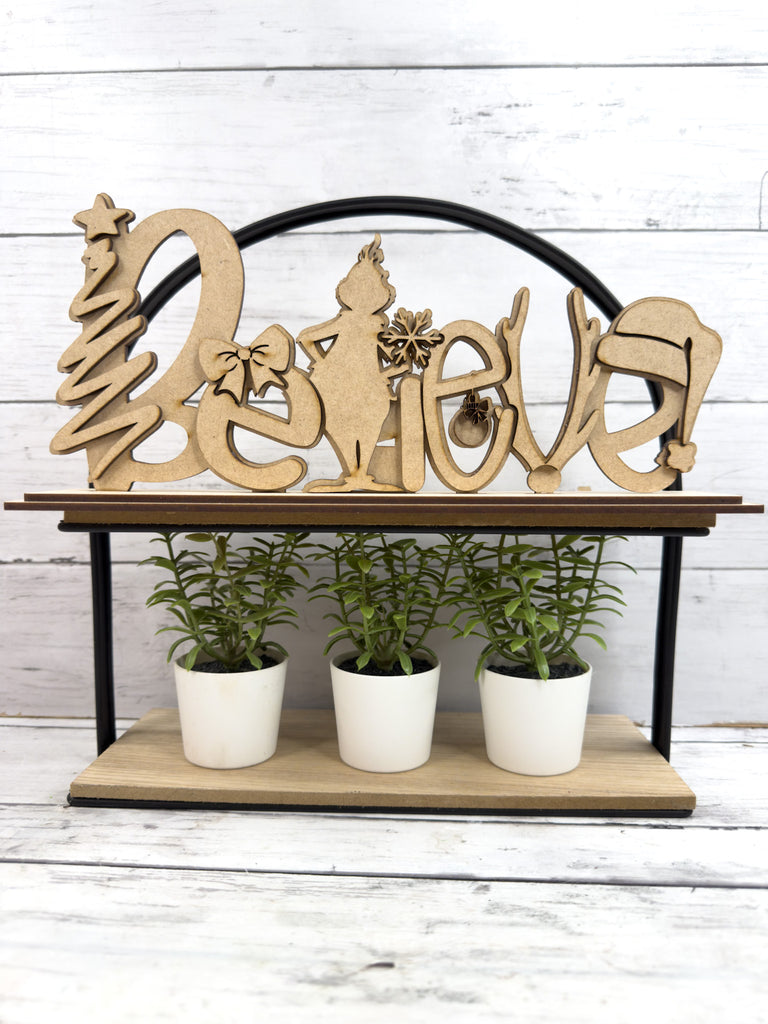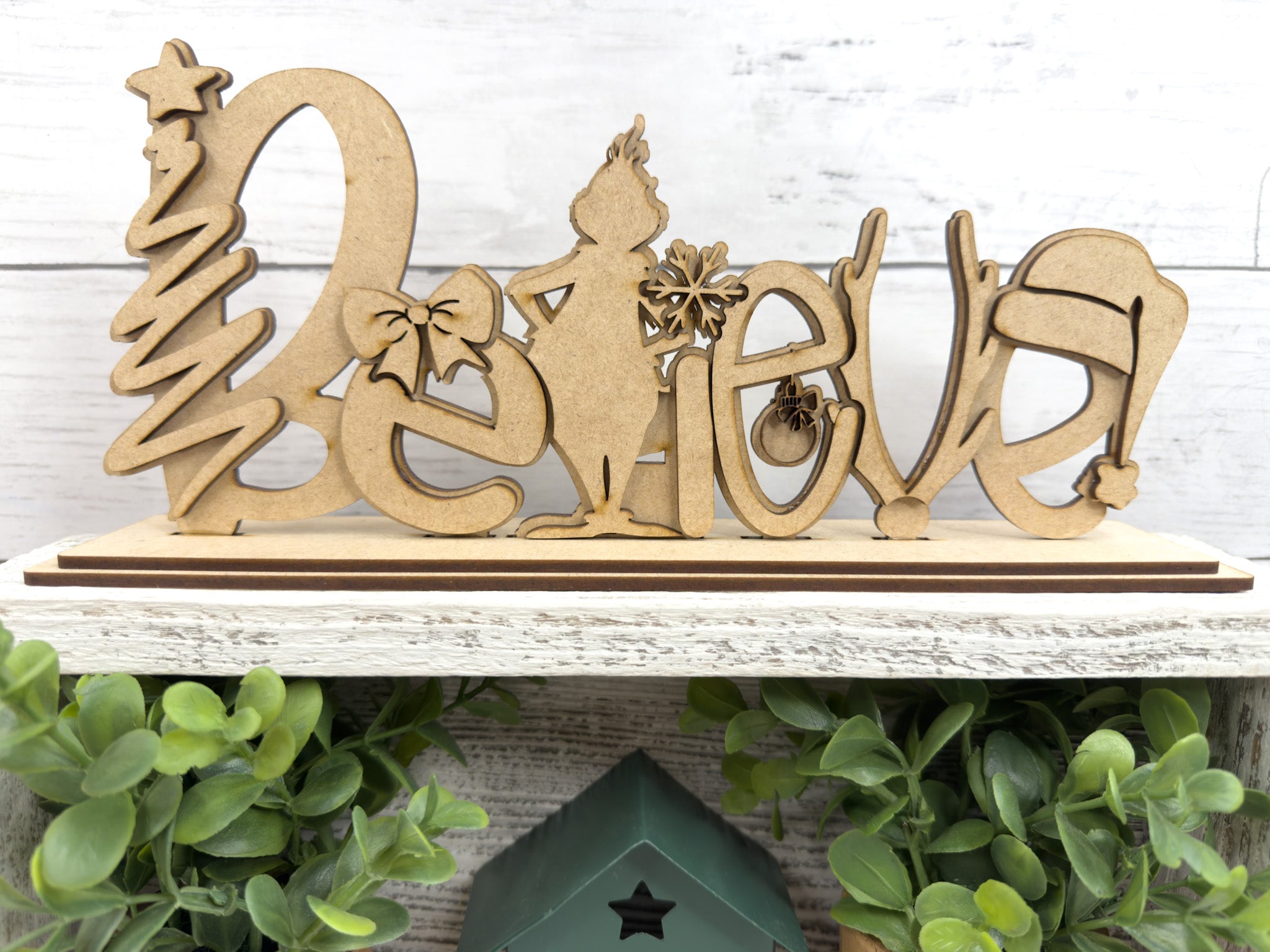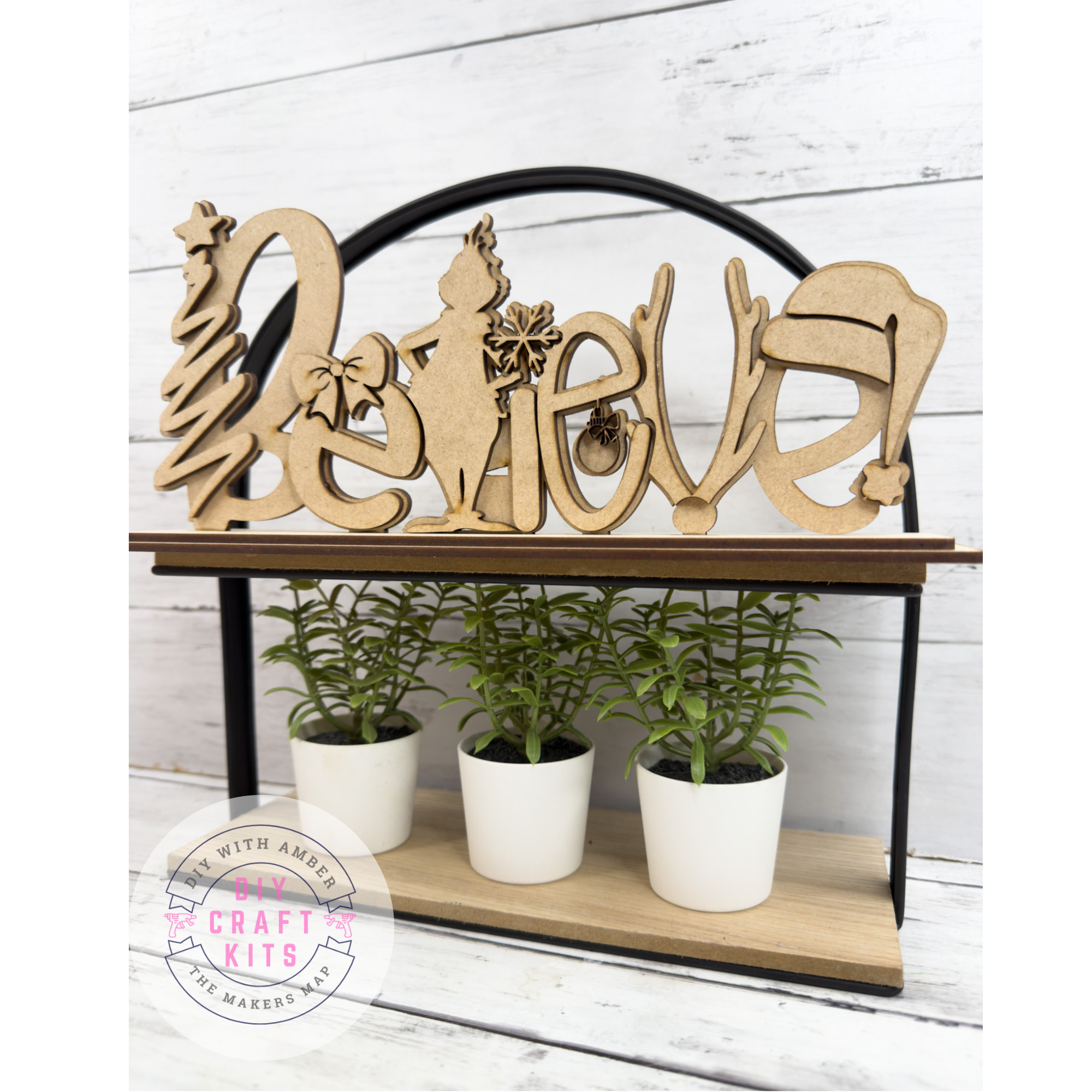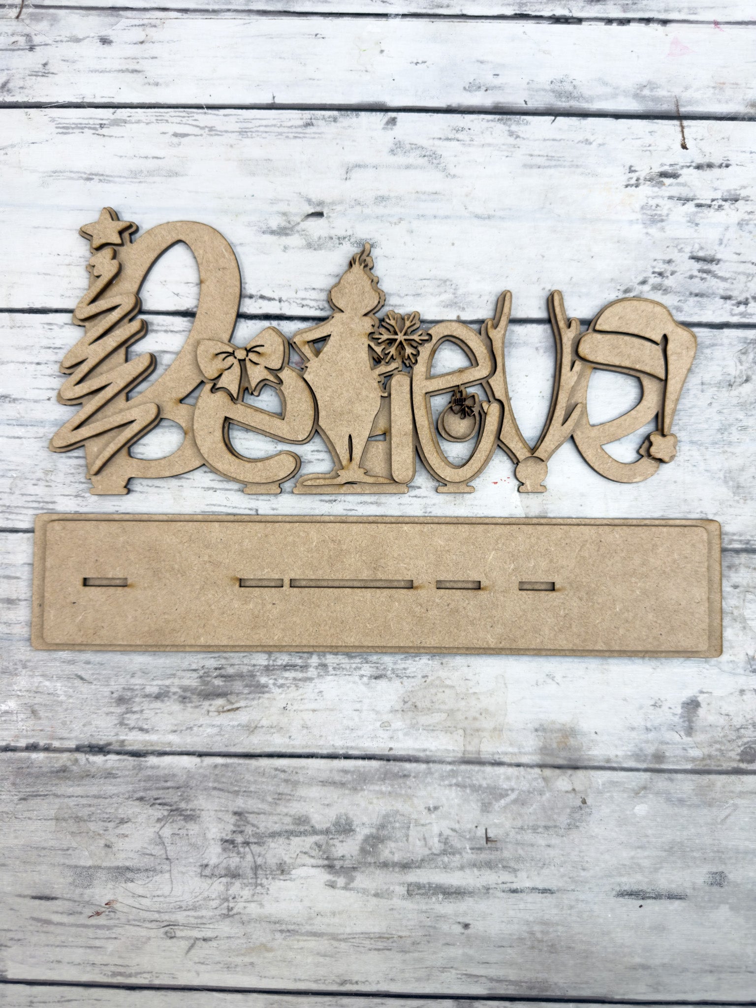 Add a touch of holiday magic to your décor with this Believe Word Sign Sitter! Designed with whimsical details including a Christmas tree, bow, ornaments, Santa hat, and a playful character silhouette, this piece brings farmhouse charm and festive cheer to mantels, shelves, or tiered trays.