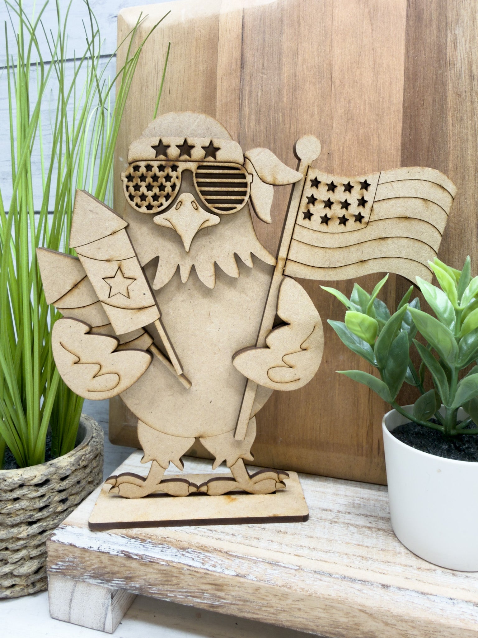 Celebrate freedom and creativity with this bold Eagle Fireworks Flag Sitter DIY Kit! Featuring a patriotic eagle rocking star-spangled sunglasses, holding fireworks and the American flag, this design is full of personality and perfect for summer décor.
