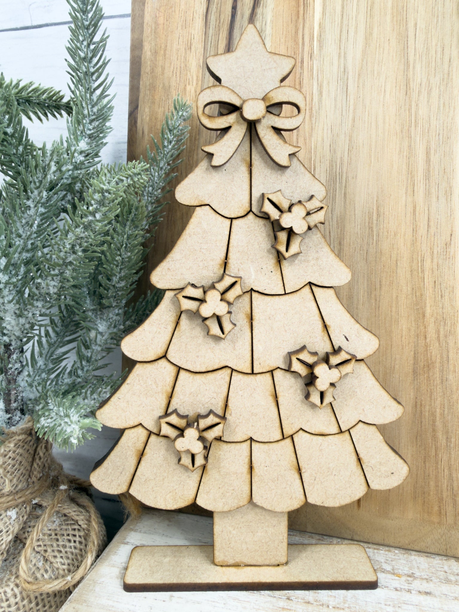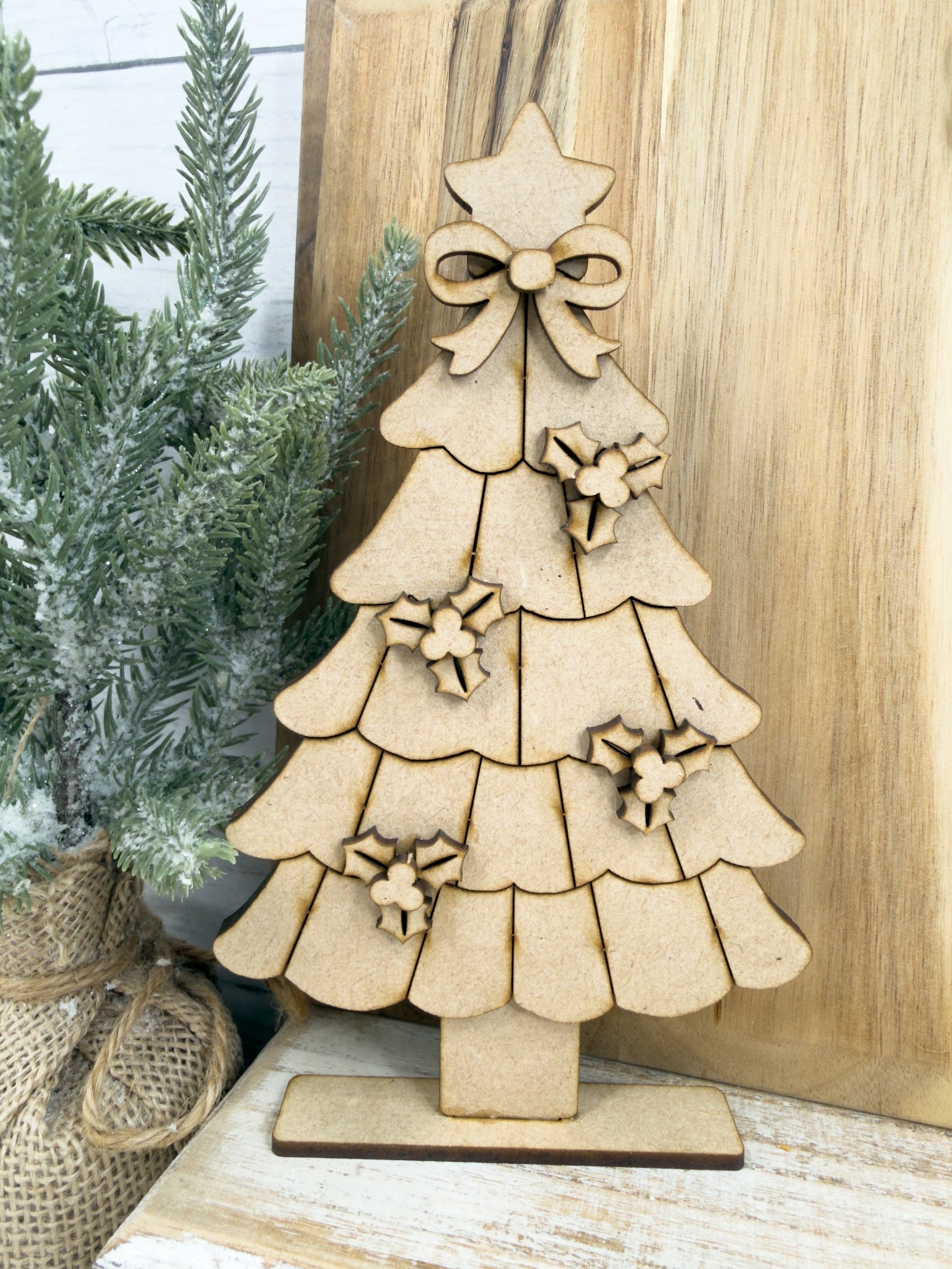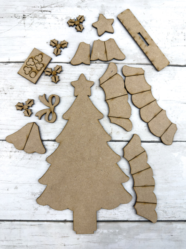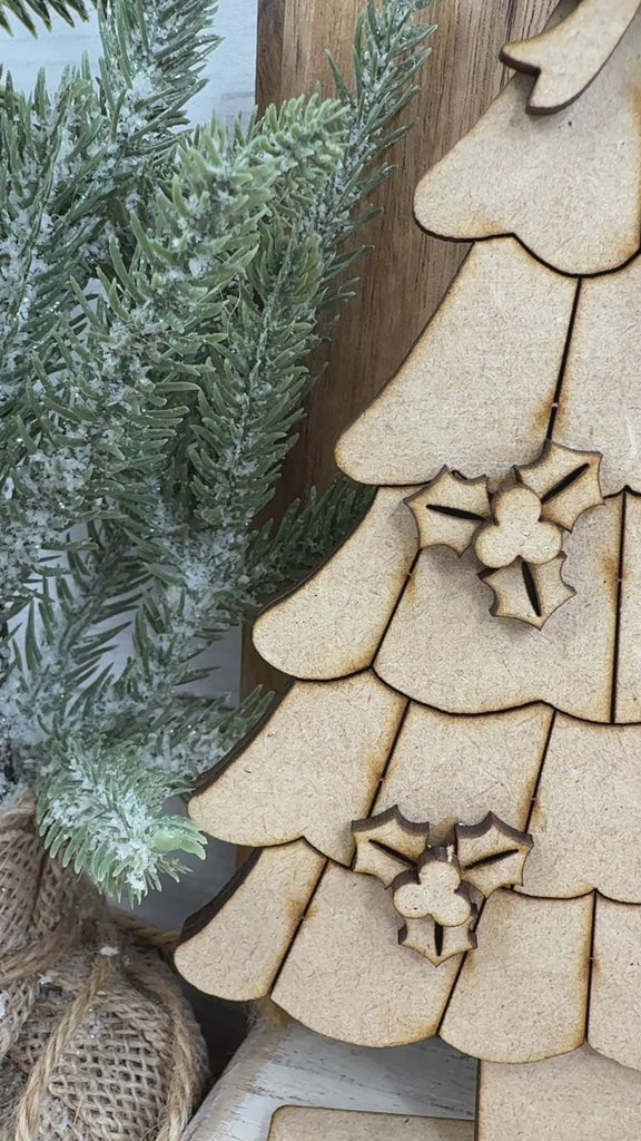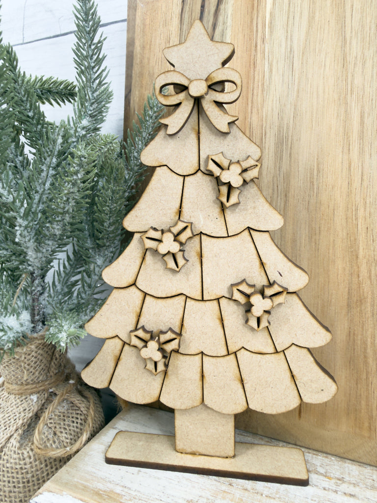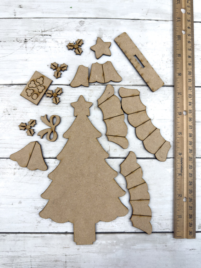 Add a sweet and festive touch to your holiday décor with this Little patchwork Christmas Tree with Berries DIY kit! This layered tree features scalloped branches, holly berry clusters, and a star-and-bow topper — perfect for painting in classic Christmas colors or your own creative style. Great for winter craft nights, vendor booths, workshops, and cozy shelf displays.