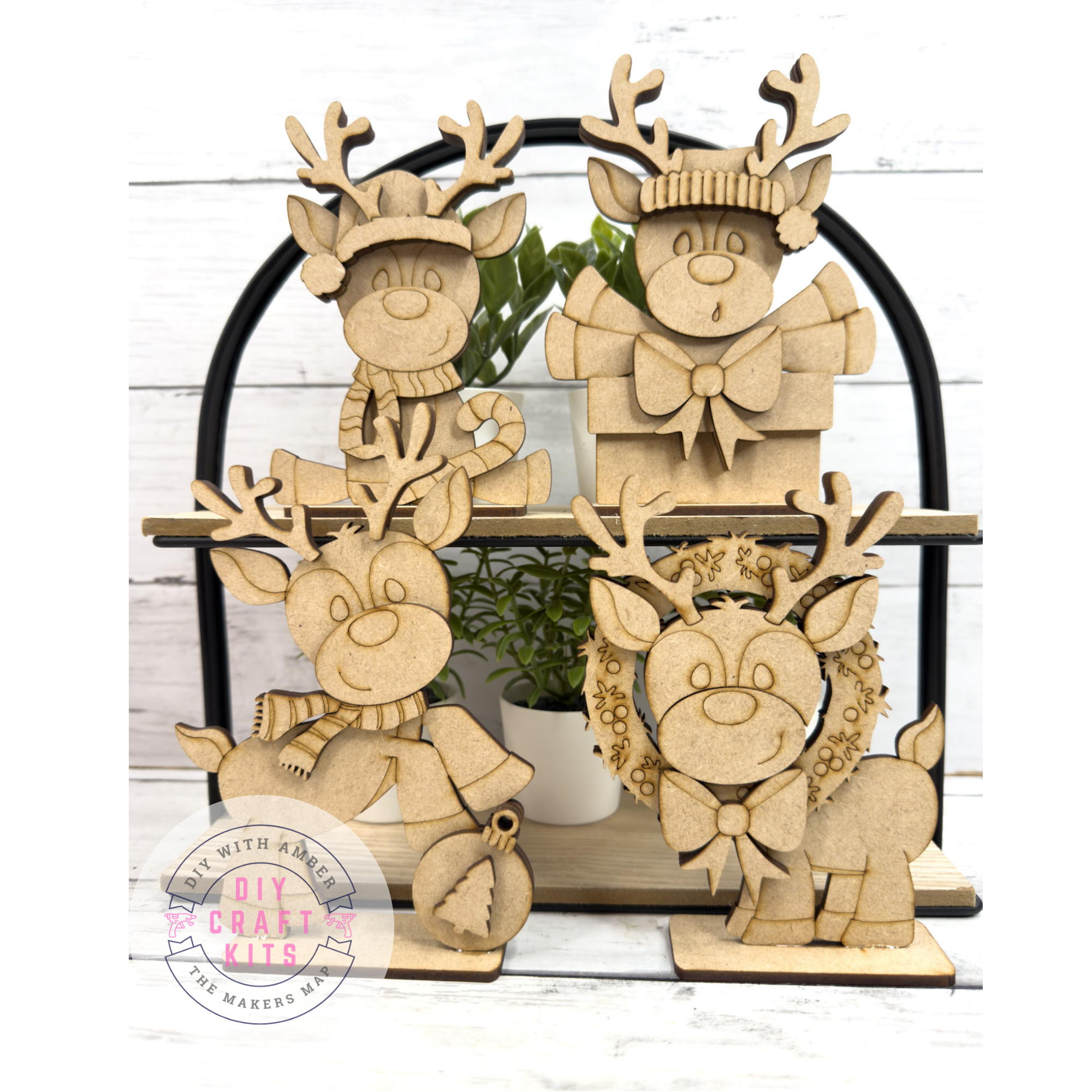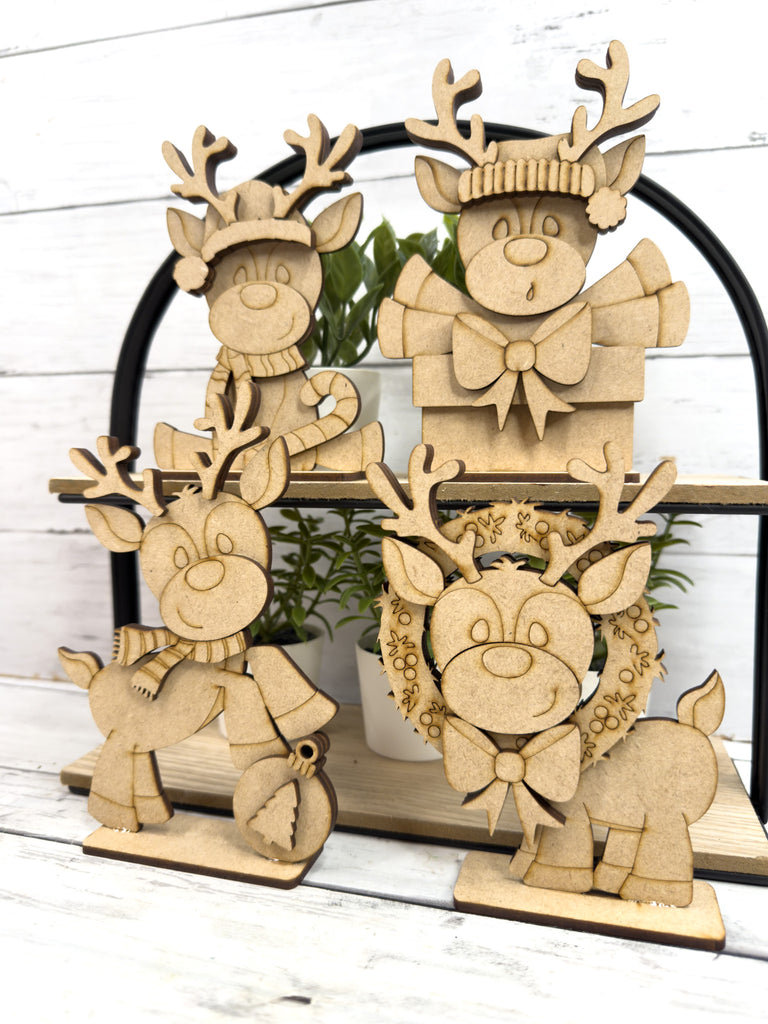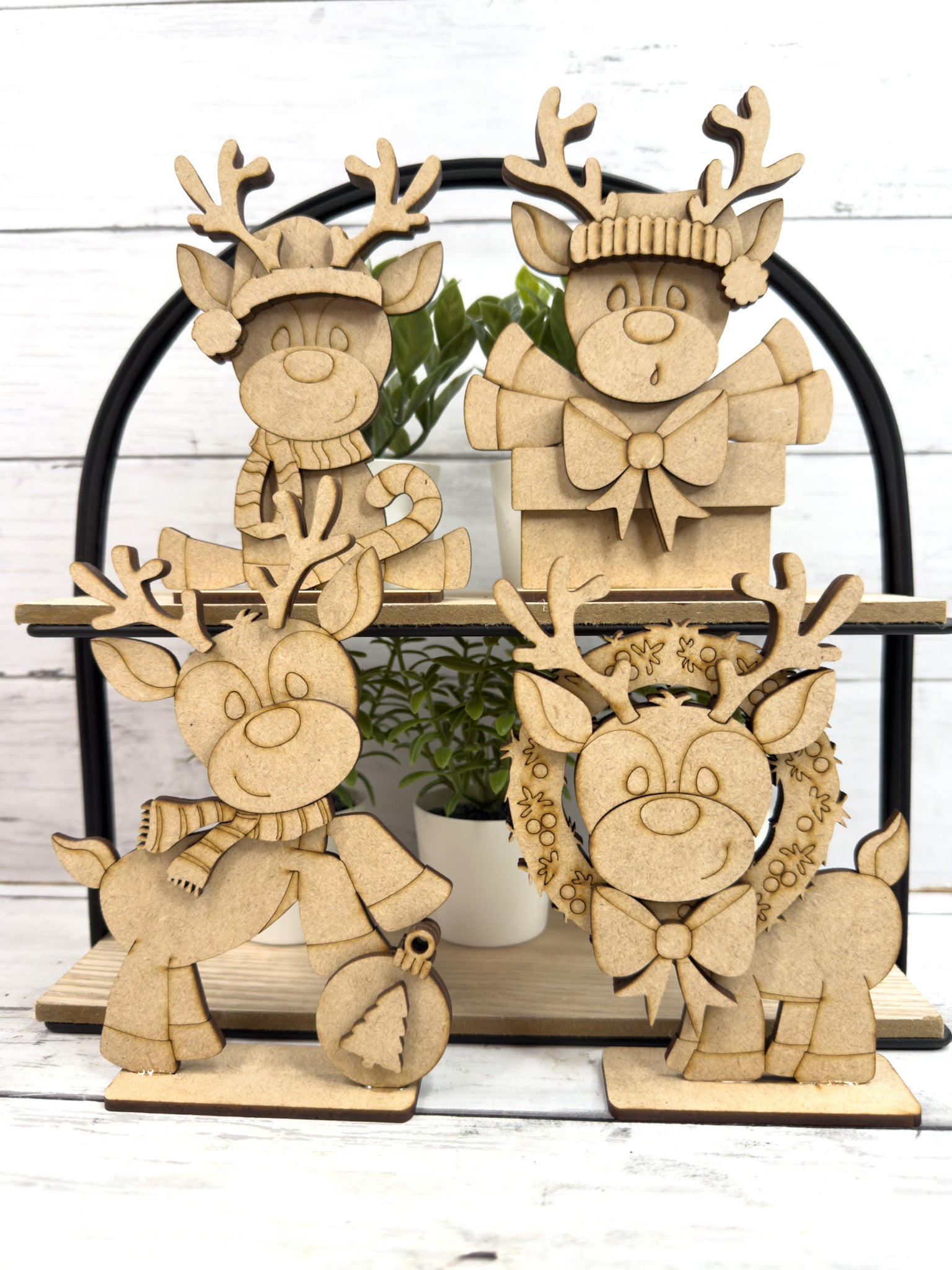 Bring playful holiday spirit to your décor with this adorable Reindeer Christmas Friends set! Featuring four whimsical reindeer, each with unique seasonal details — from cozy scarves and winter hats to gift boxes, ornaments, and a festive wreath — this set is perfect for farmhouse Christmas displays, tiered trays, or handmade gifts.