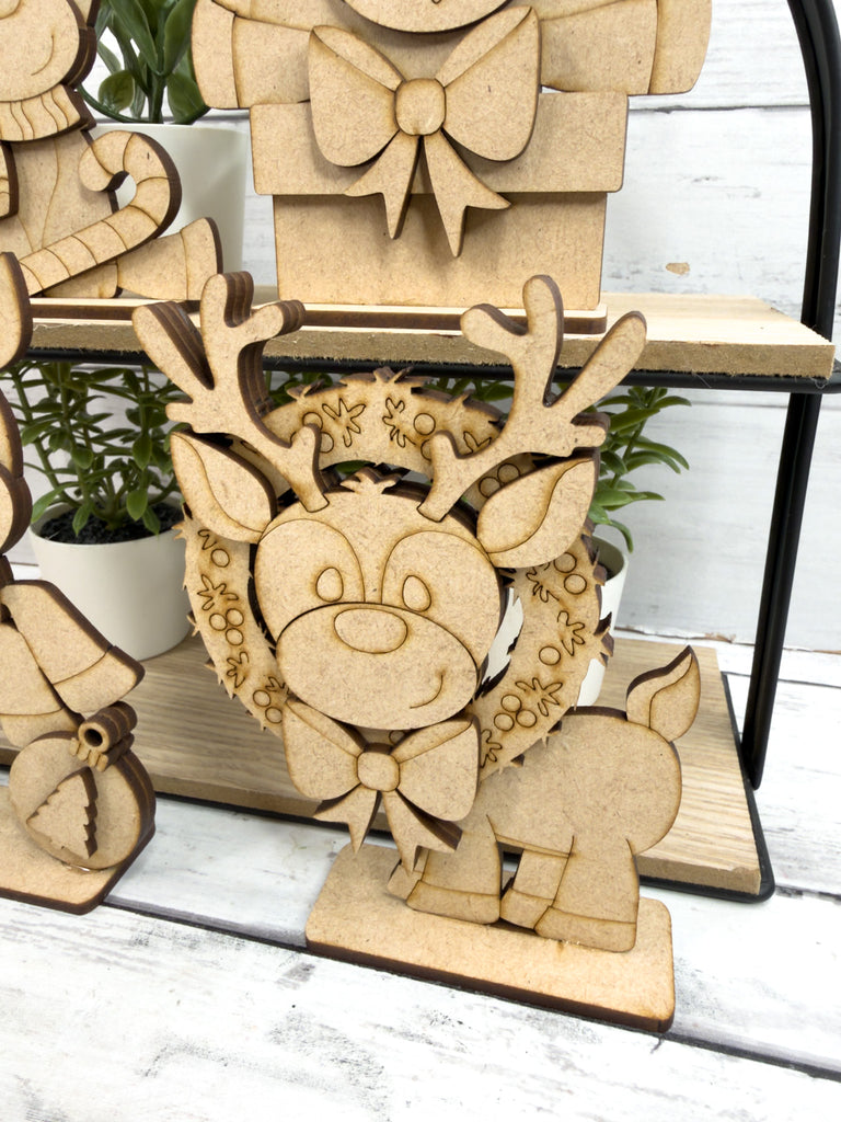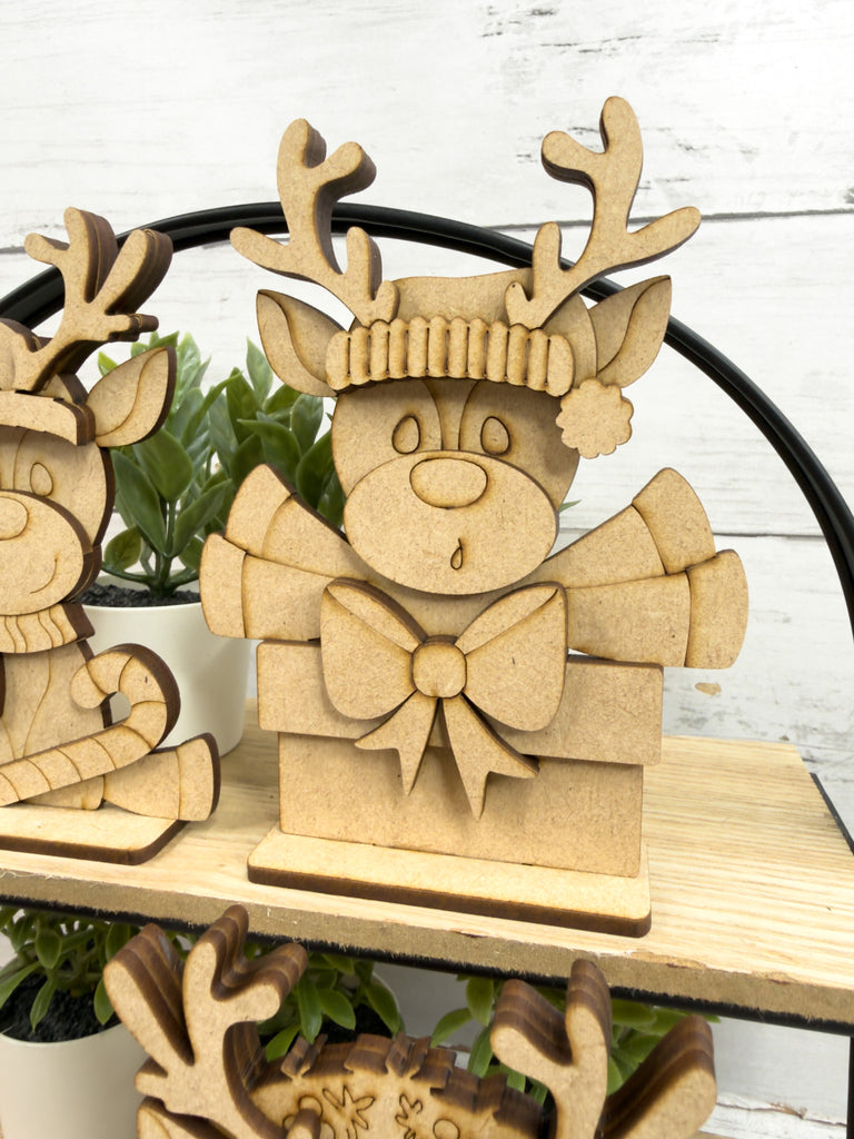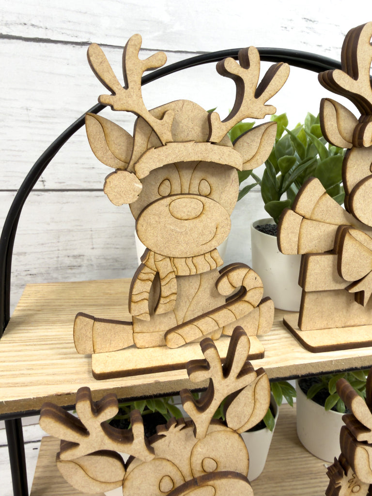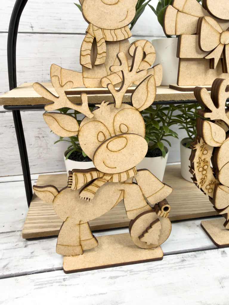 Each figure is laser cut from smooth MDF wood and ships unfinished, ready for you to paint, stain, glitter, or embellish with your own creative touch. These reindeer friends are a fun way to add rustic Christmas charm to your home.