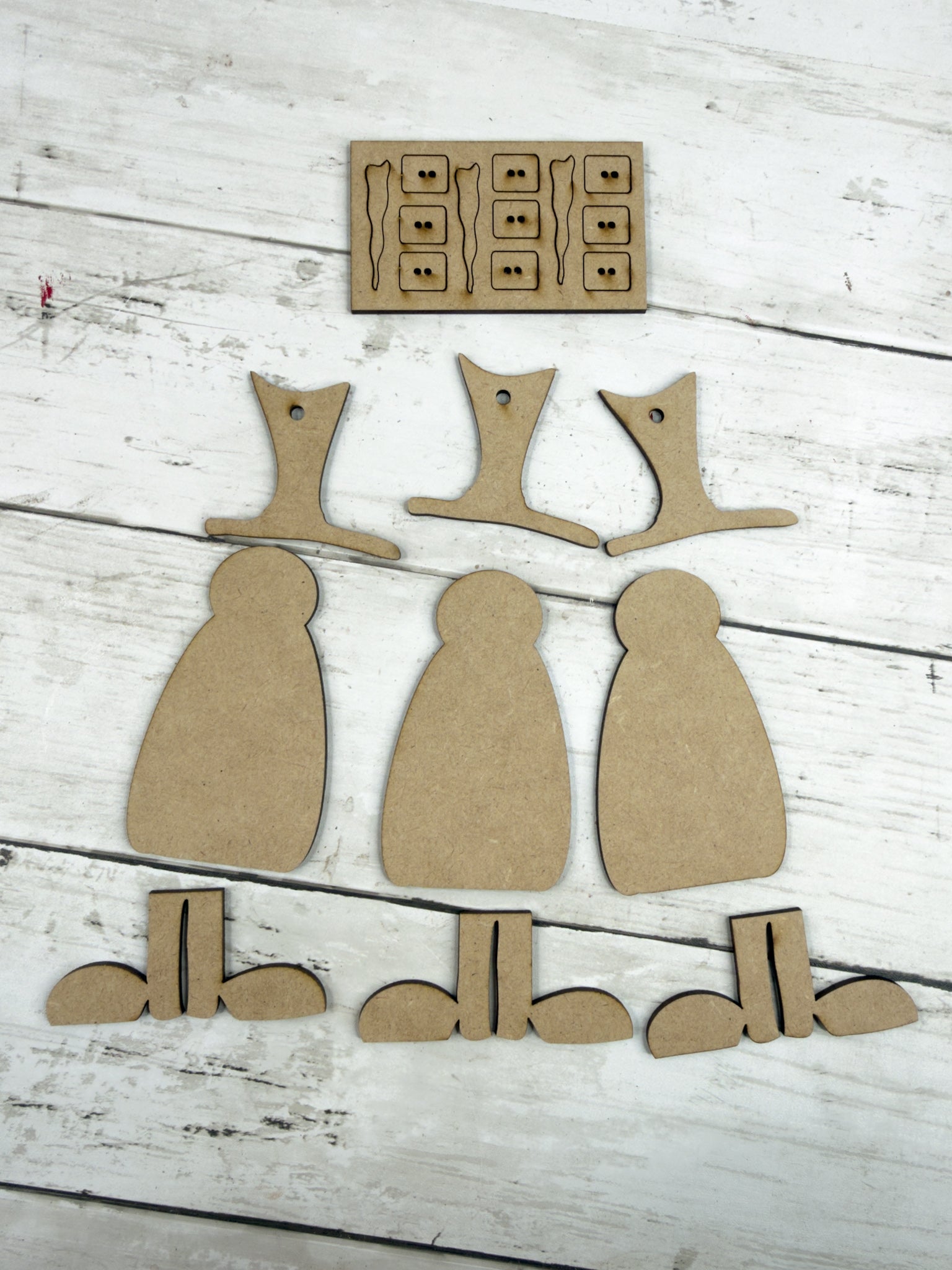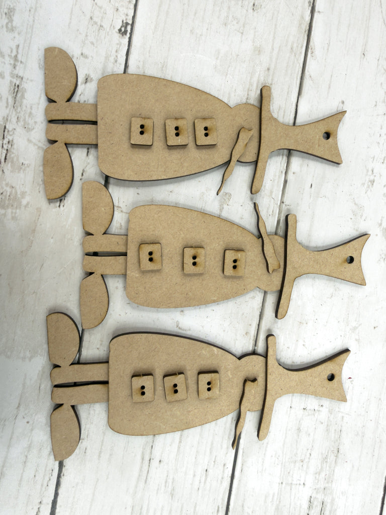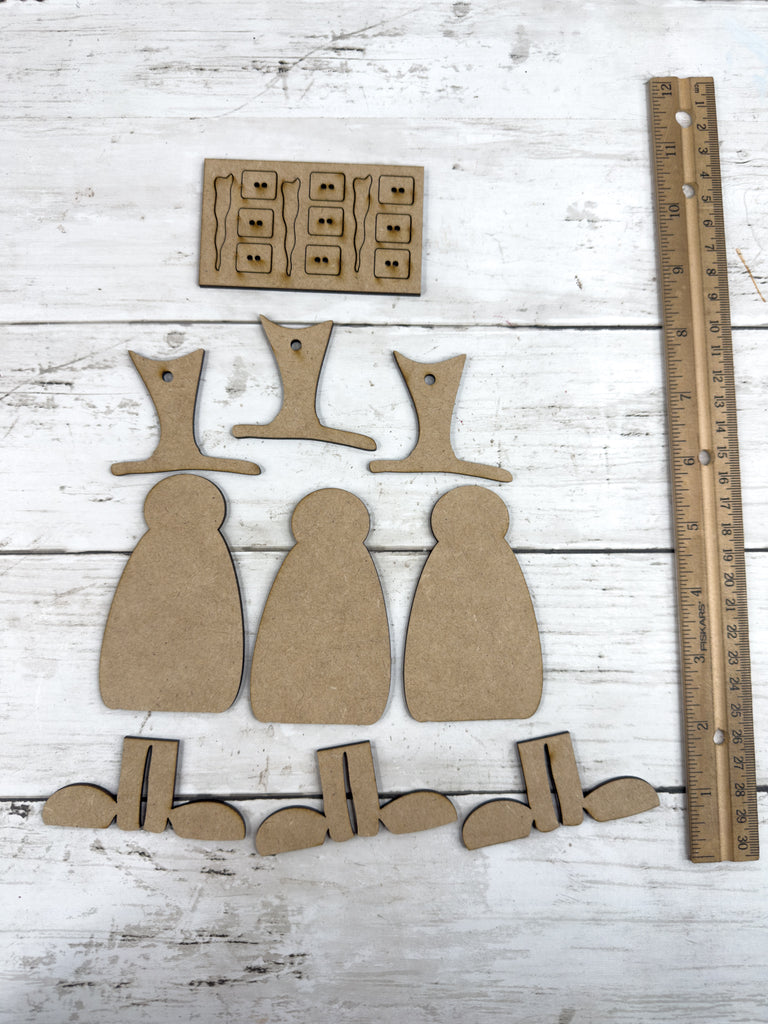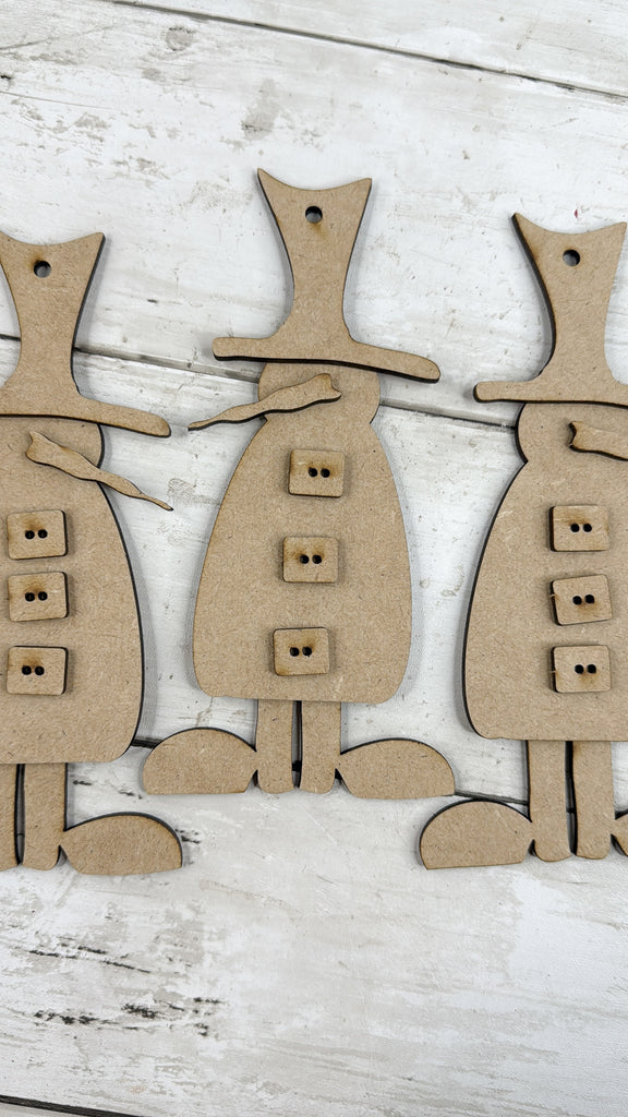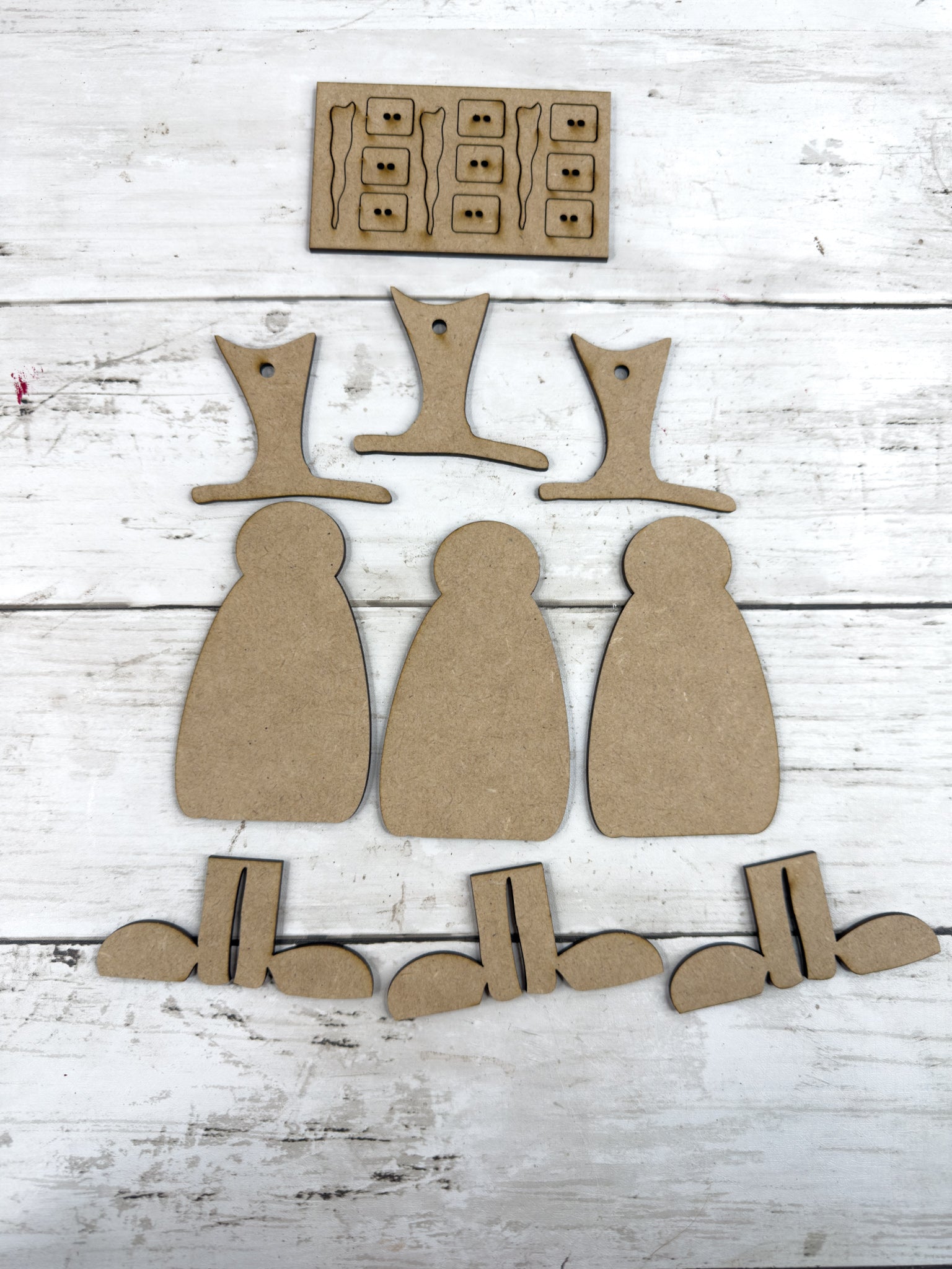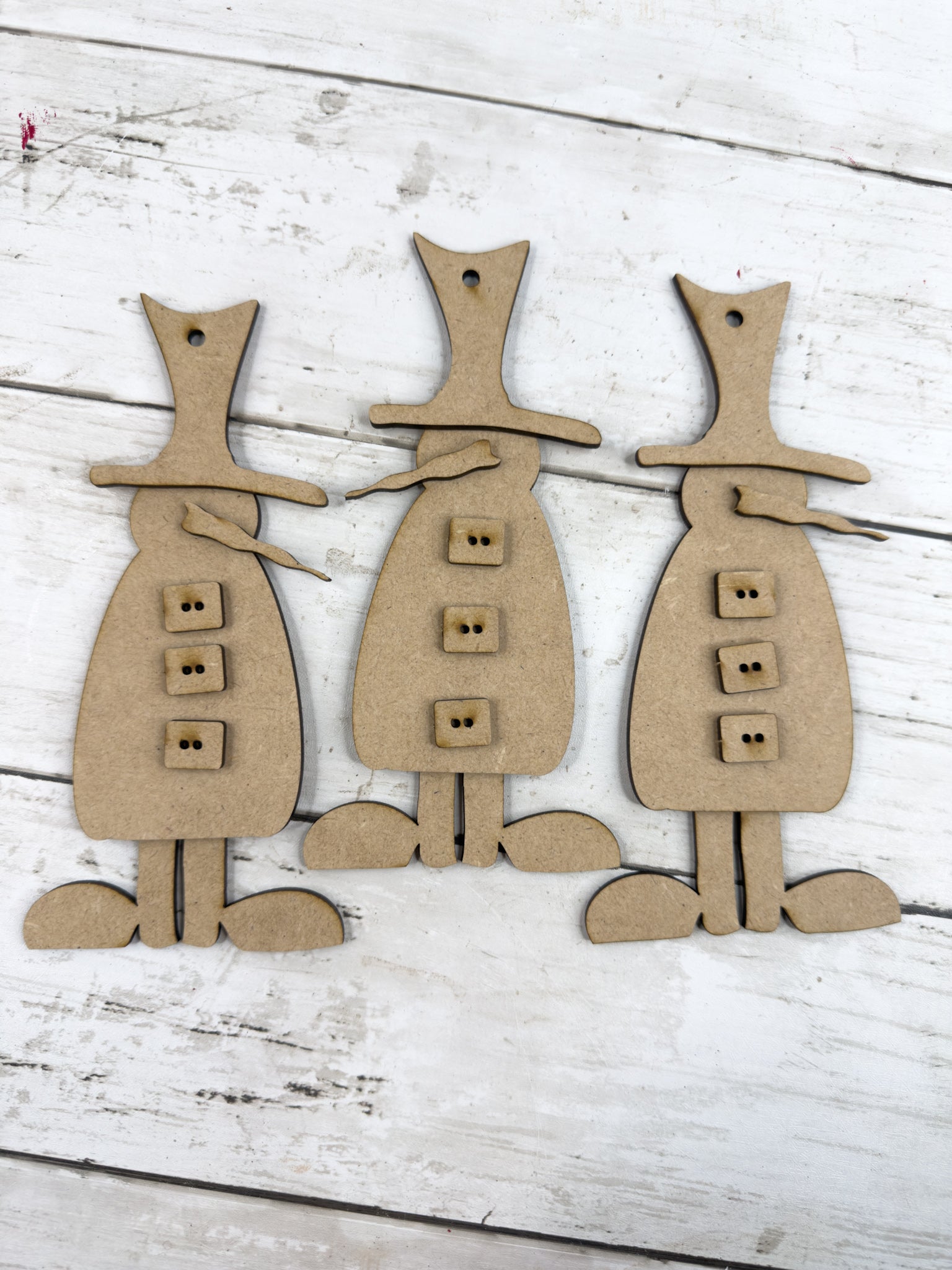 Create a charming set of rustic holiday ornaments with this Three Primitive Snowmen DIY Kit. Each snowman is laser cut from 1/8 inch HDF wood and comes ready for you to paint, stain, or decorate in your own unique style. Their simple shapes, button details, and tall hats give them that classic primitive farmhouse charm—perfect for your Christmas tree, garlands, tiered trays, or handmade gifts.