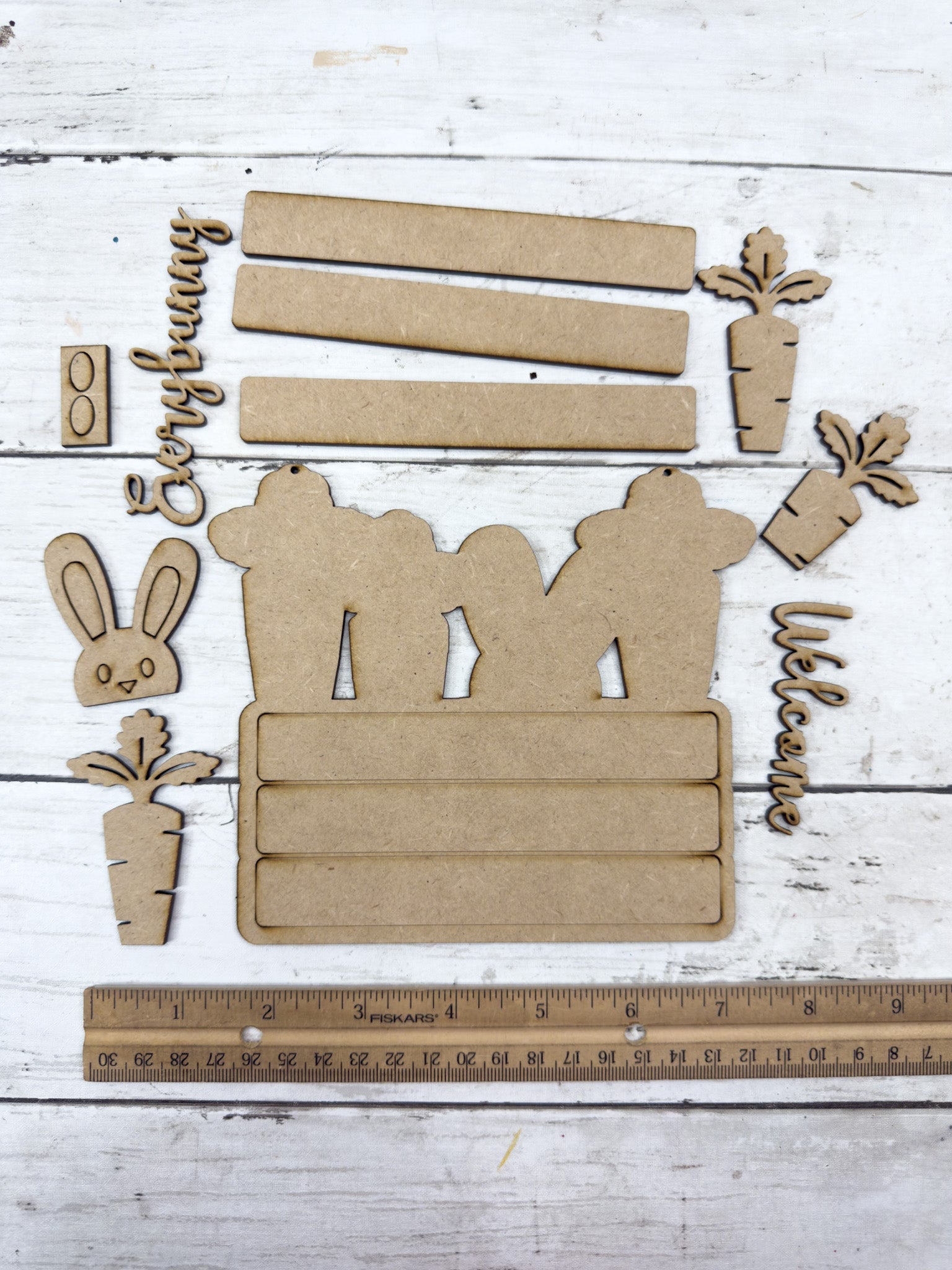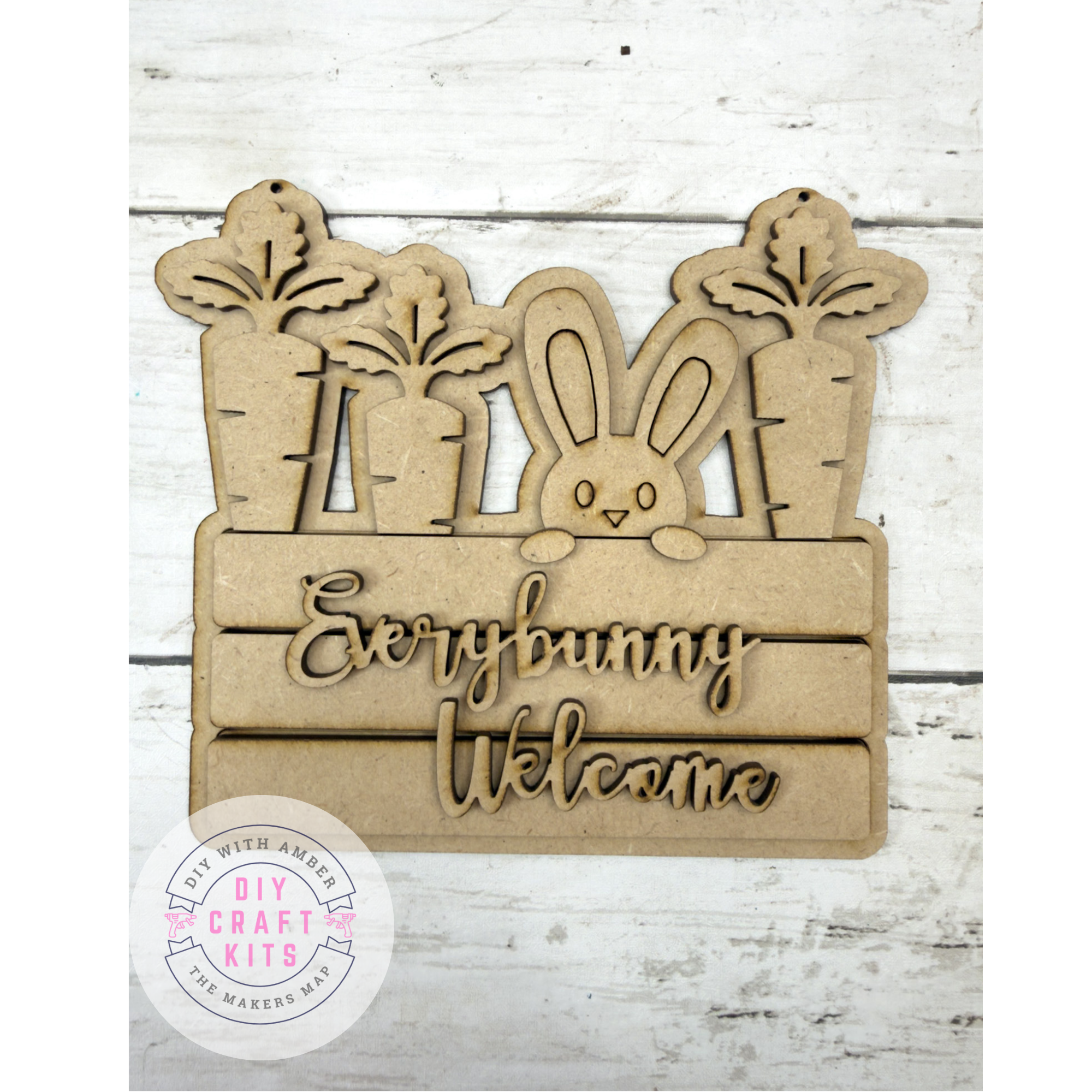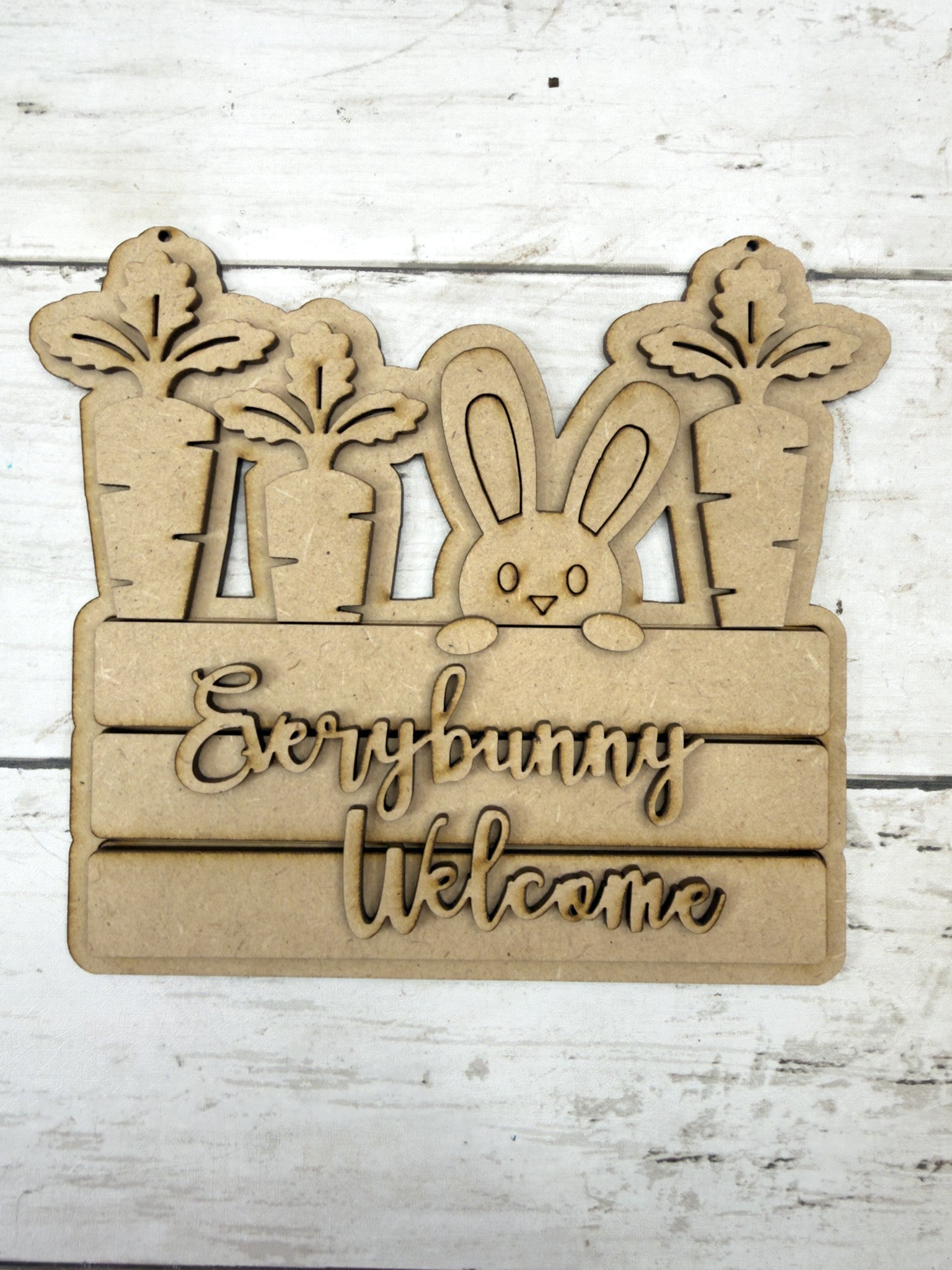 Welcome spring with charm! The Every Bunny Welcome Hanging Sign DIY Kit features a sweet bunny peeking out between carrots with layered lettering, making it a perfect front door or wall accent for Easter and spring décor.