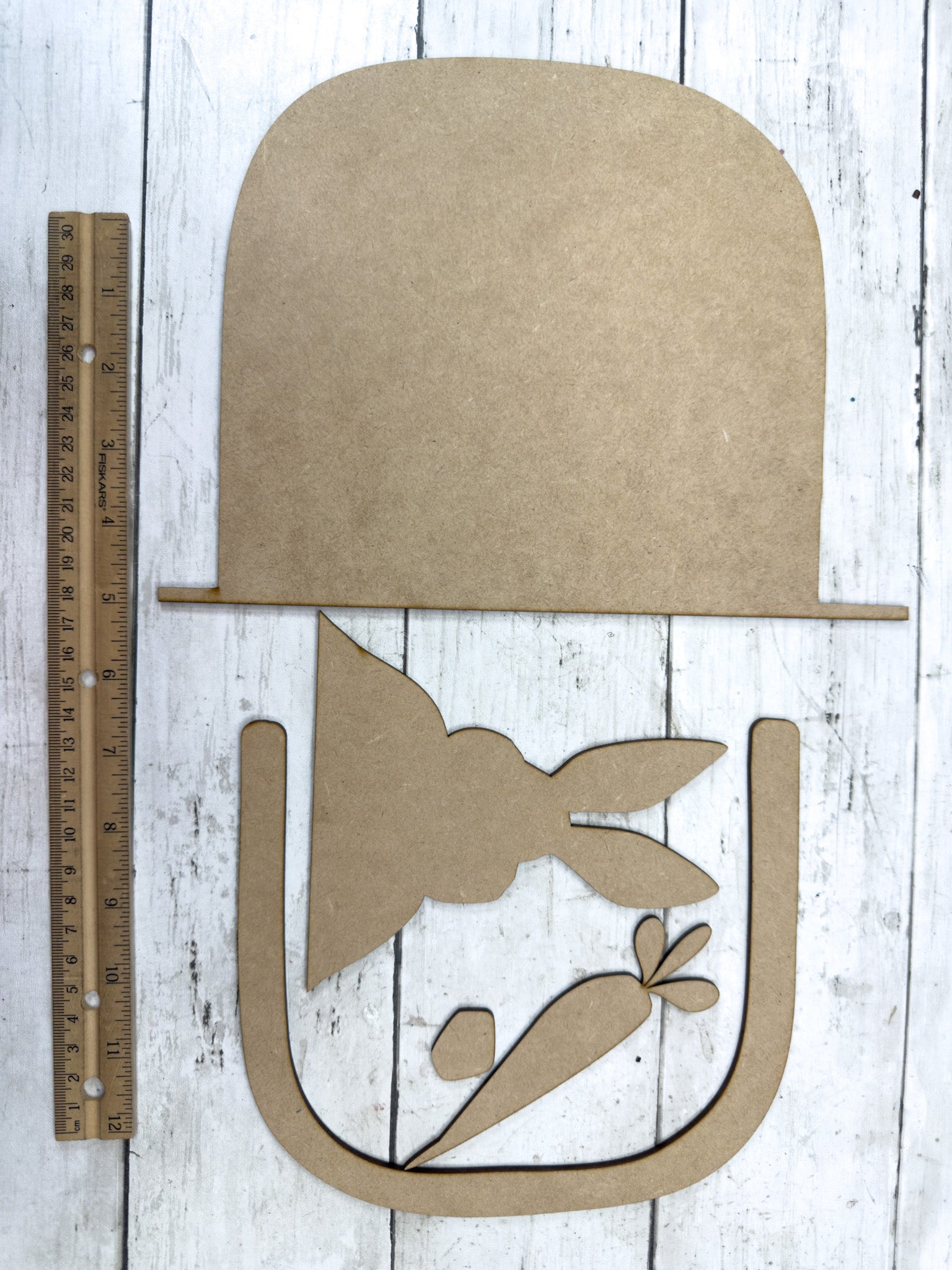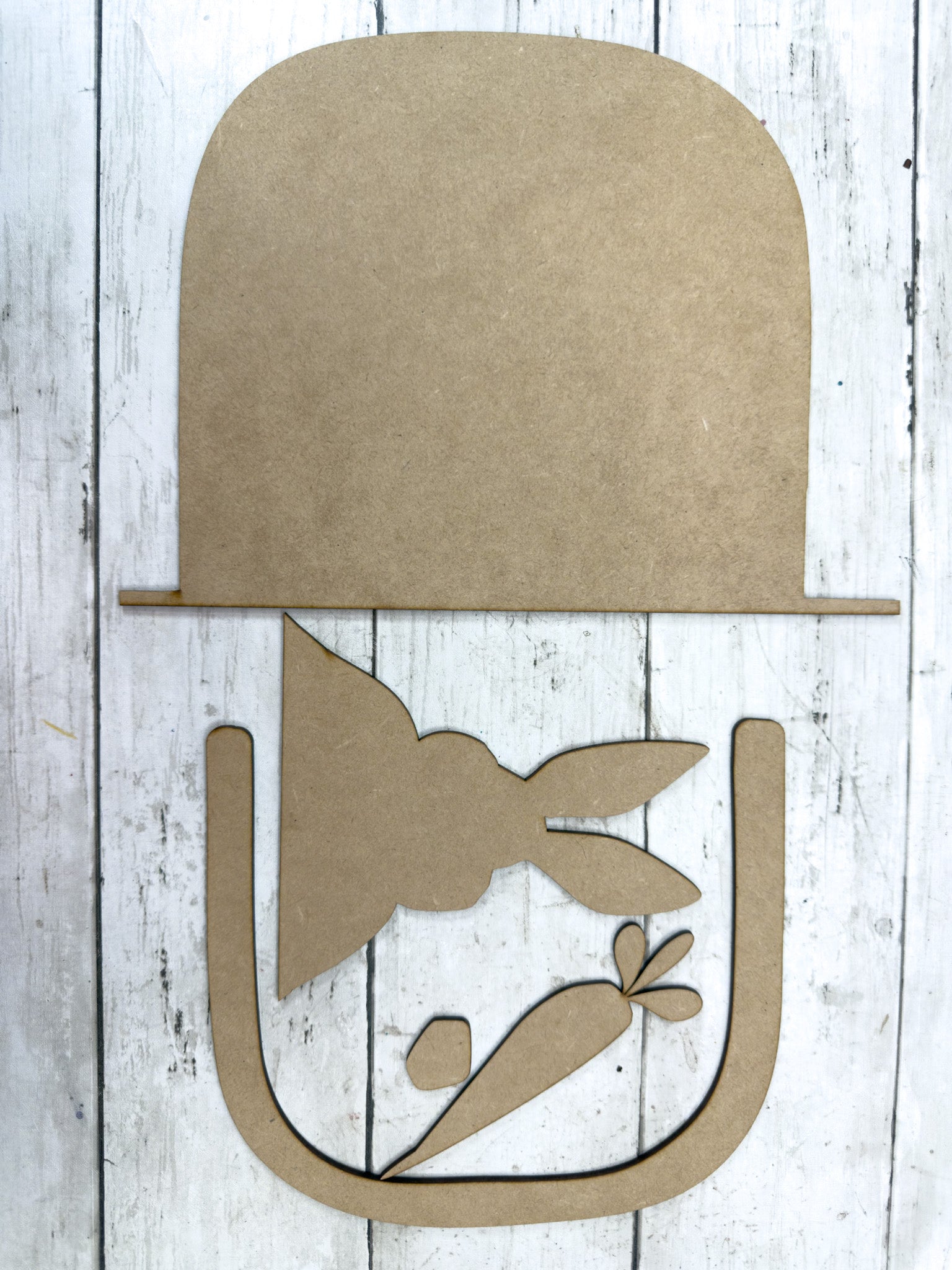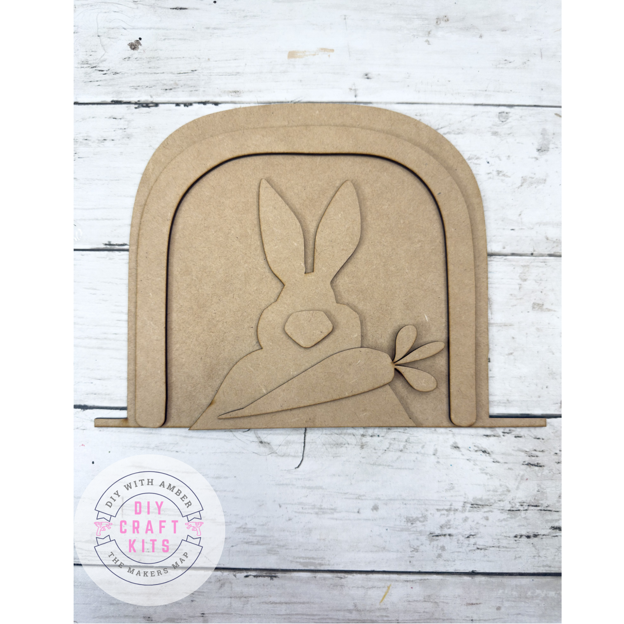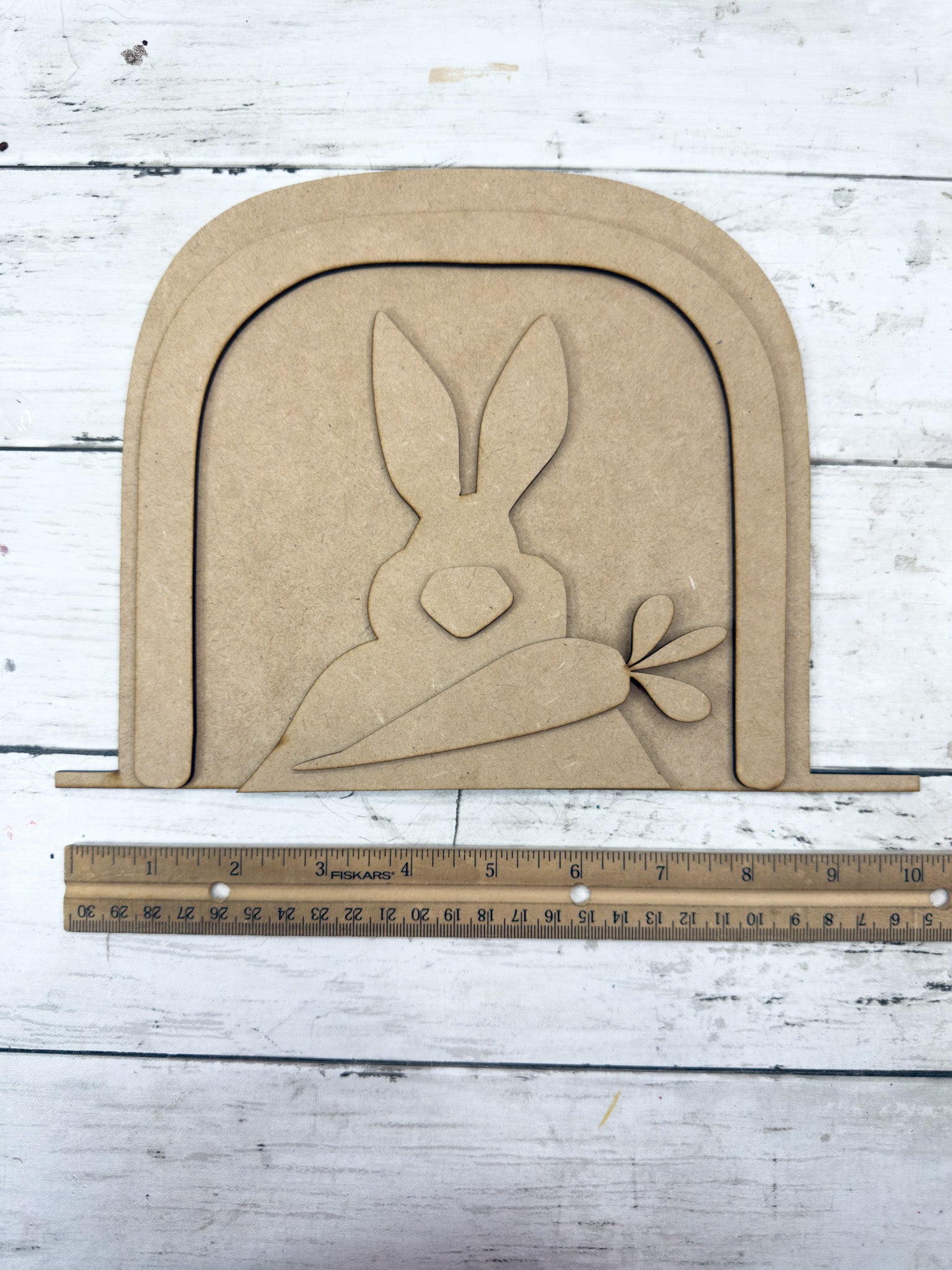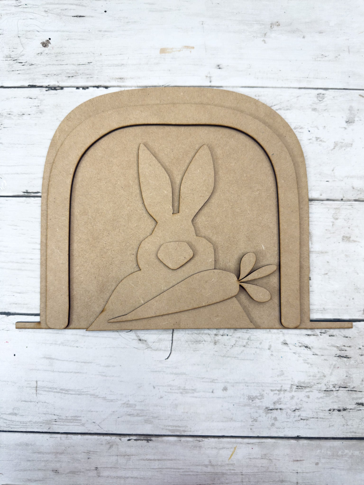 A simple, sweet spring design with cozy farmhouse charm. The Framed Primitive Bunny DIY Kit features a layered bunny silhouette holding a carrot, framed in a soft arched window shape—perfect for Easter and spring decorating.