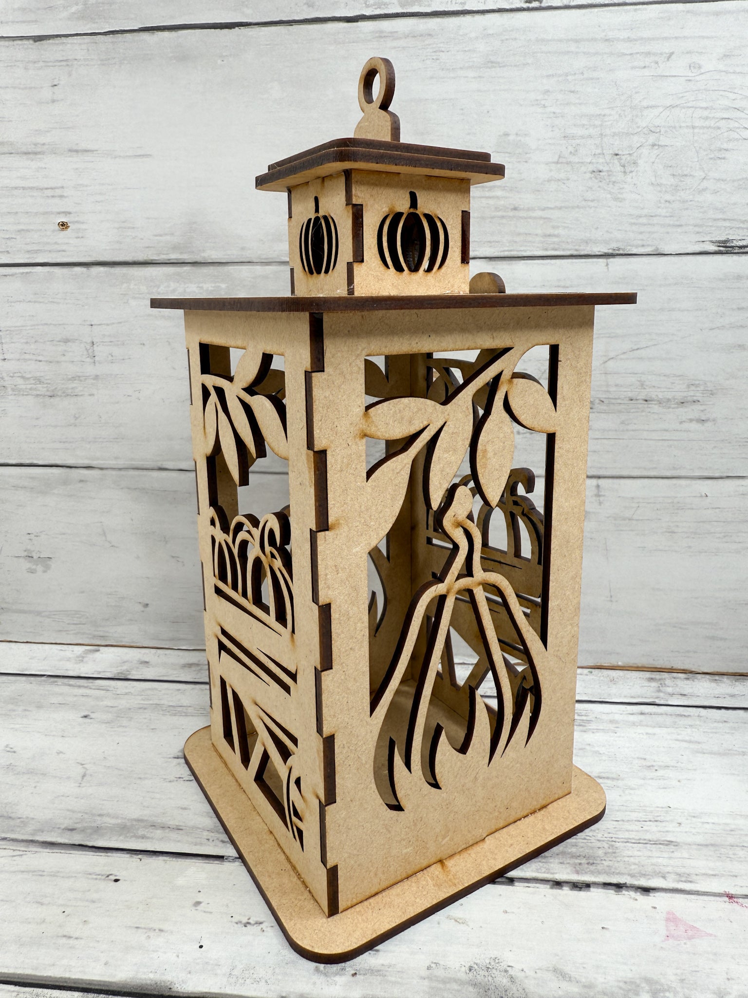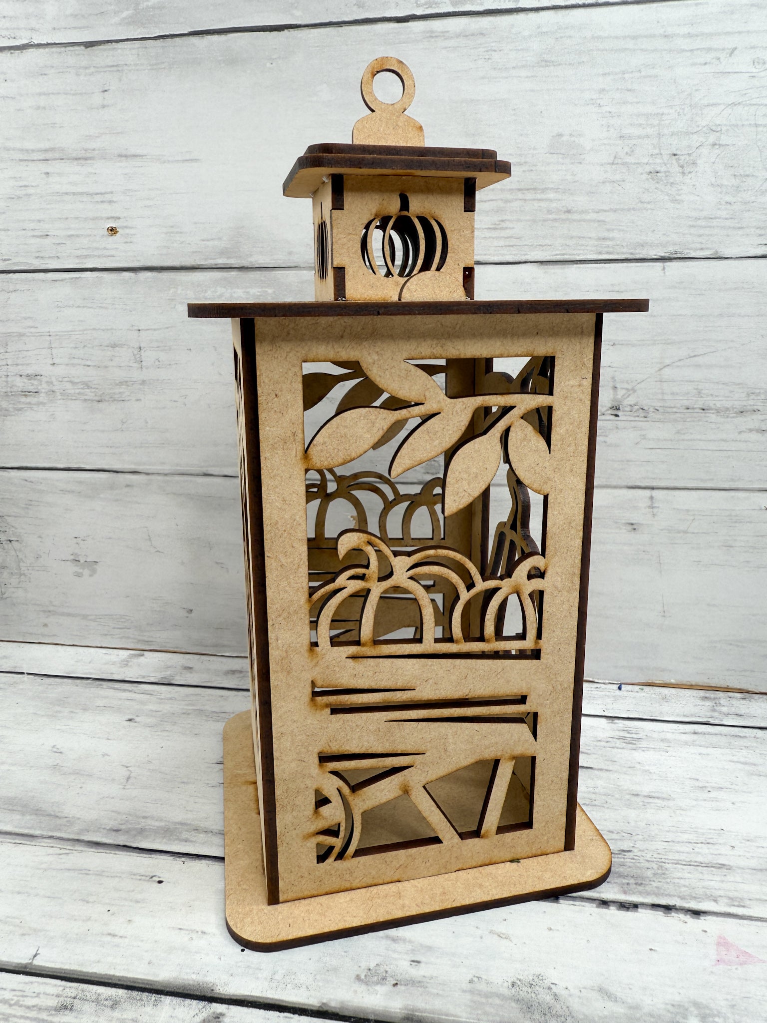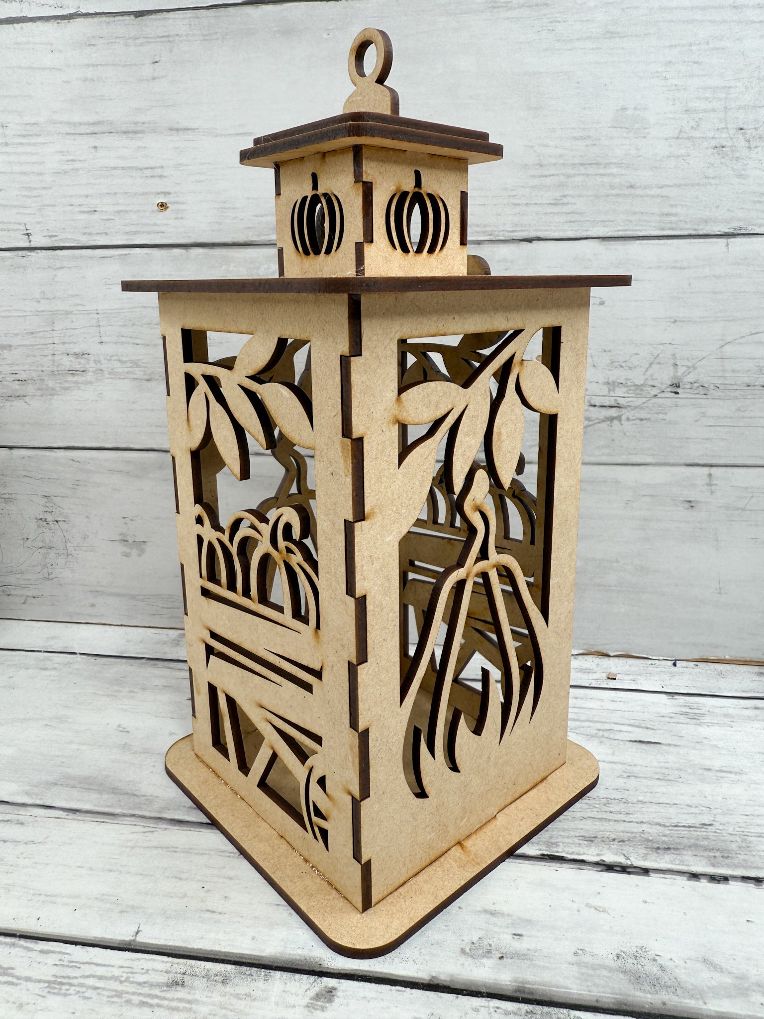 This unfinished wood craft kit features a beautifully detailed lantern design with pumpkins and a wheelbarrow cut into each panel. Made from smooth laser cut HDF wood, it ships flat and is easy to assemble, paint, and decorate. The lantern is lightweight yet sturdy, perfect for tiered trays, shelves, mantels, or as a unique autumn centerpiece.