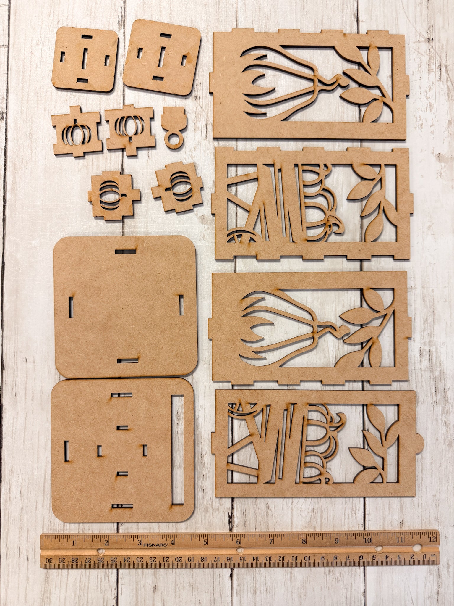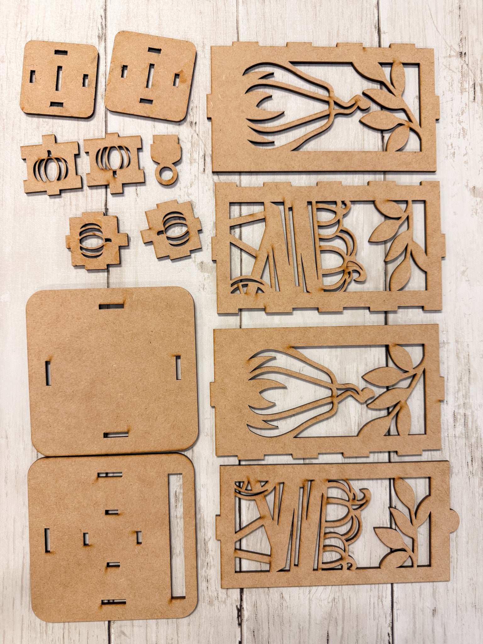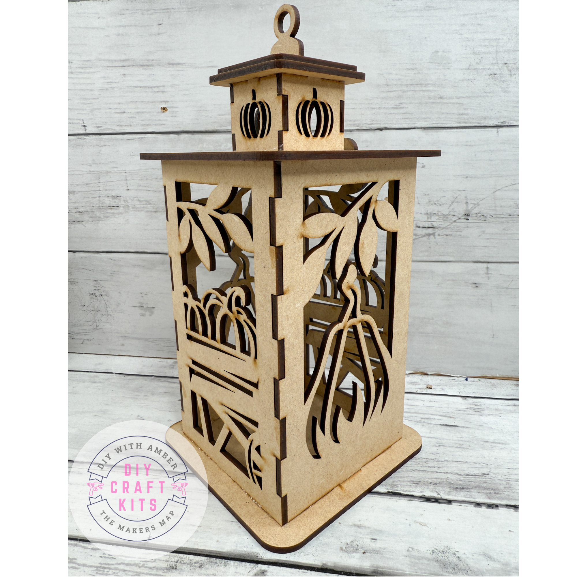 This unfinished wood craft kit features a beautifully detailed lantern design with pumpkins and a wheelbarrow cut into each panel. Made from smooth laser cut HDF wood, it ships flat and is easy to assemble, paint, and decorate. The lantern is lightweight yet sturdy, perfect for tiered trays, shelves, mantels, or as a unique autumn centerpiece.