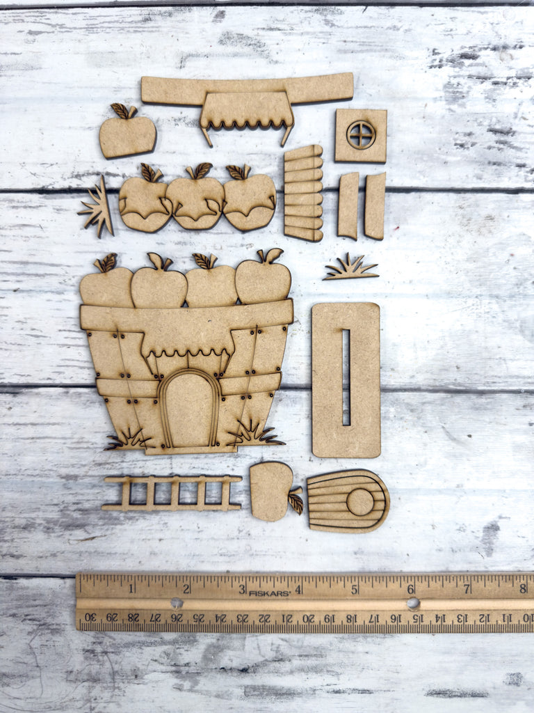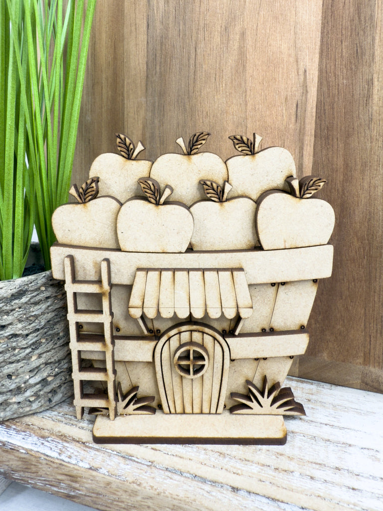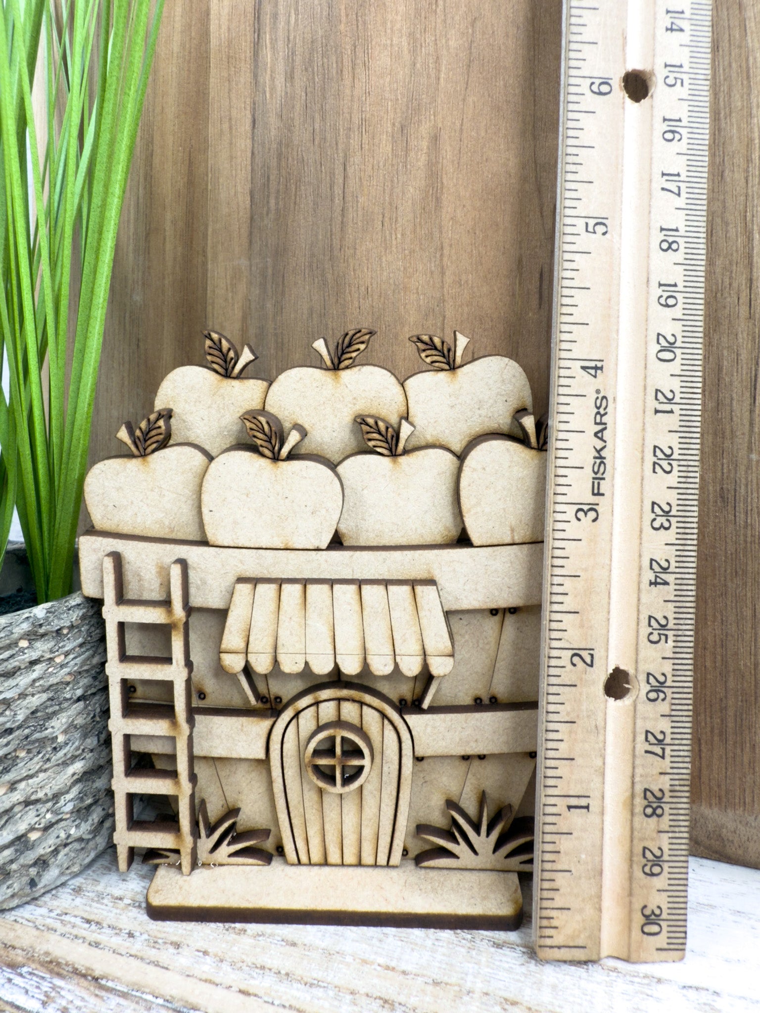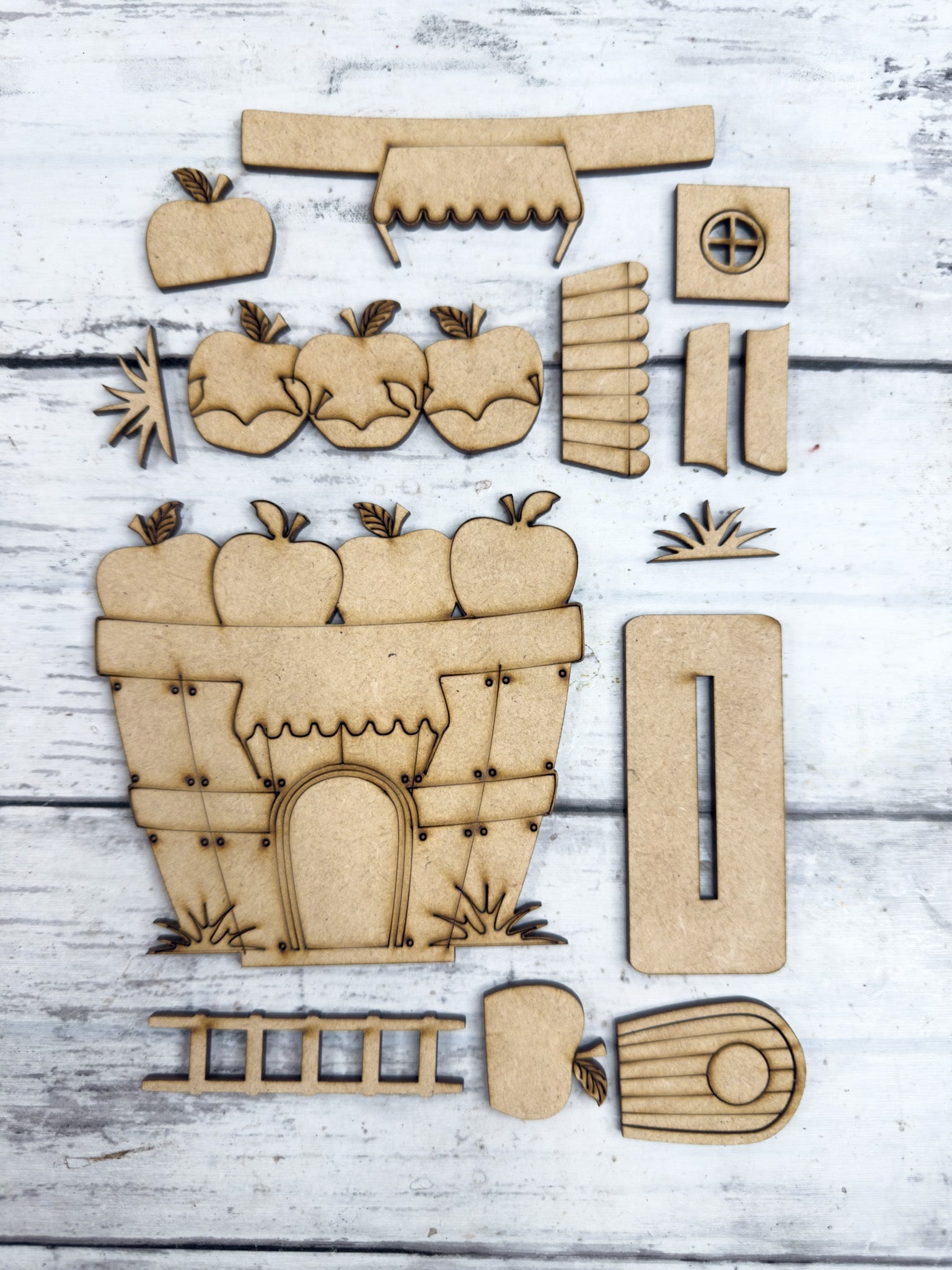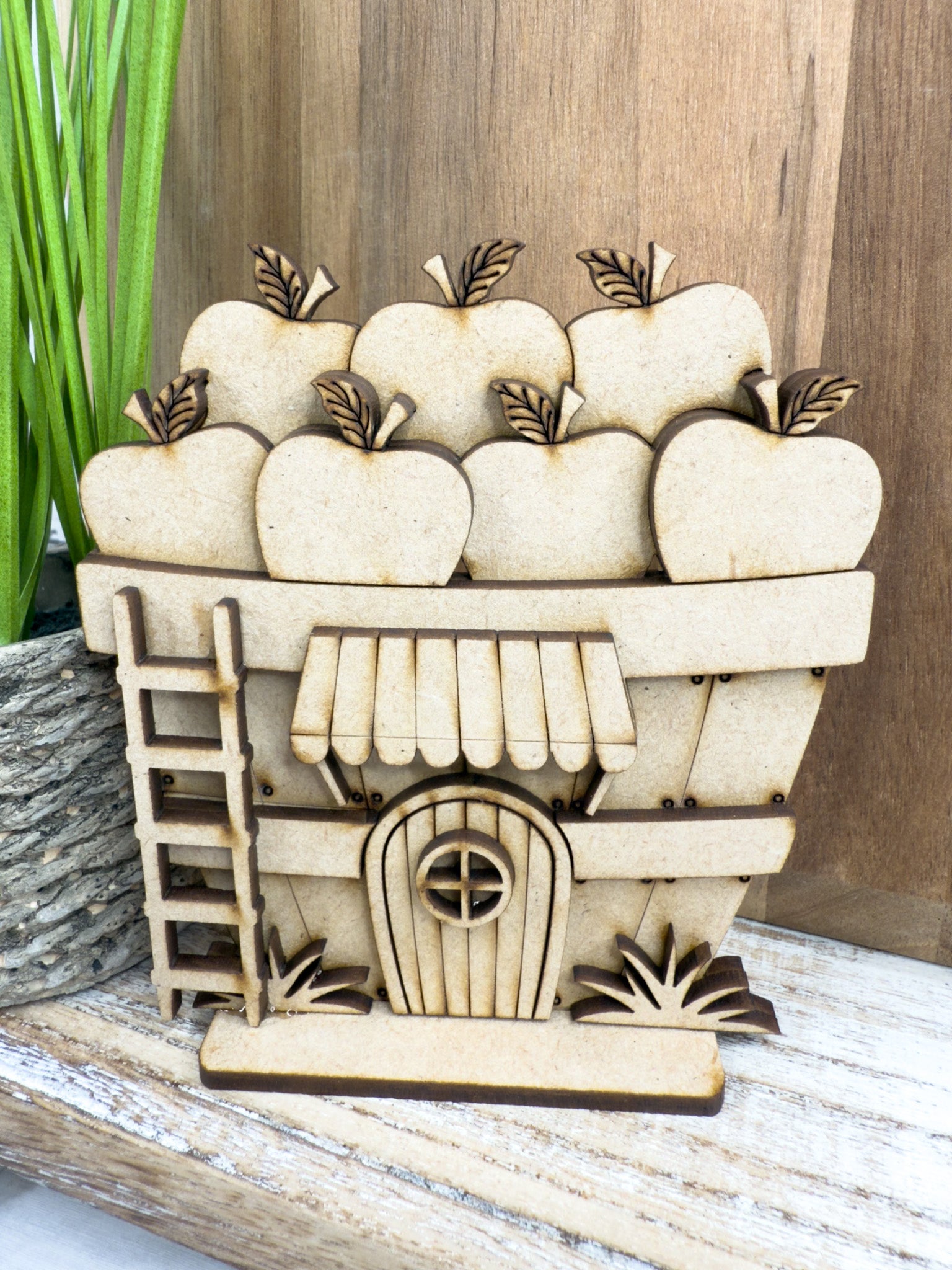This unfinished laser cut wood craft kit features a whimsical basket brimming with apples, complete with a tiny house door, ladder, and awning. Perfect for painting, staining, or embellishing with your own creative flair, this kit is designed for crafters of all ages.