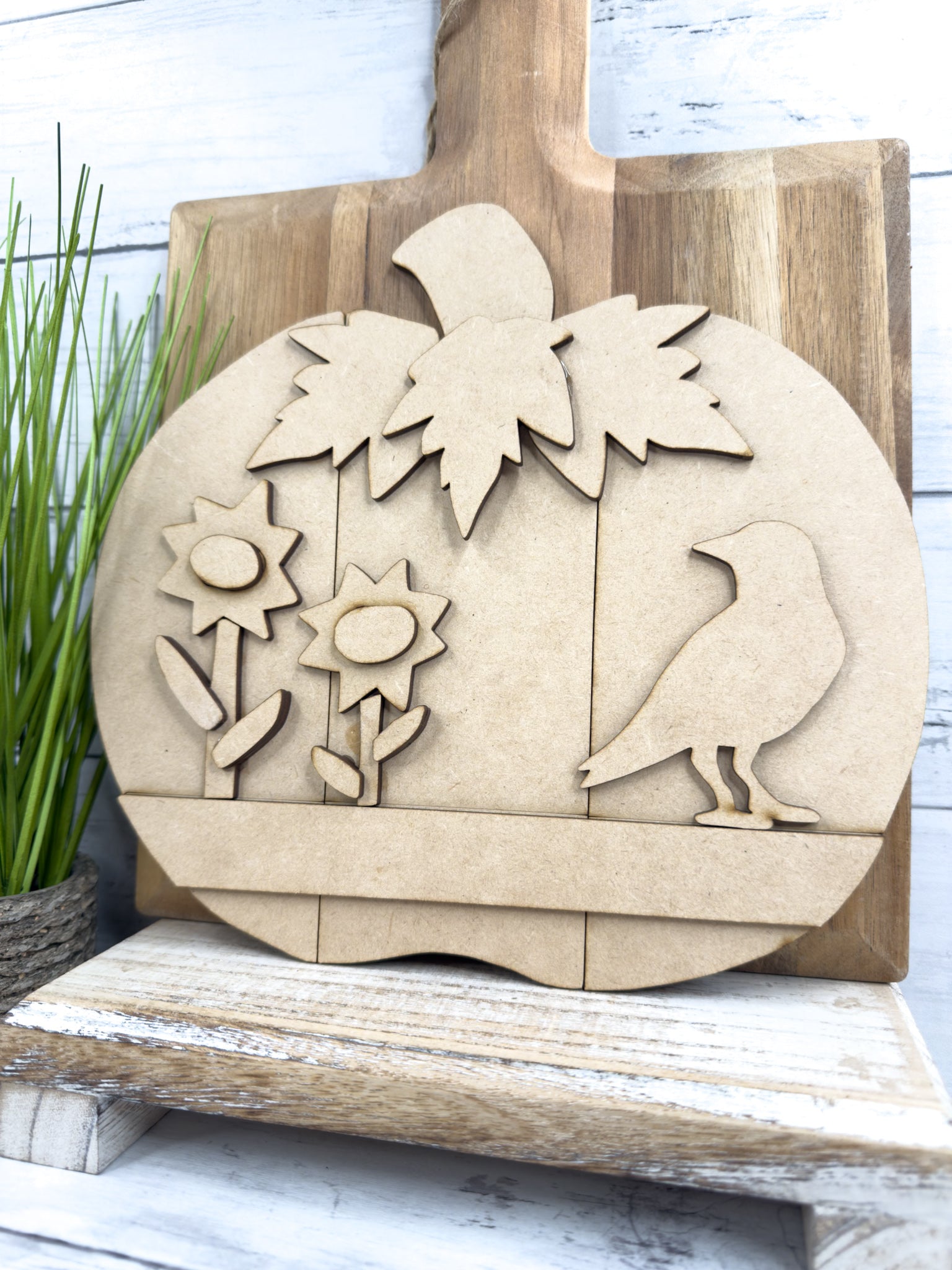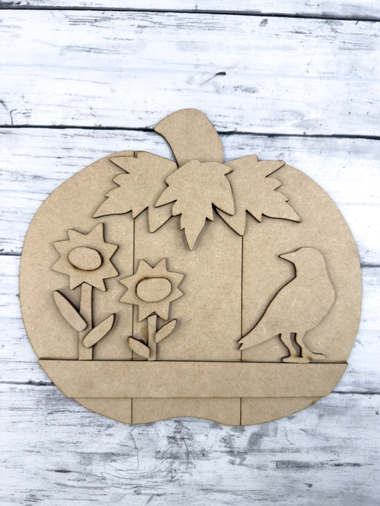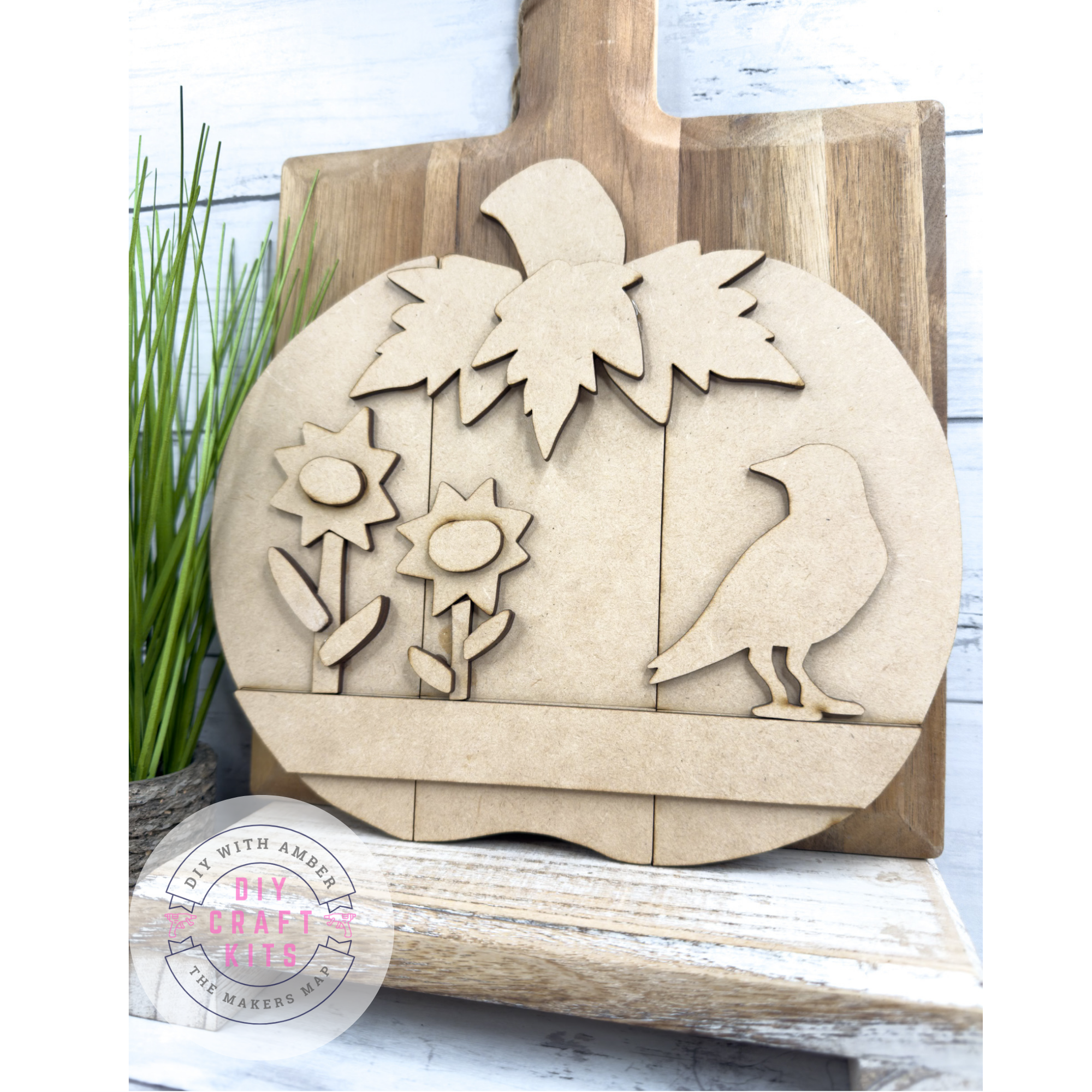 This plank pumpkin is paired with a crow and flowers DIY Craft Kit would make adorable harvest decor.