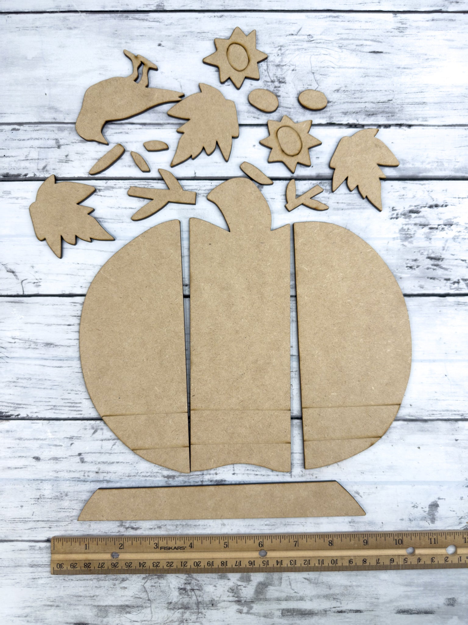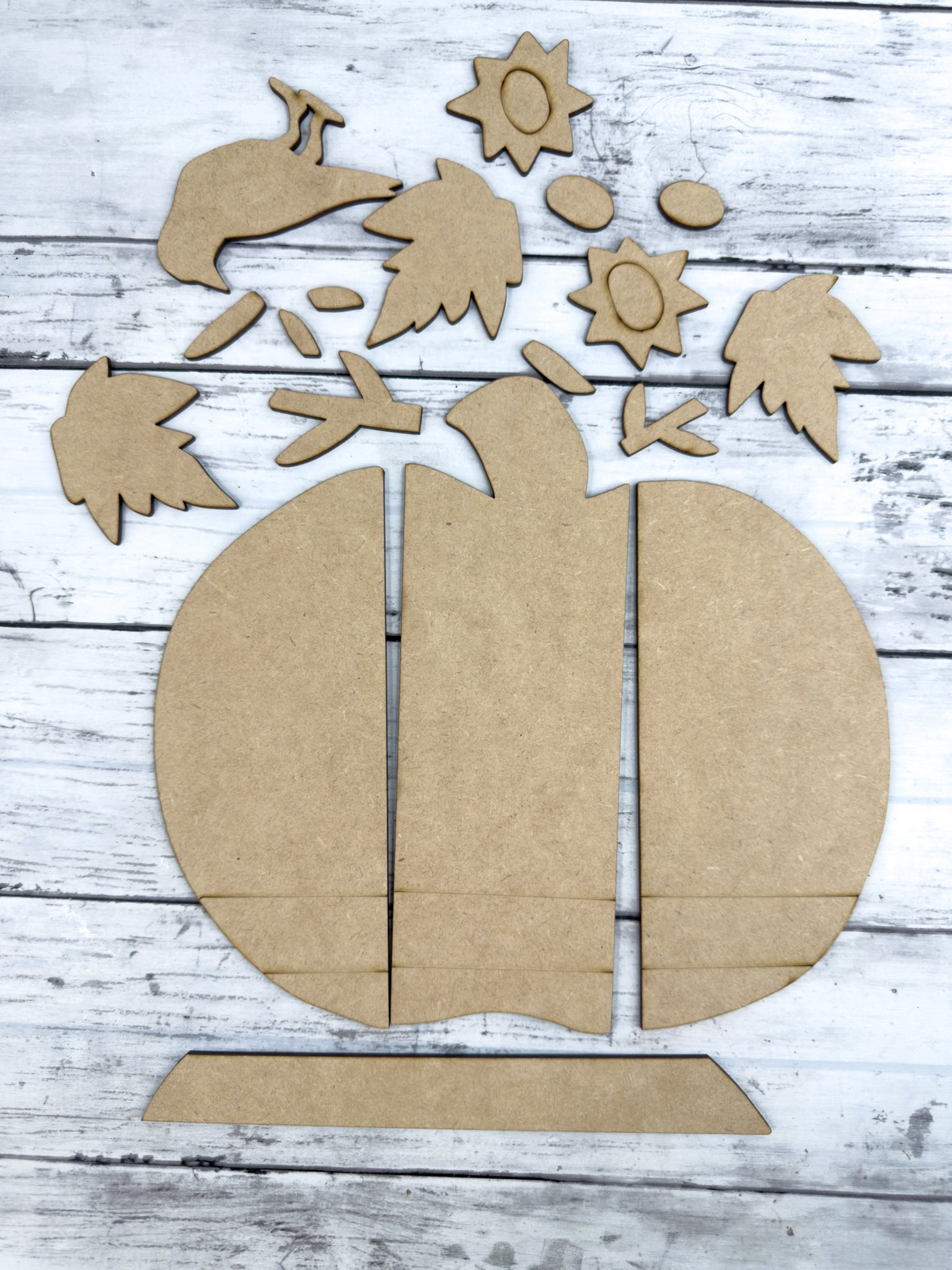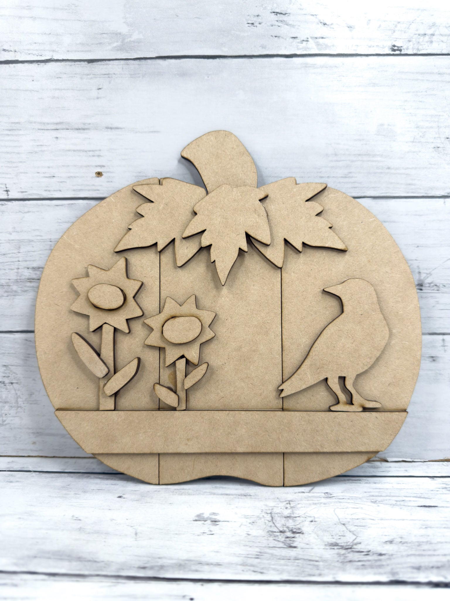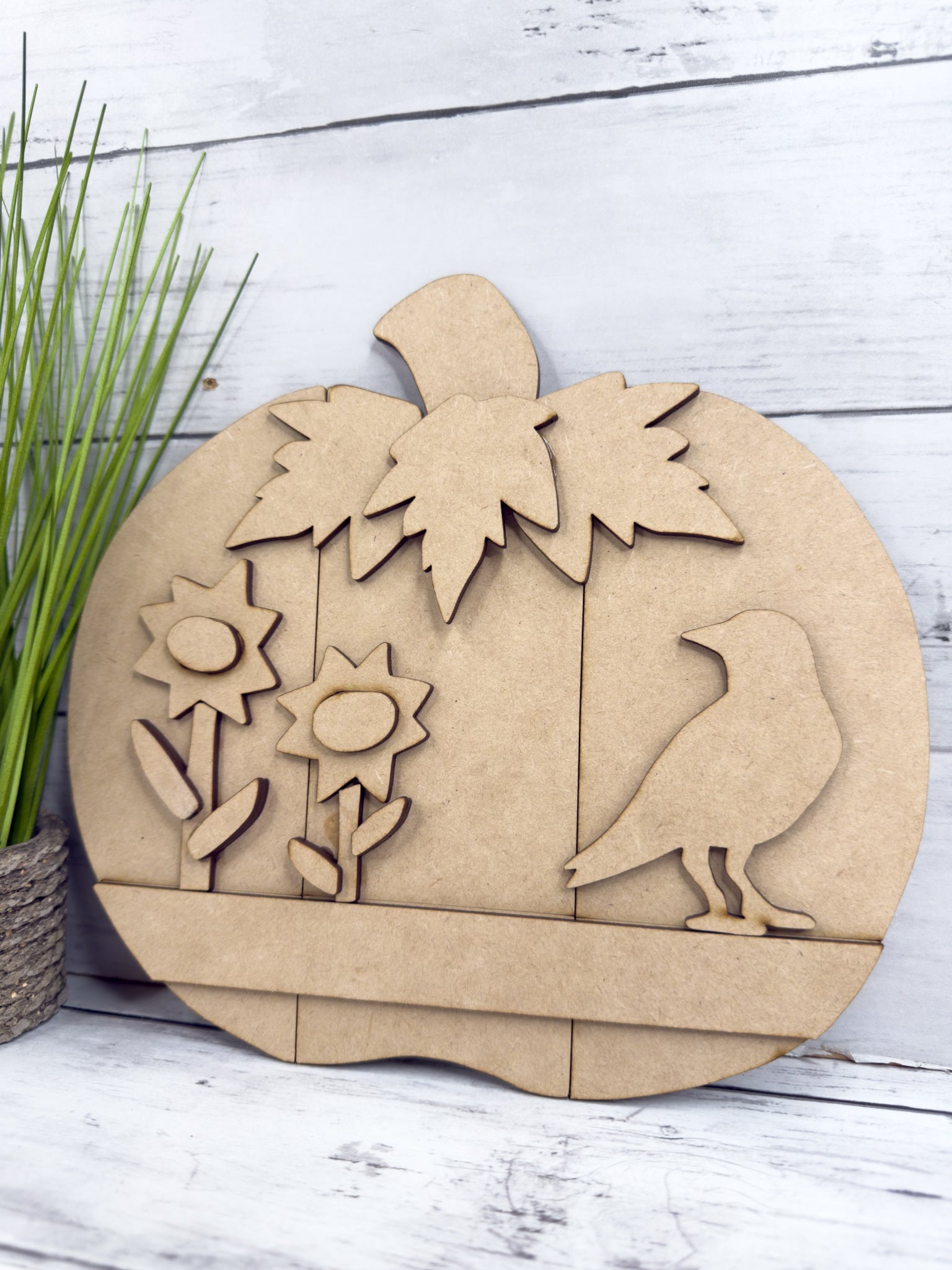This plank pumpkin is paired with a crow and flowers DIY Craft Kit would make adorable harvest decor.