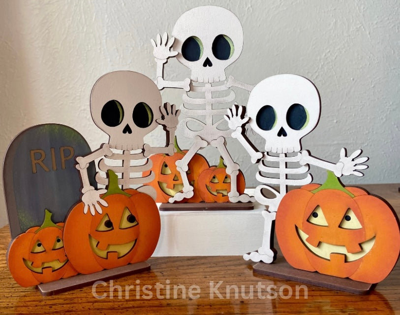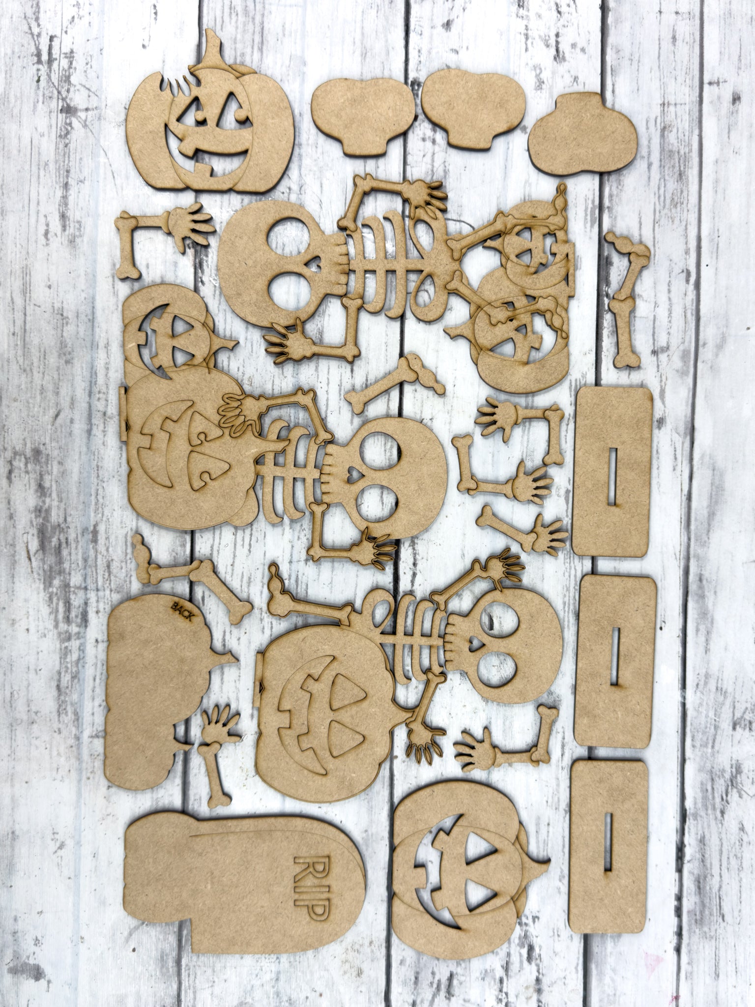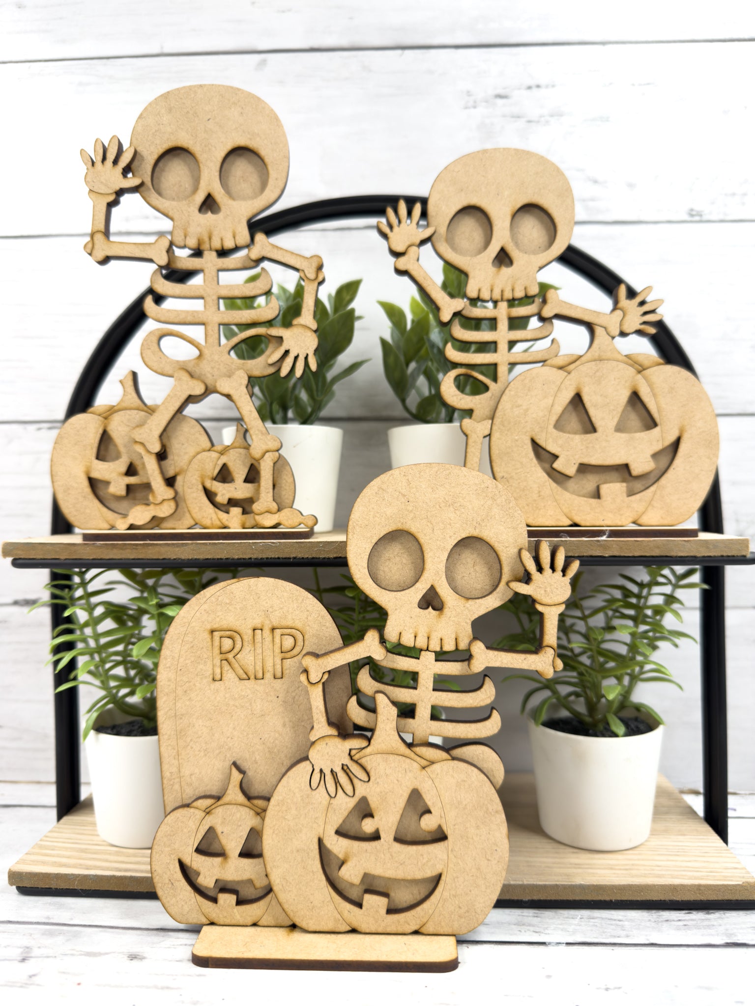 3 little skeleton cutouts with pumpkins & tombstone accents