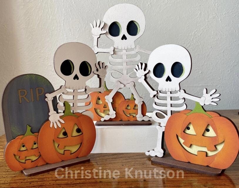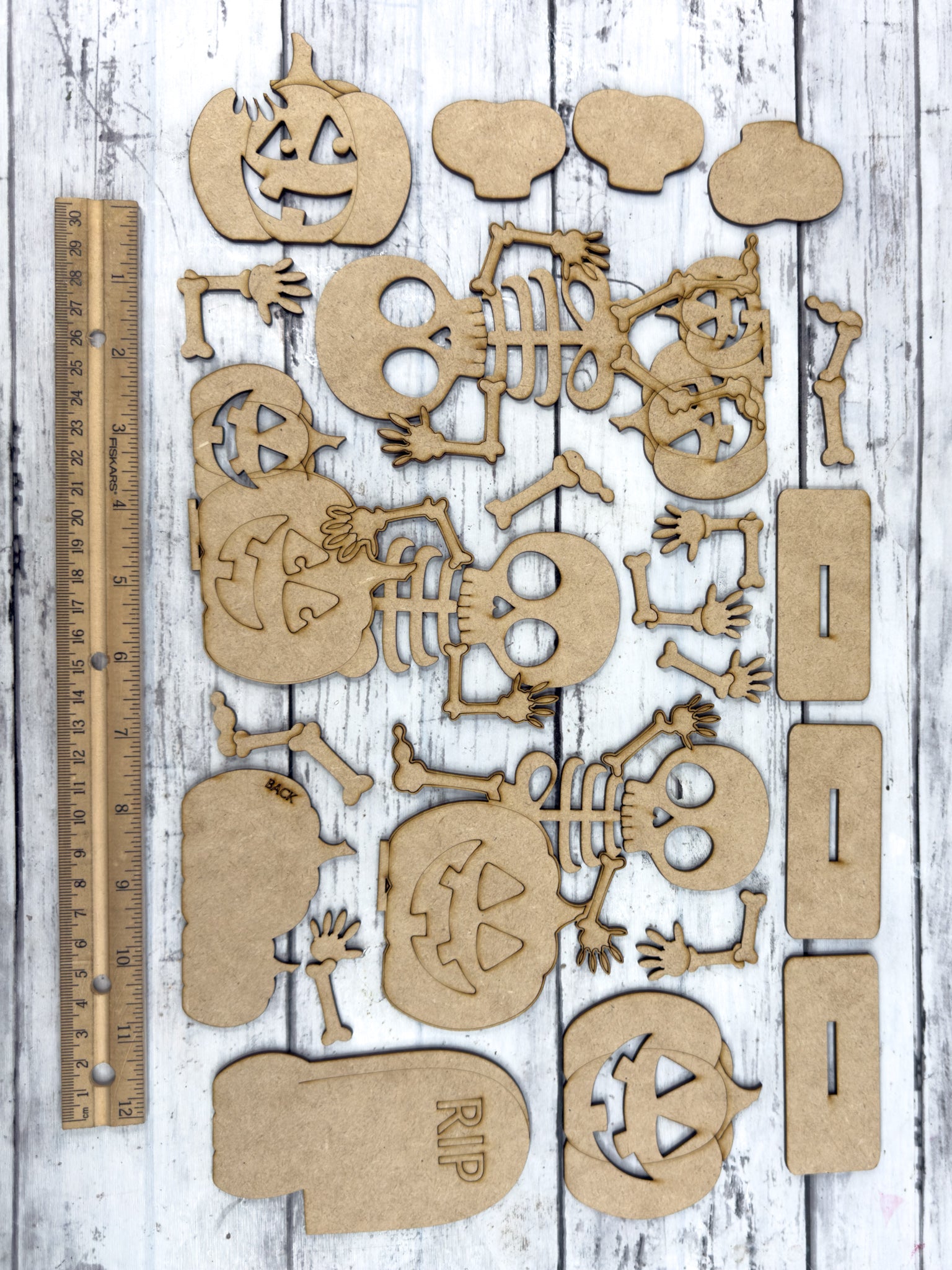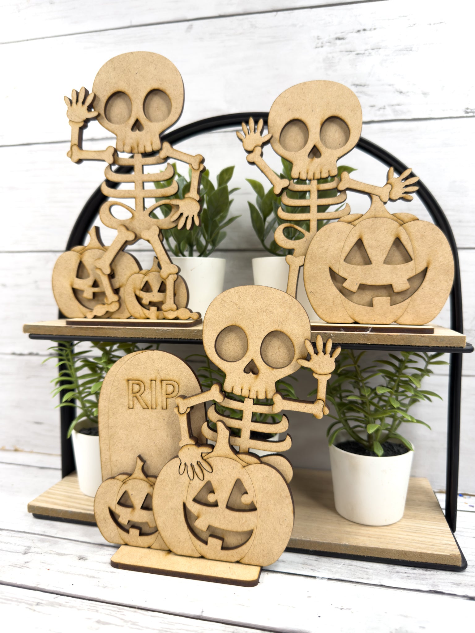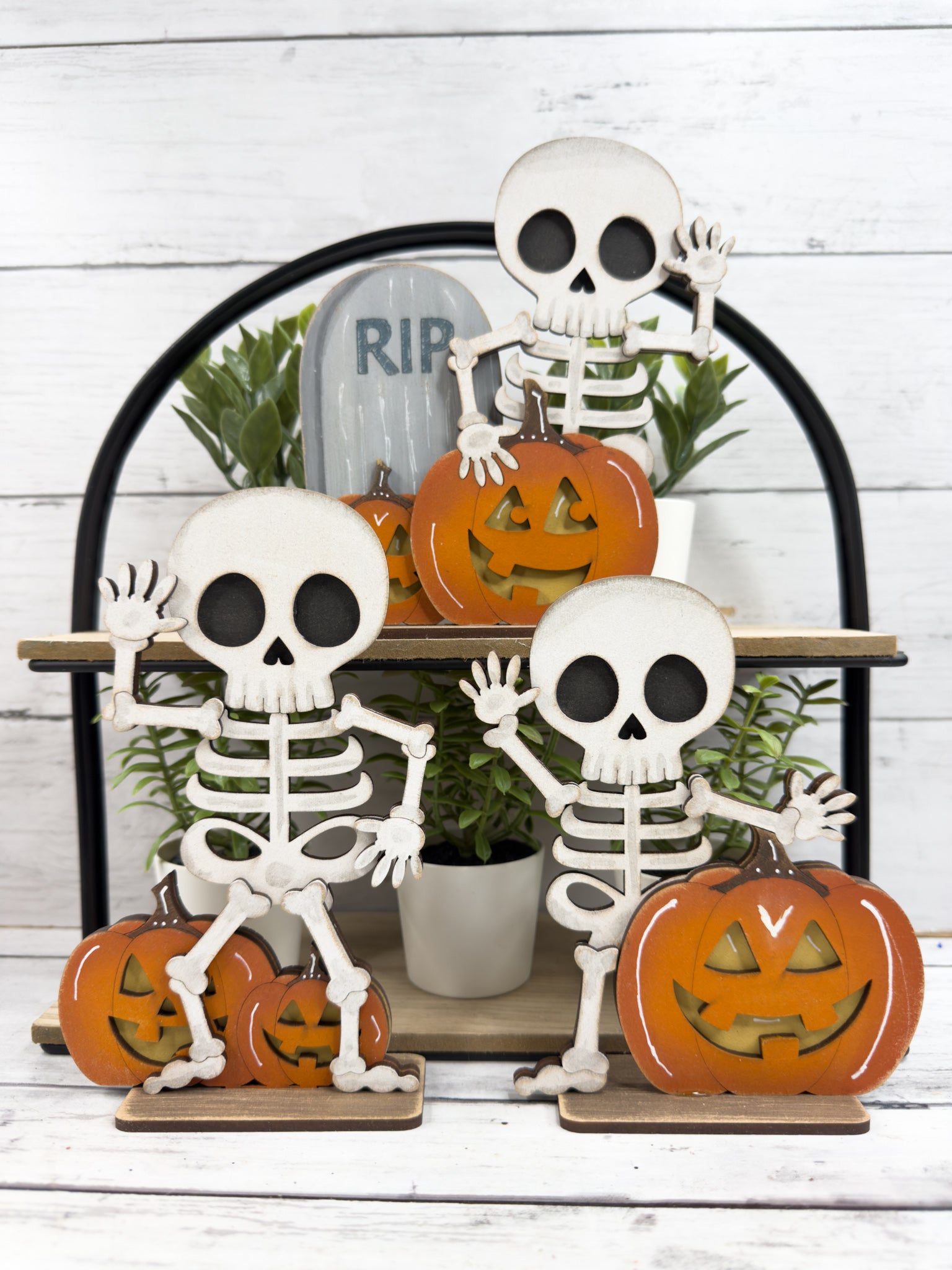 3 little skeleton cutouts with pumpkins & tombstone accents