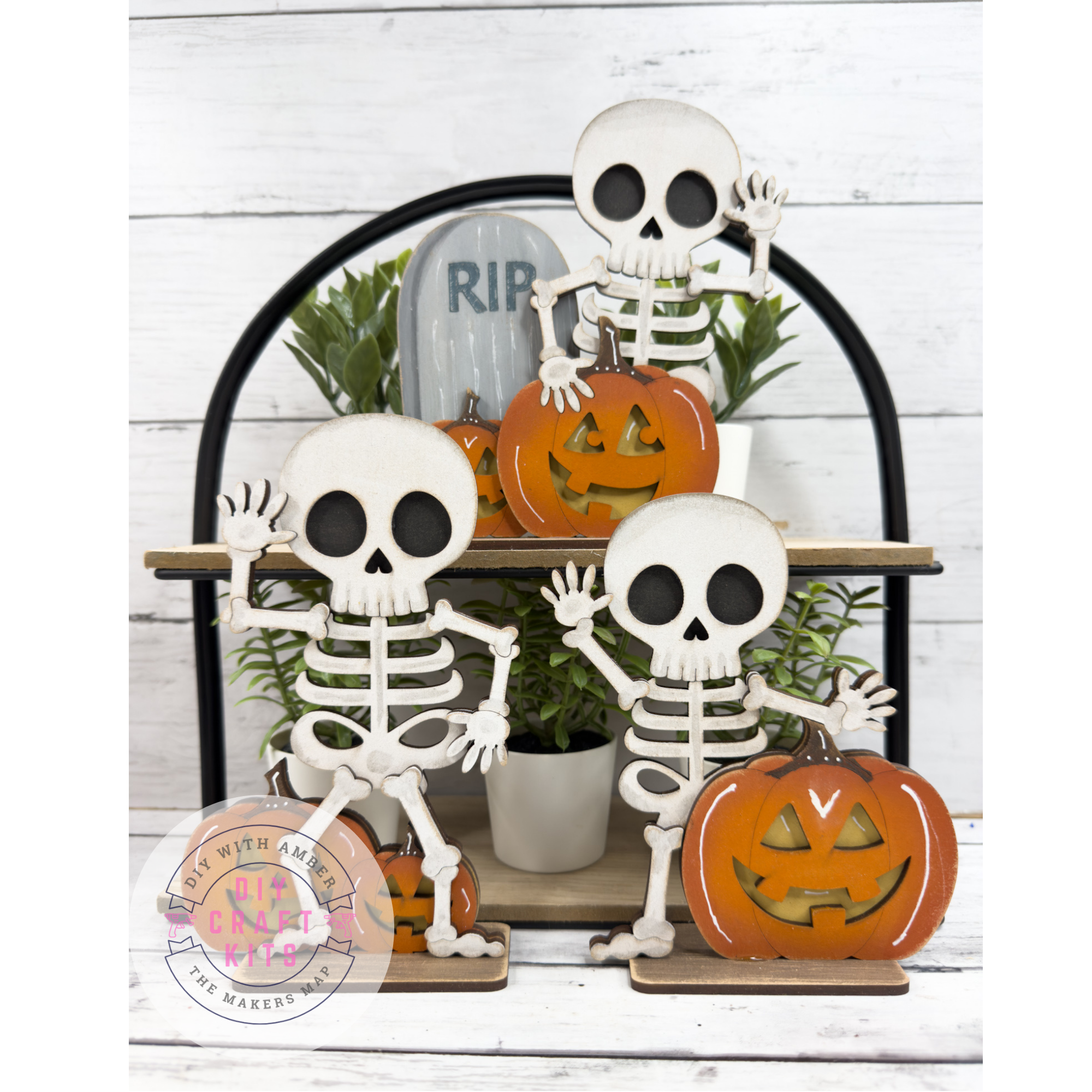 Add a spooky touch to your Halloween décor with this 3 Little Skeletons DIY Craft Kit! This fun set includes three skeletons paired with pumpkins and a tombstone, making them perfect shelf sitters for mantels, tiered trays, and seasonal displays.