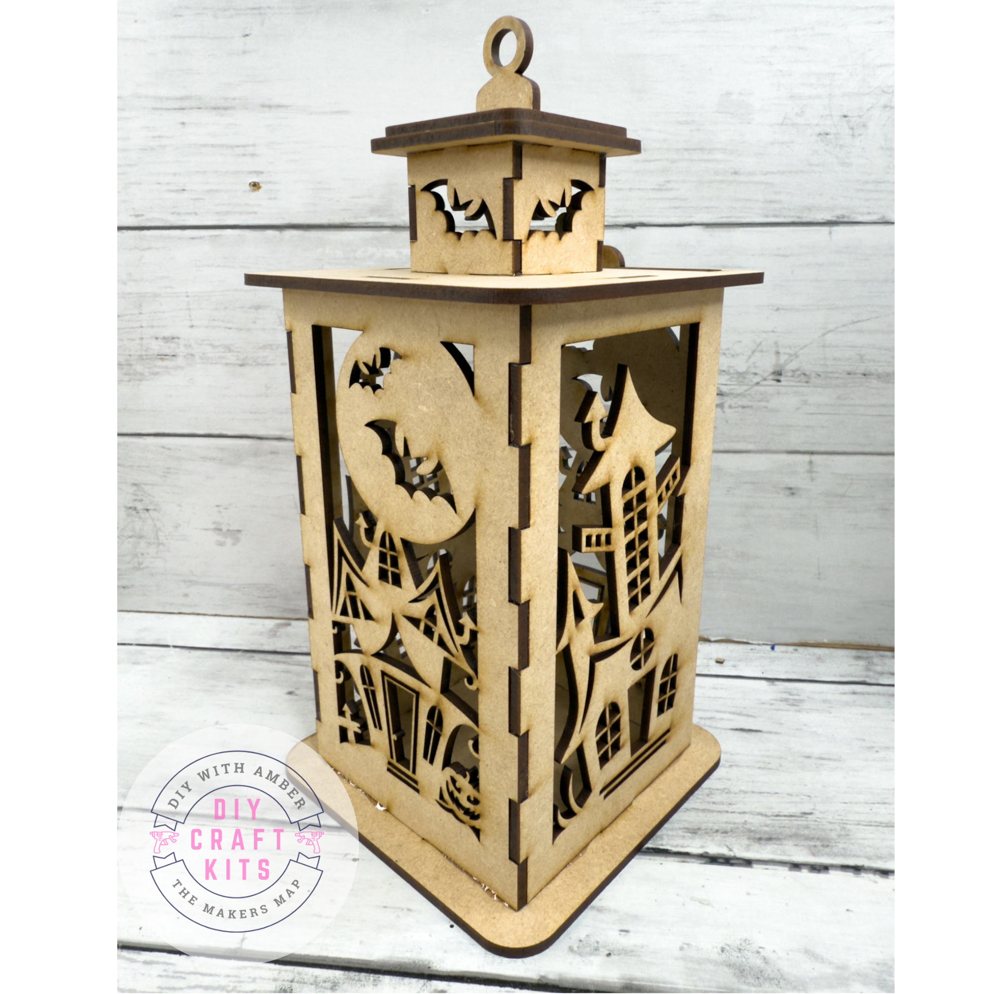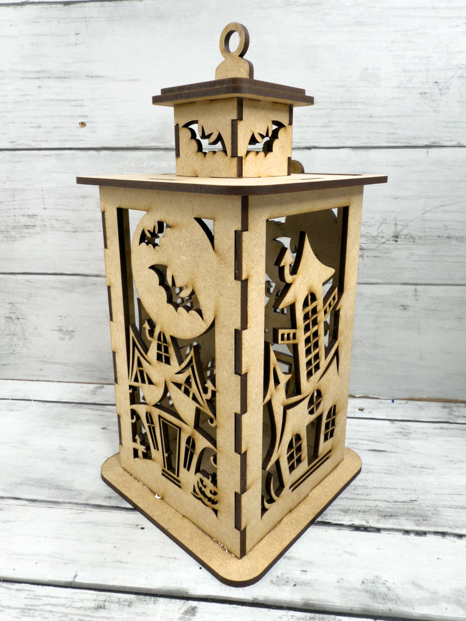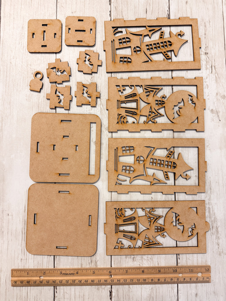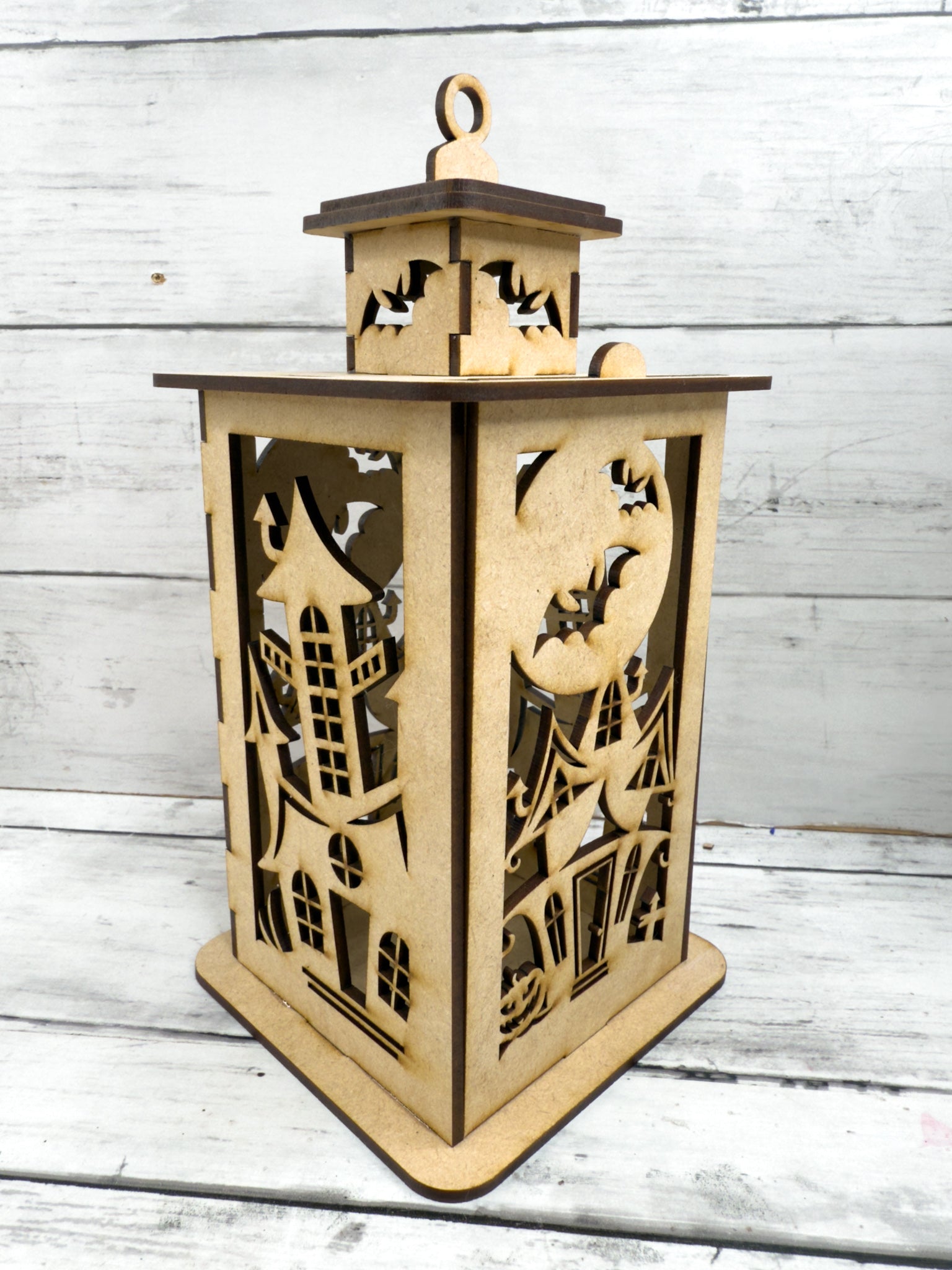 Each lantern is laser cut from smooth MDF wood in the USA and ships unfinished, ready for you to paint, stain, glitter, or embellish however you’d like. Add an LED candle or fairy lights inside to create a glowing haunted effect.