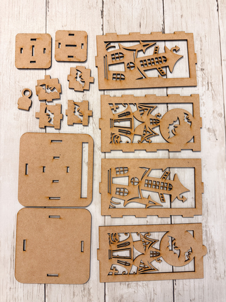 3D lantern panels with haunted houses, bats, and moon cutouts