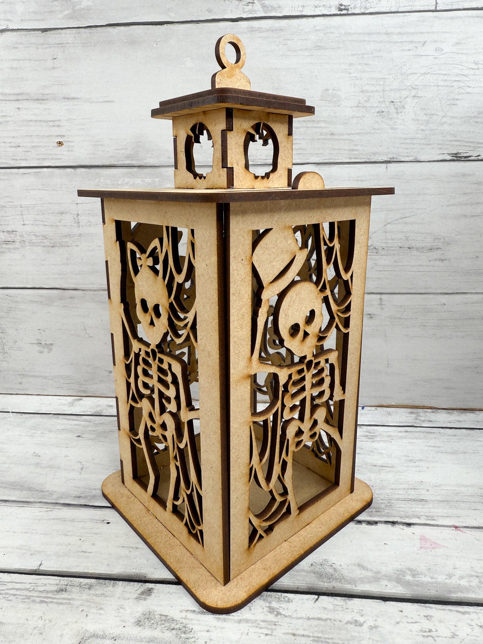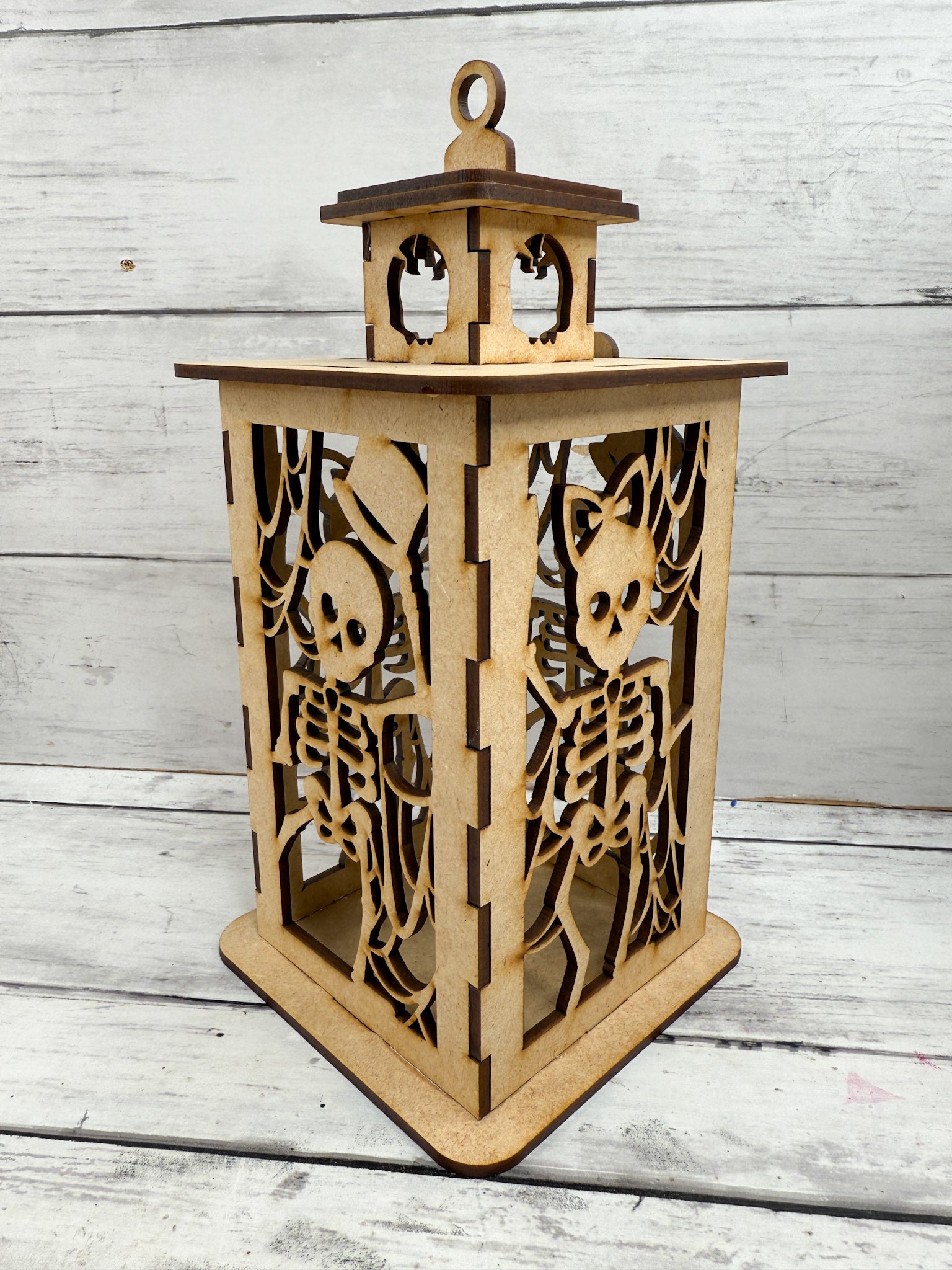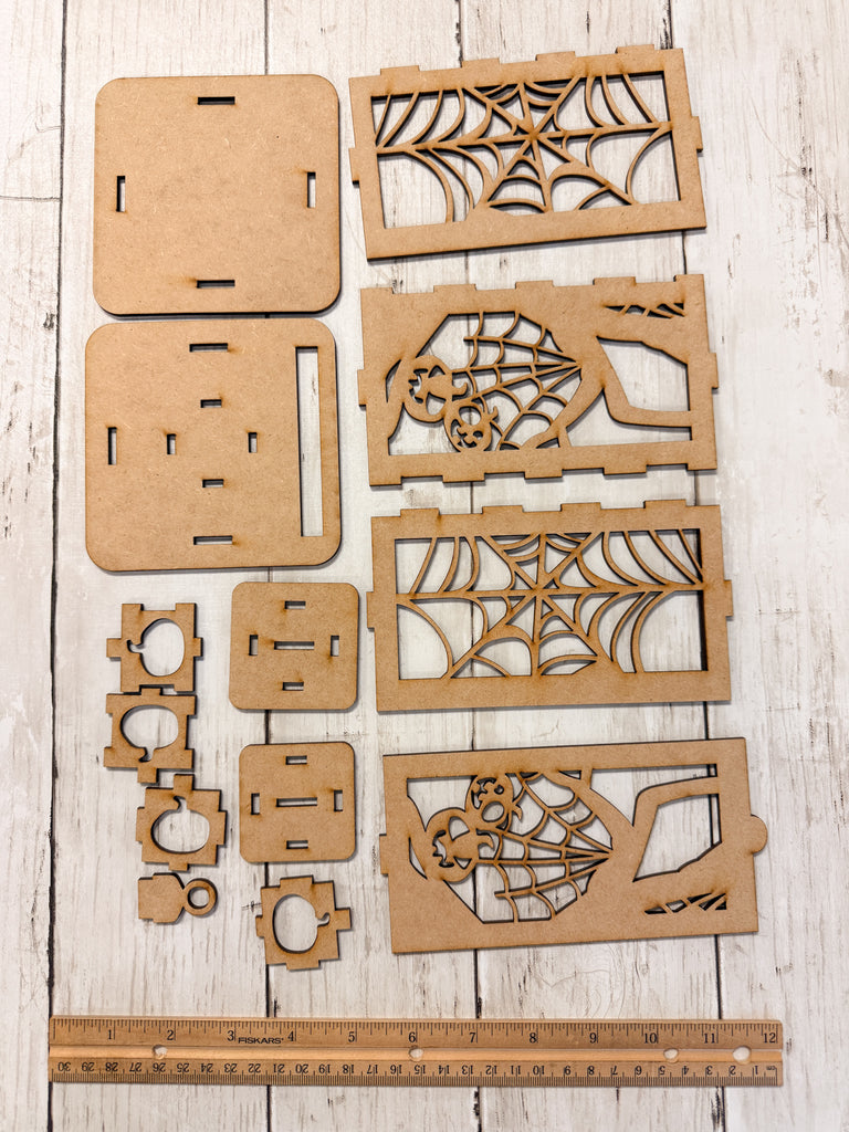 Each lantern is laser cut from smooth MDF wood in the USA and ships unfinished, ready for you to paint, stain, glitter, or embellish. Just add an LED candle or fairy lights to create a glowing Halloween centerpiece for mantels, shelves, or tables.