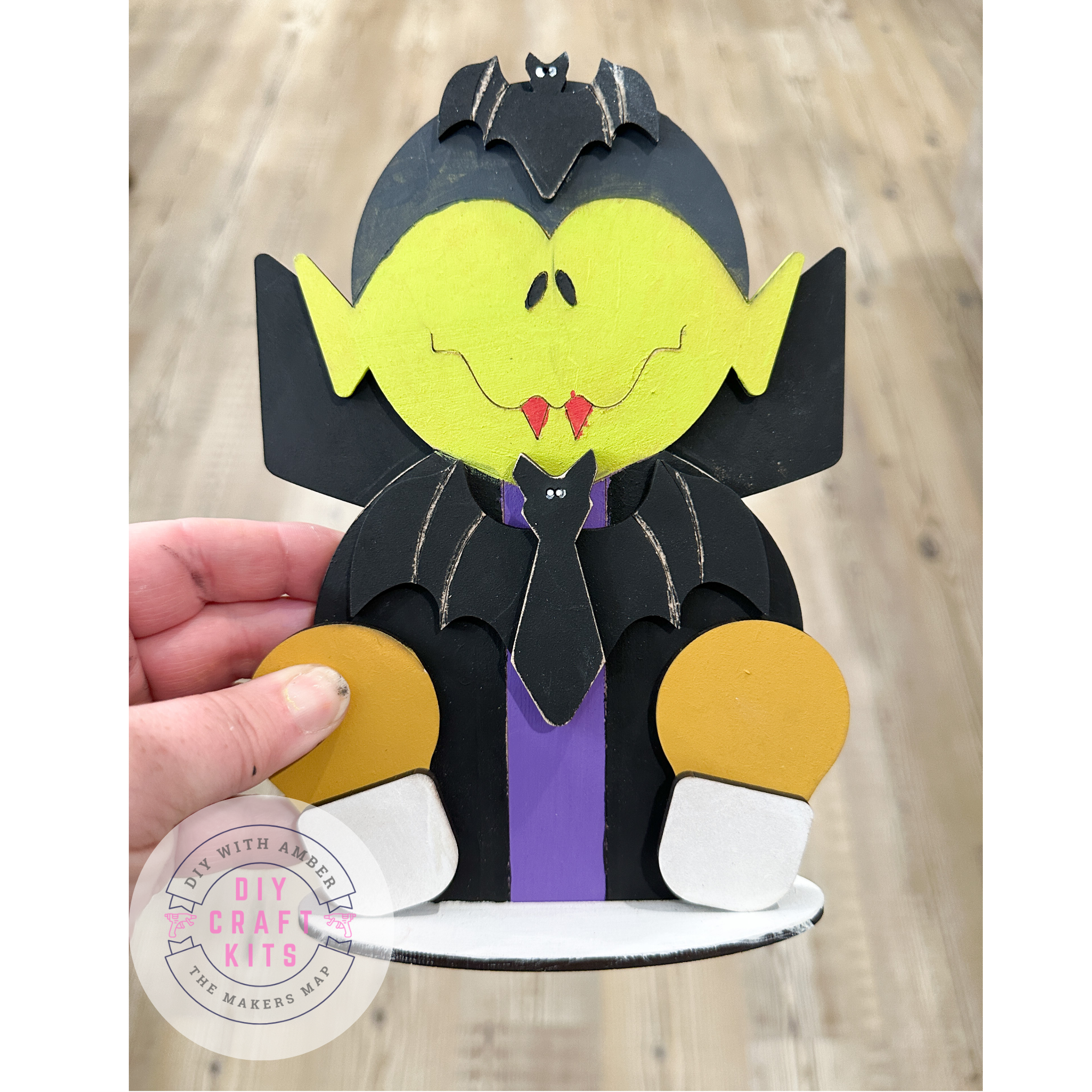 Add a spooky and playful touch to your fall décor with this Dracula Shelf Sitter DIY Kit! Featuring a friendly vampire with candy corn feet and bat details, this laser-cut wood craft is perfect for painting and displaying on shelves, mantels, or tiered trays.