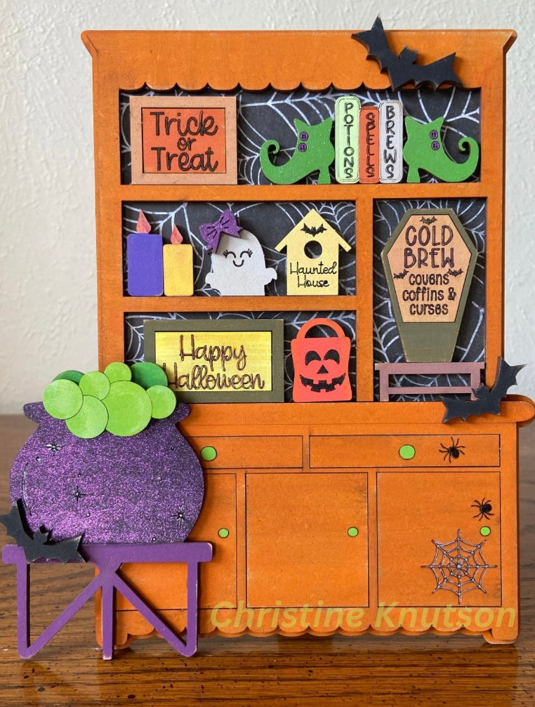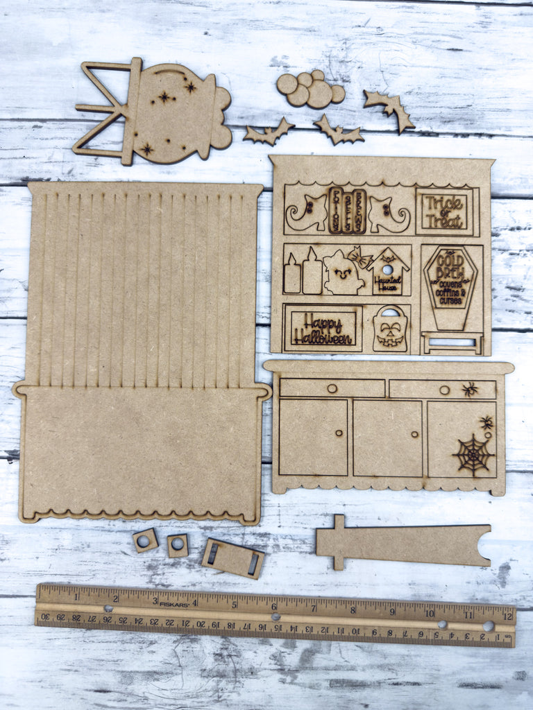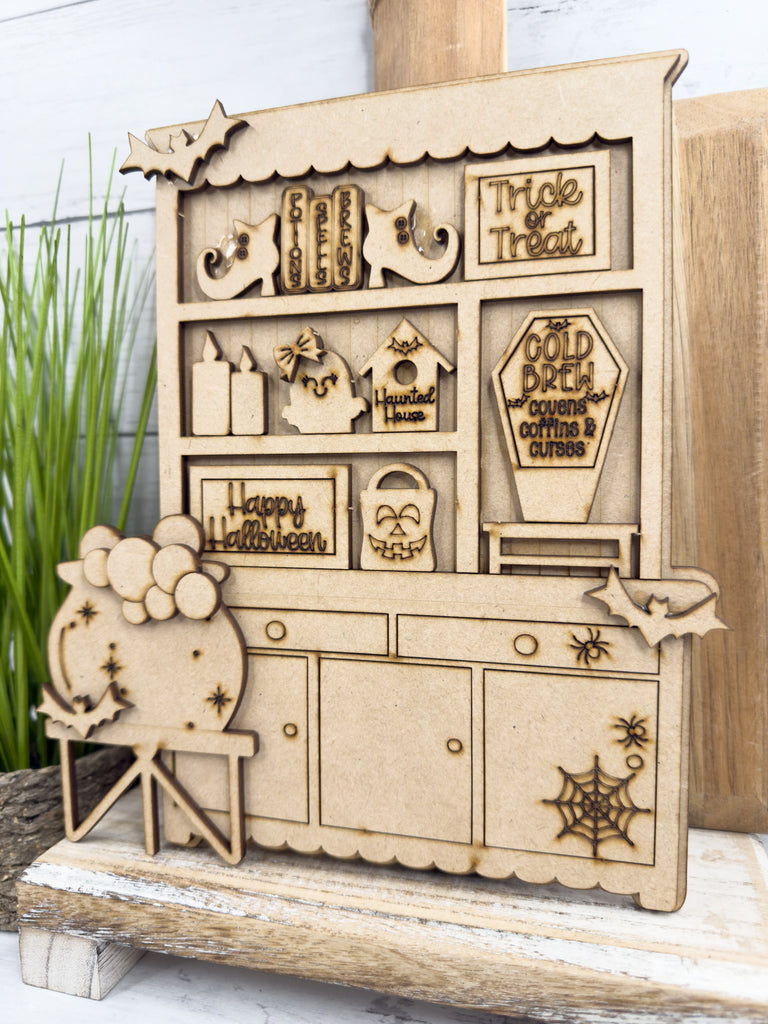 This small hutch cabinet shelf sitter is the perfect addition to your mantle decor of tiny houses or mini buildings!