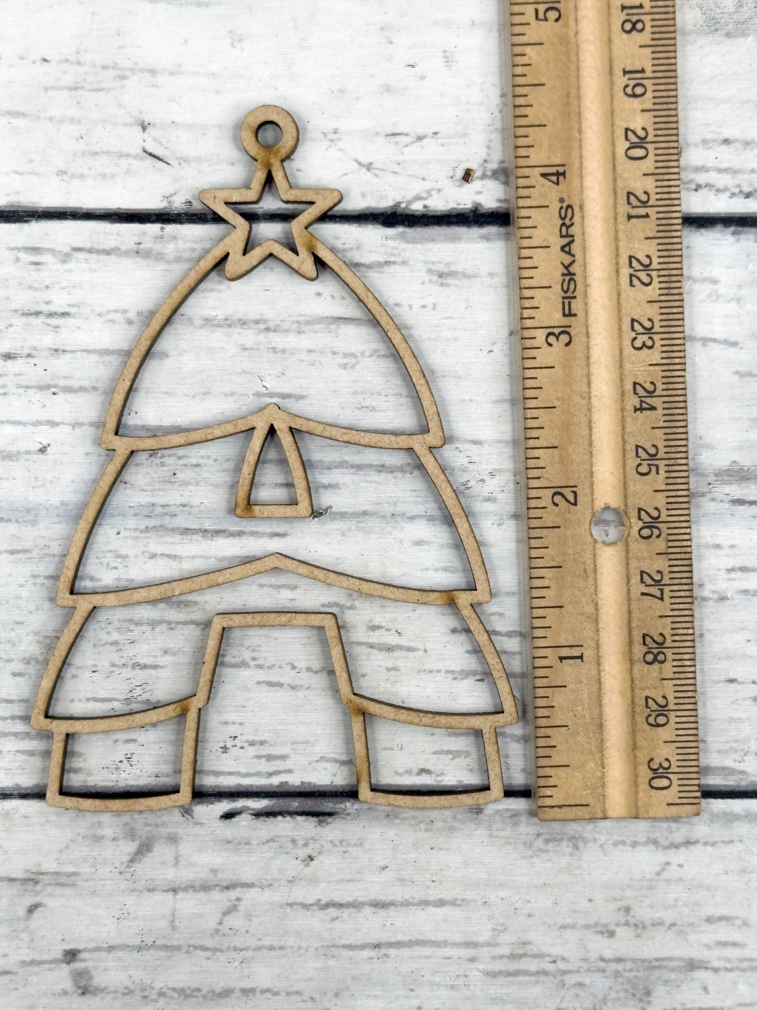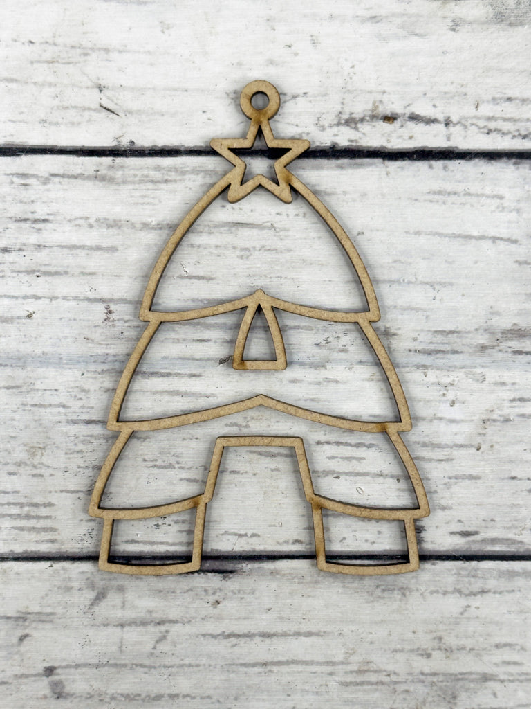 Laser cut from smooth 1/8” HDF, the open outline design makes it versatile for all creative styles—from rustic farmhouse to modern and colorful. The star detail at the top adds a festive finish, while the cut-out sections make decorating fun and easy for all ages.