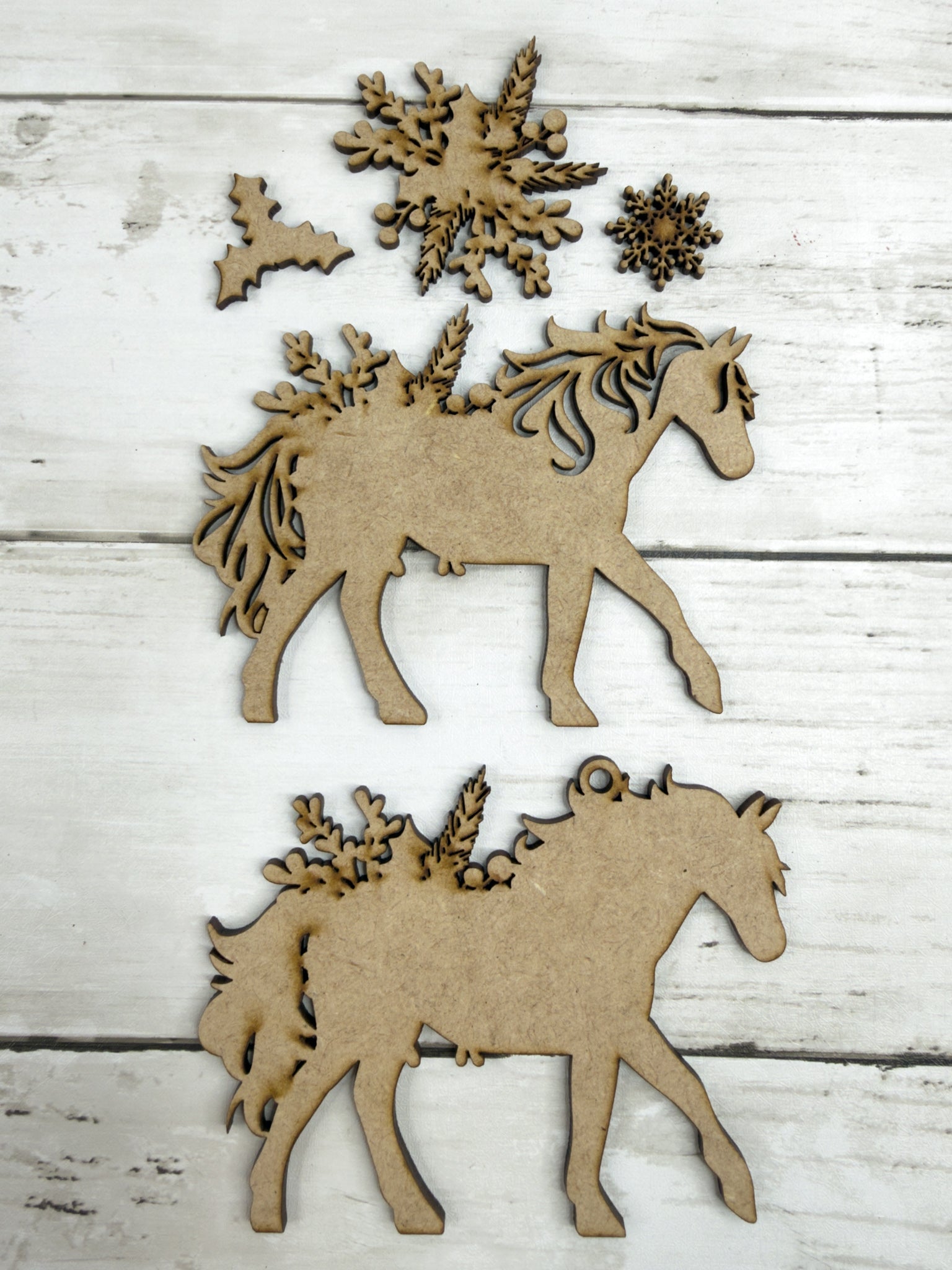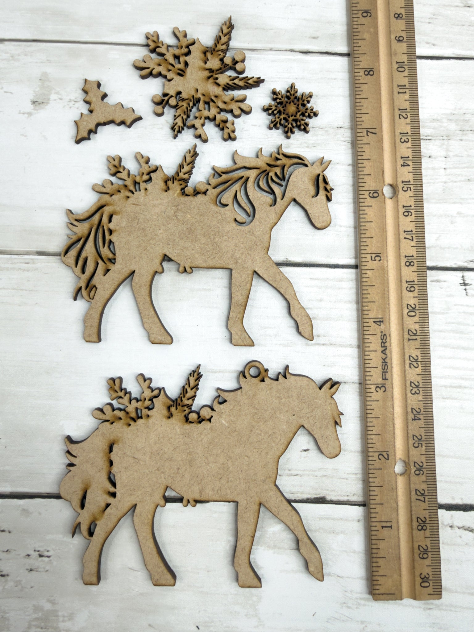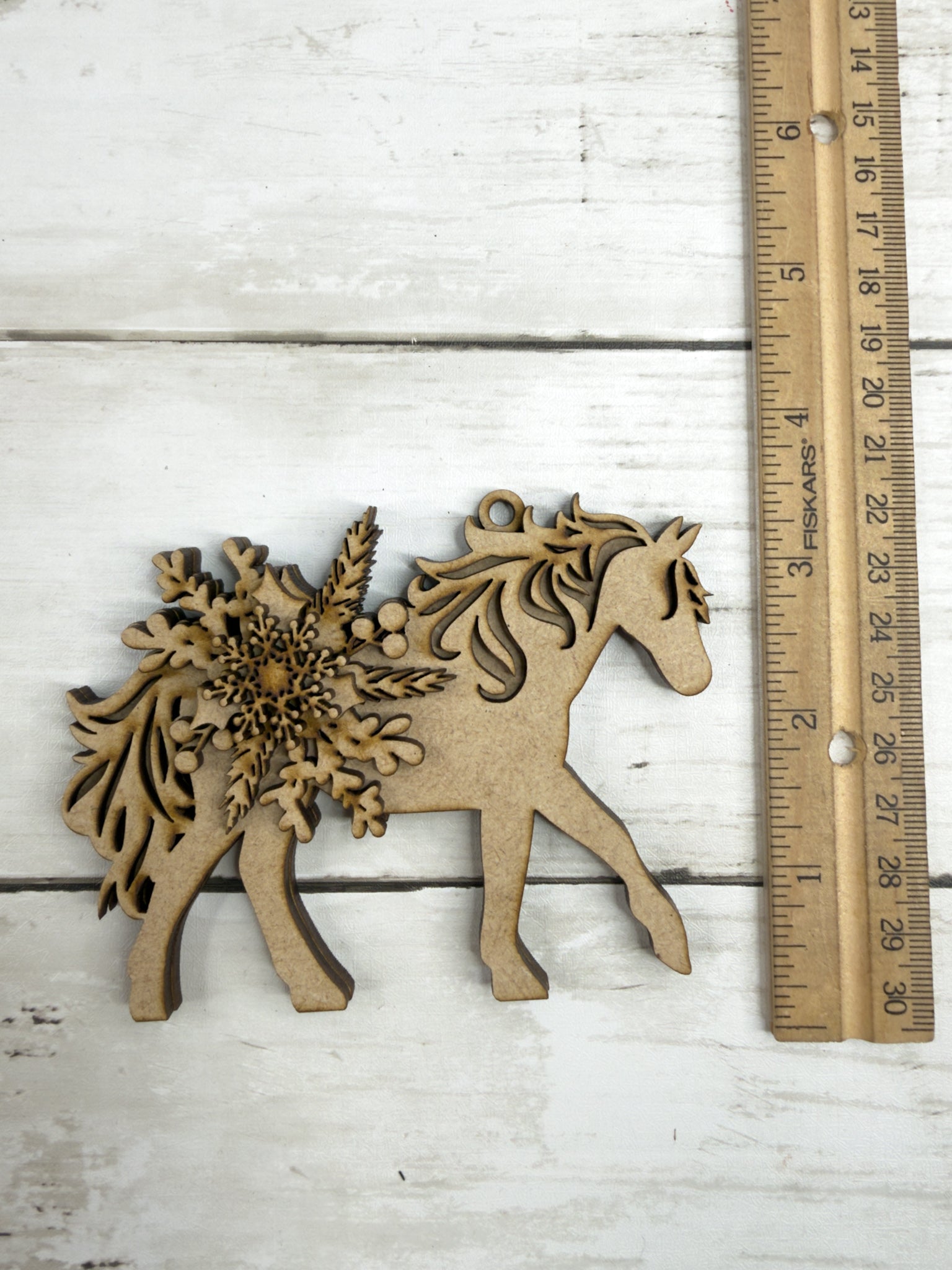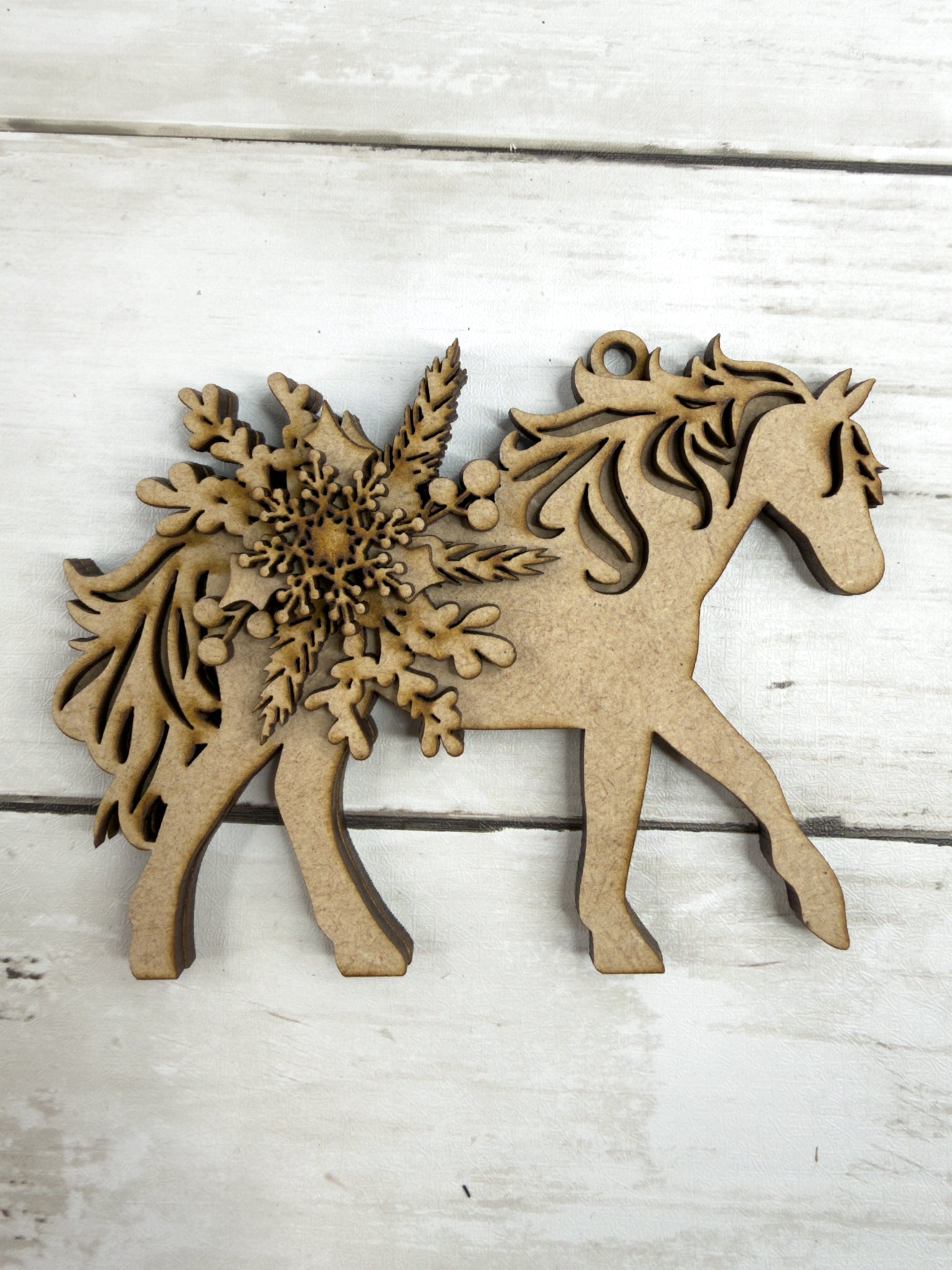 This beautifully layered ornament features an elegant horse adorned with winter greenery and a detailed snowflake accent — perfect for painting, staining, or embellishing with glitter, resin, or metallic finishes. It’s a charming addition to your Christmas décor or a wonderful craft for horse lovers and DIYers alike!