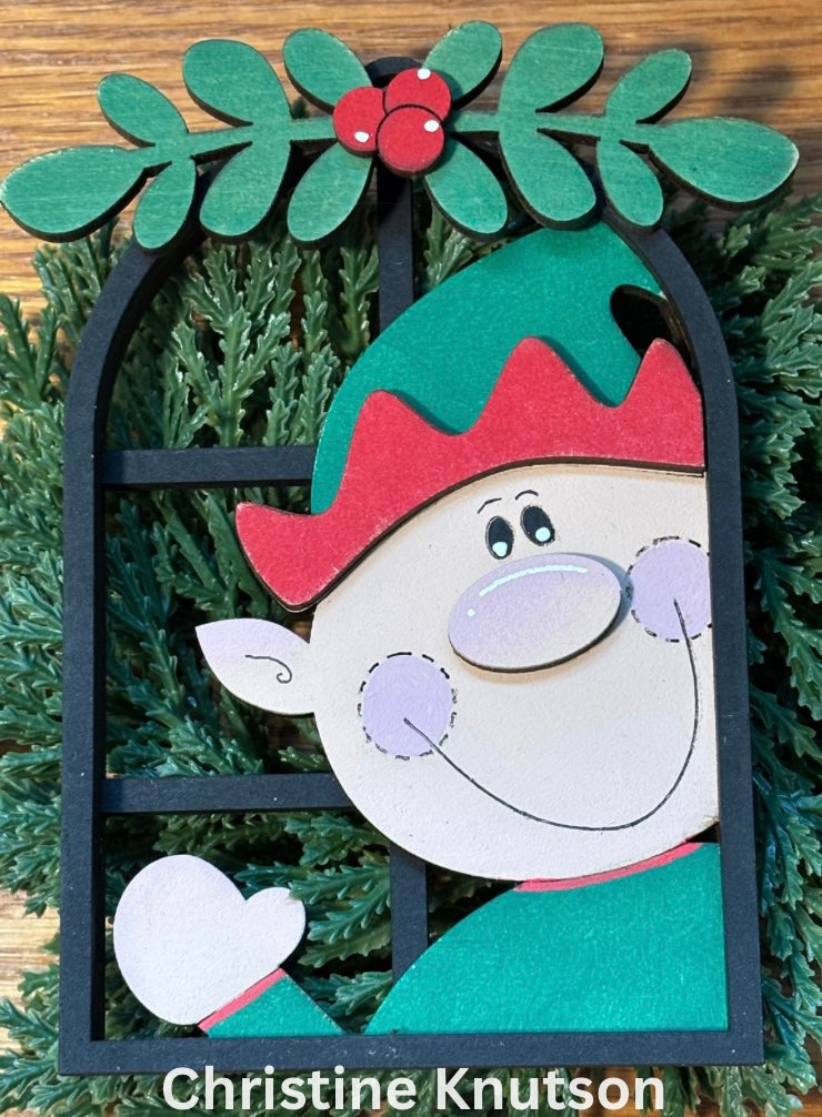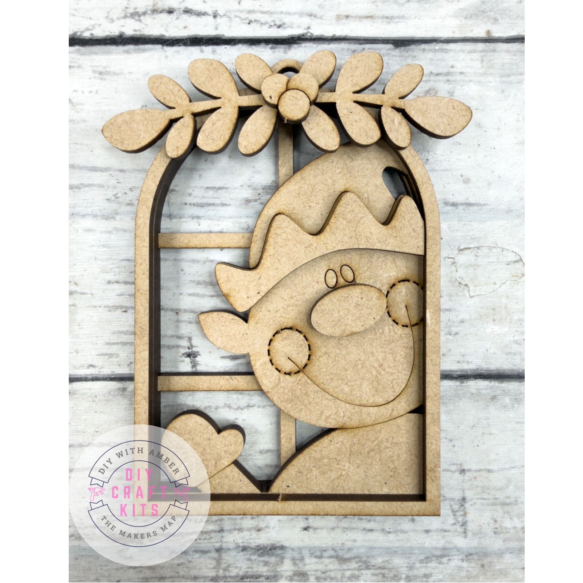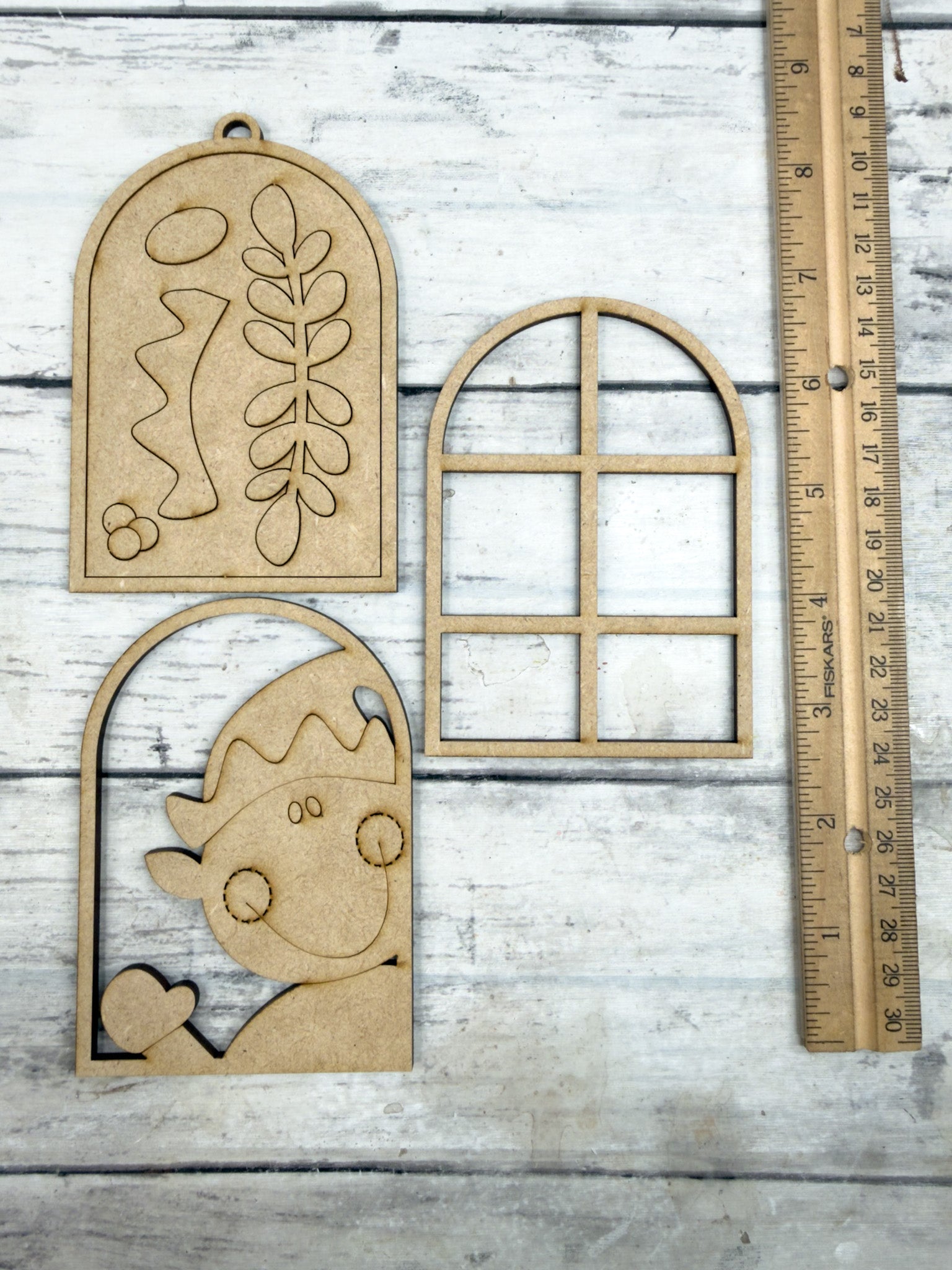 Bring holiday cheer to your crafting table with this festive Elf Arch Window Ornament! Featuring a smiling elf peeking through a window frame adorned with leaves and a flower topper, this piece makes a fun and whimsical addition to your Christmas décor.