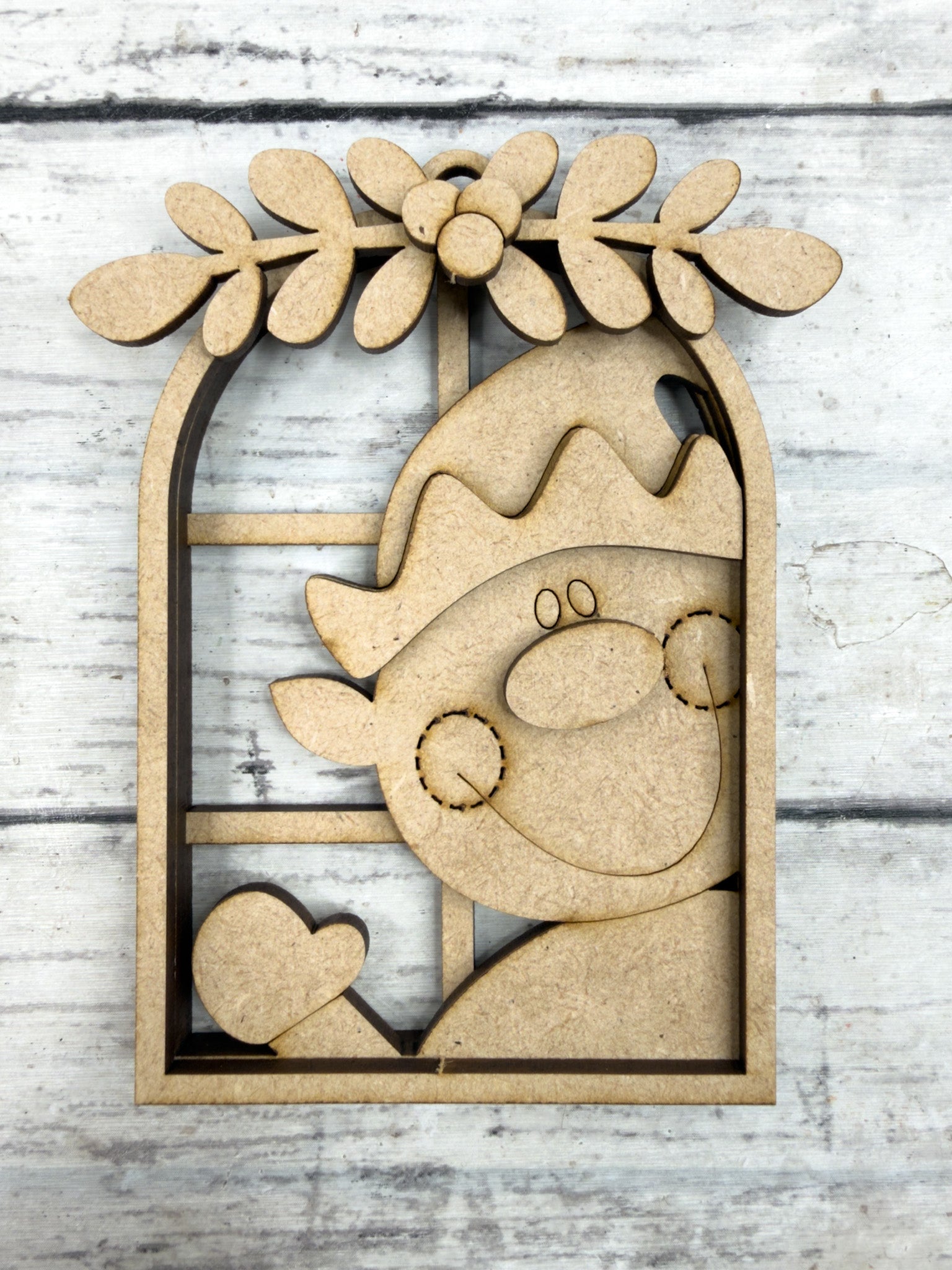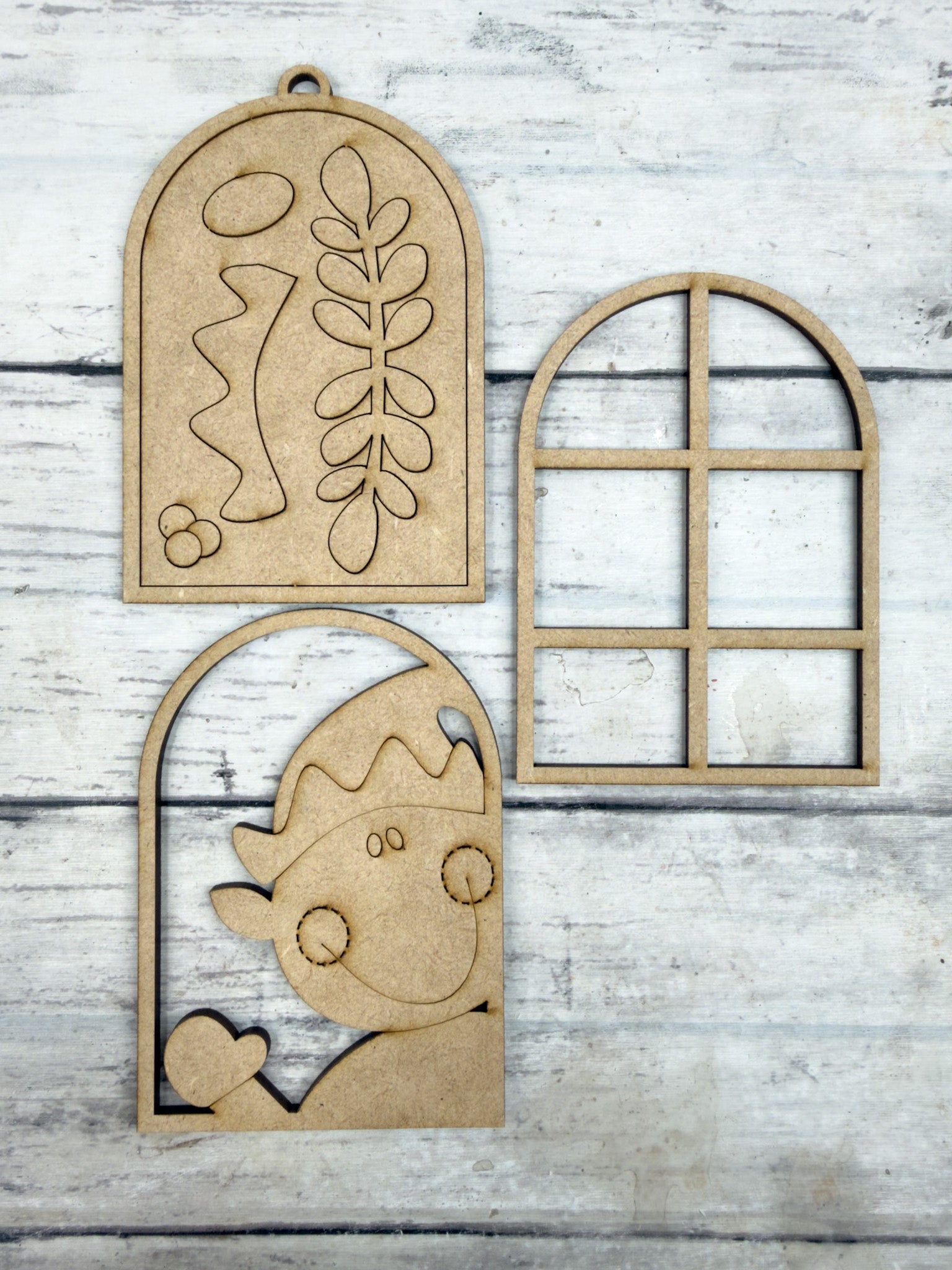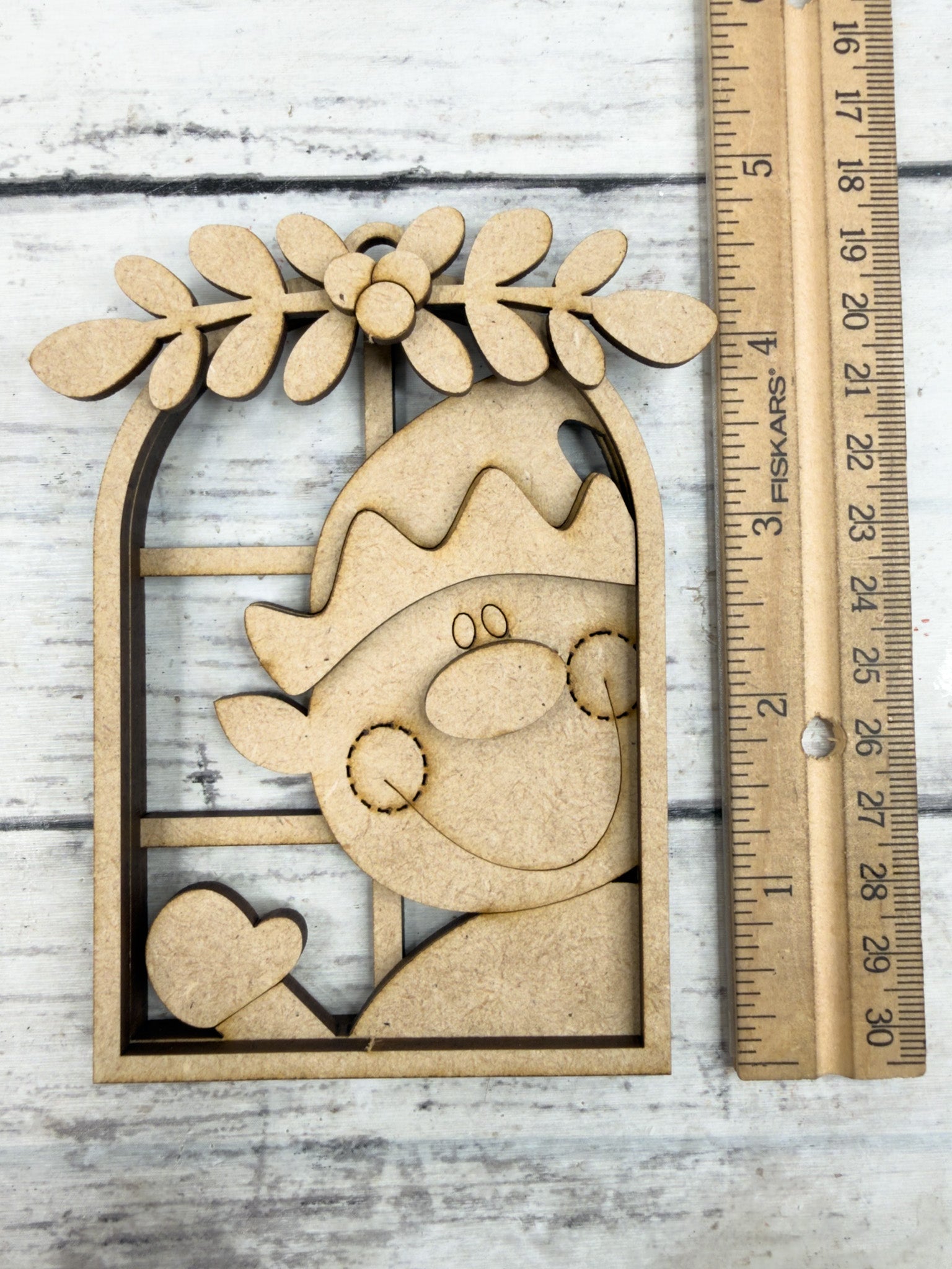 Bring holiday cheer to your crafting table with this festive Elf Arch Window Ornament! Featuring a smiling elf peeking through a window frame adorned with leaves and a flower topper, this piece makes a fun and whimsical addition to your Christmas décor.