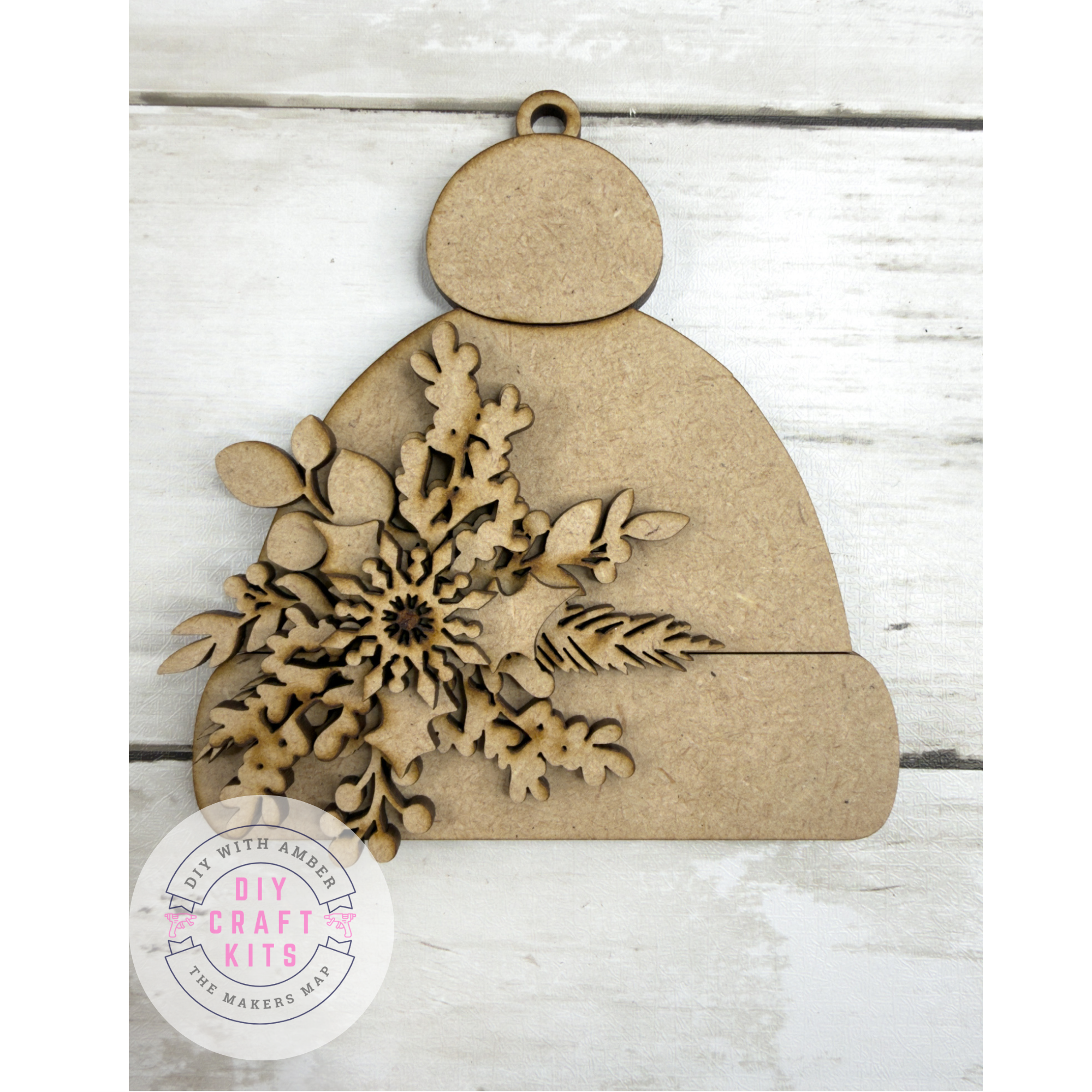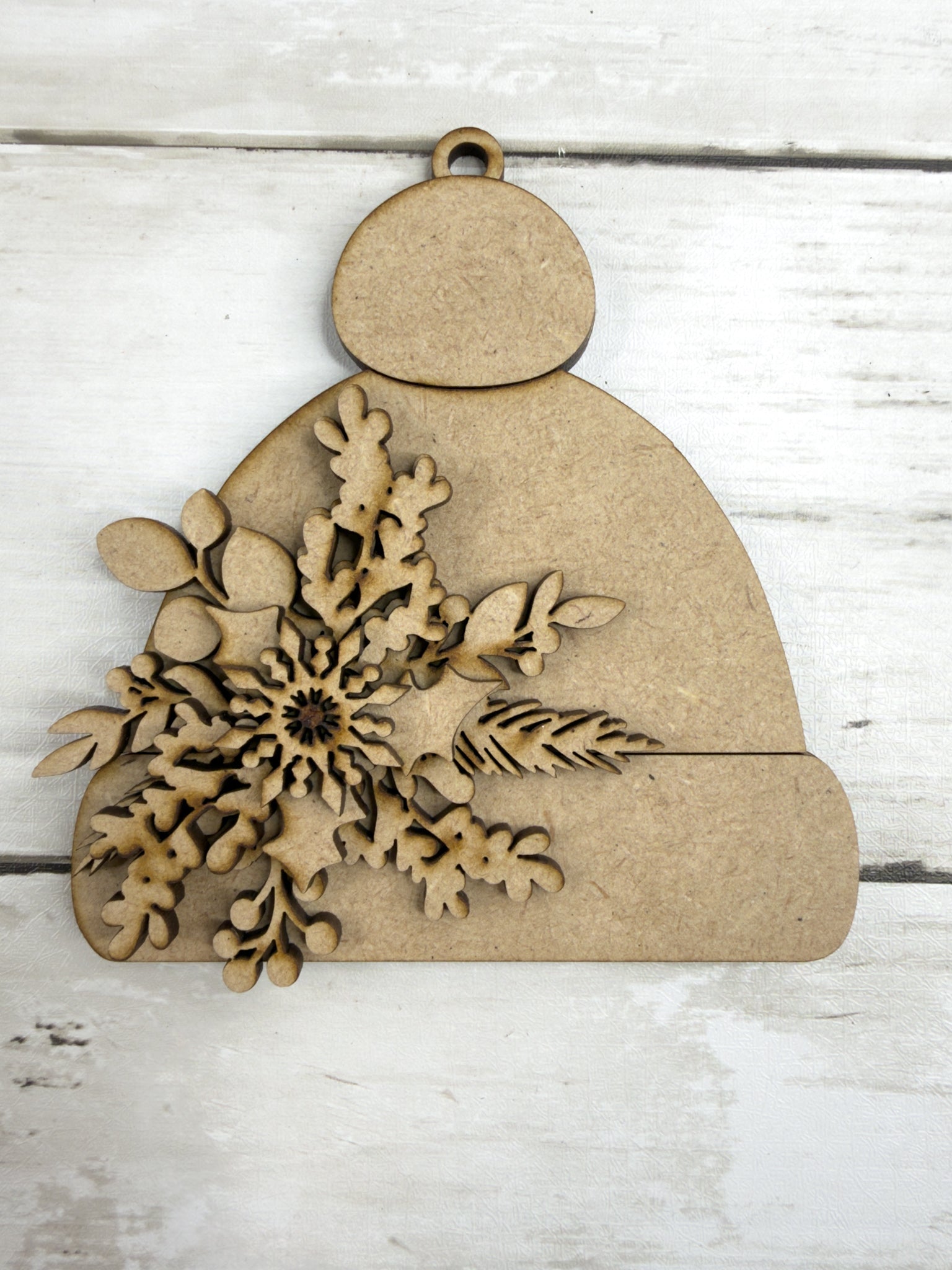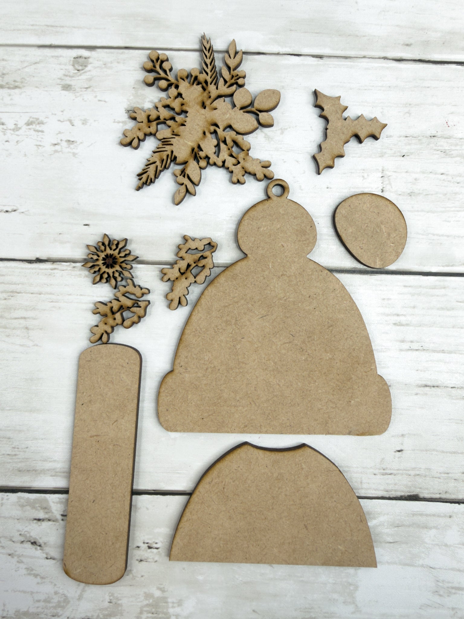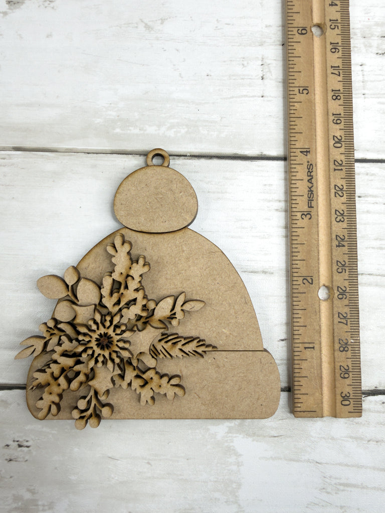 This charming layered ornament features a cozy winter hat accented with intricate greenery and a detailed snowflake design — the perfect mix of rustic and festive. Whether you paint it in bright holiday colors, stain it for a farmhouse finish, or add shimmer and glitter for extra sparkle, this DIY kit is a must-have for your winter crafting lineup!