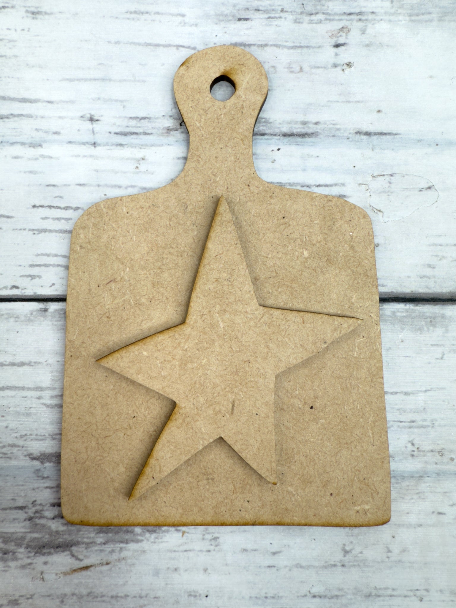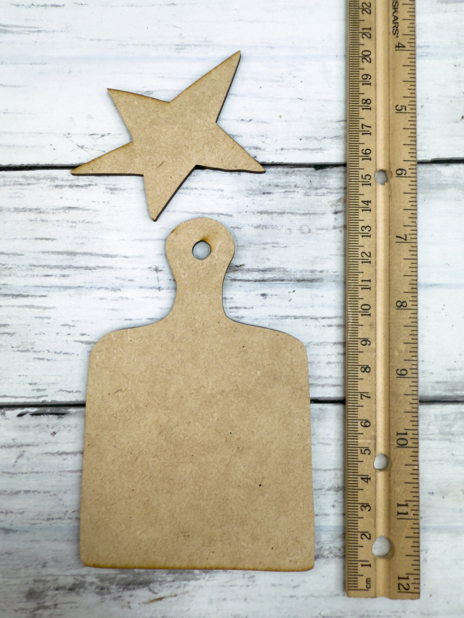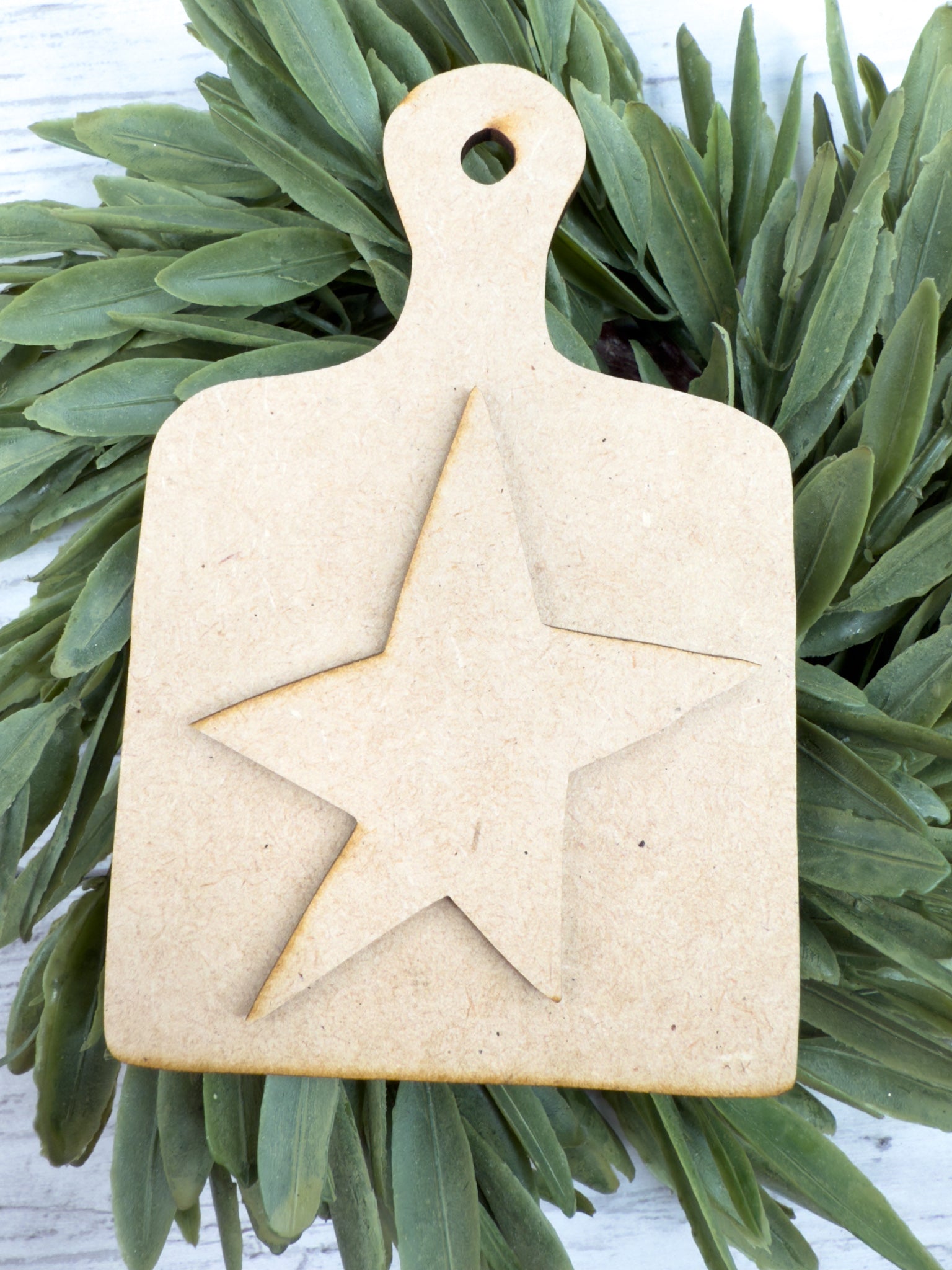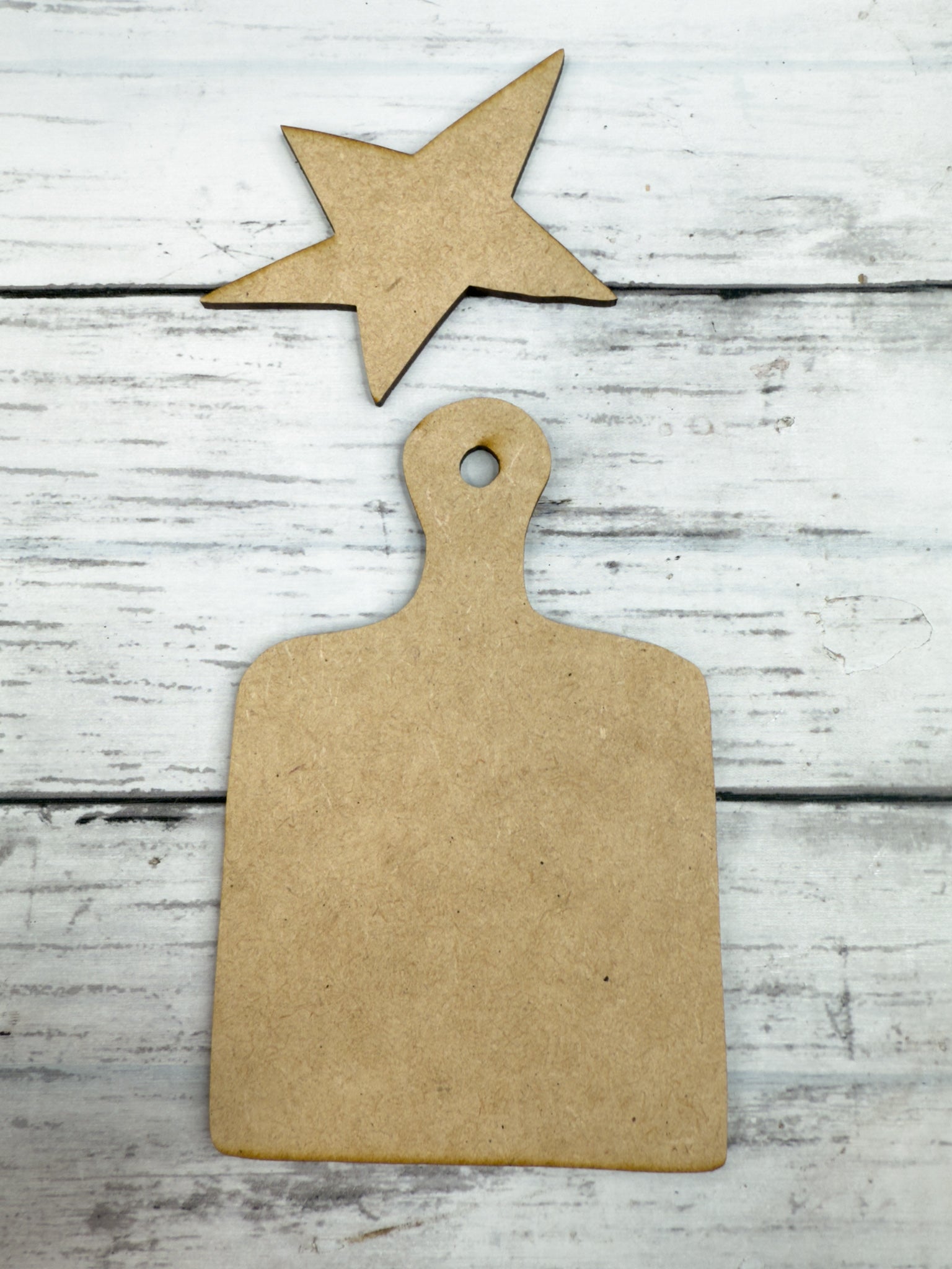 This DIY Star cutting board Ornament is the perfect rustic accent for your Christmas tree, tiered tray, or gift wrapping! Shaped like a mini cutting board and topped with a hand drawn dimensional star, this laser-cut wood blank is ideal for farmhouse, primitive, or Americana-inspired holiday decor.