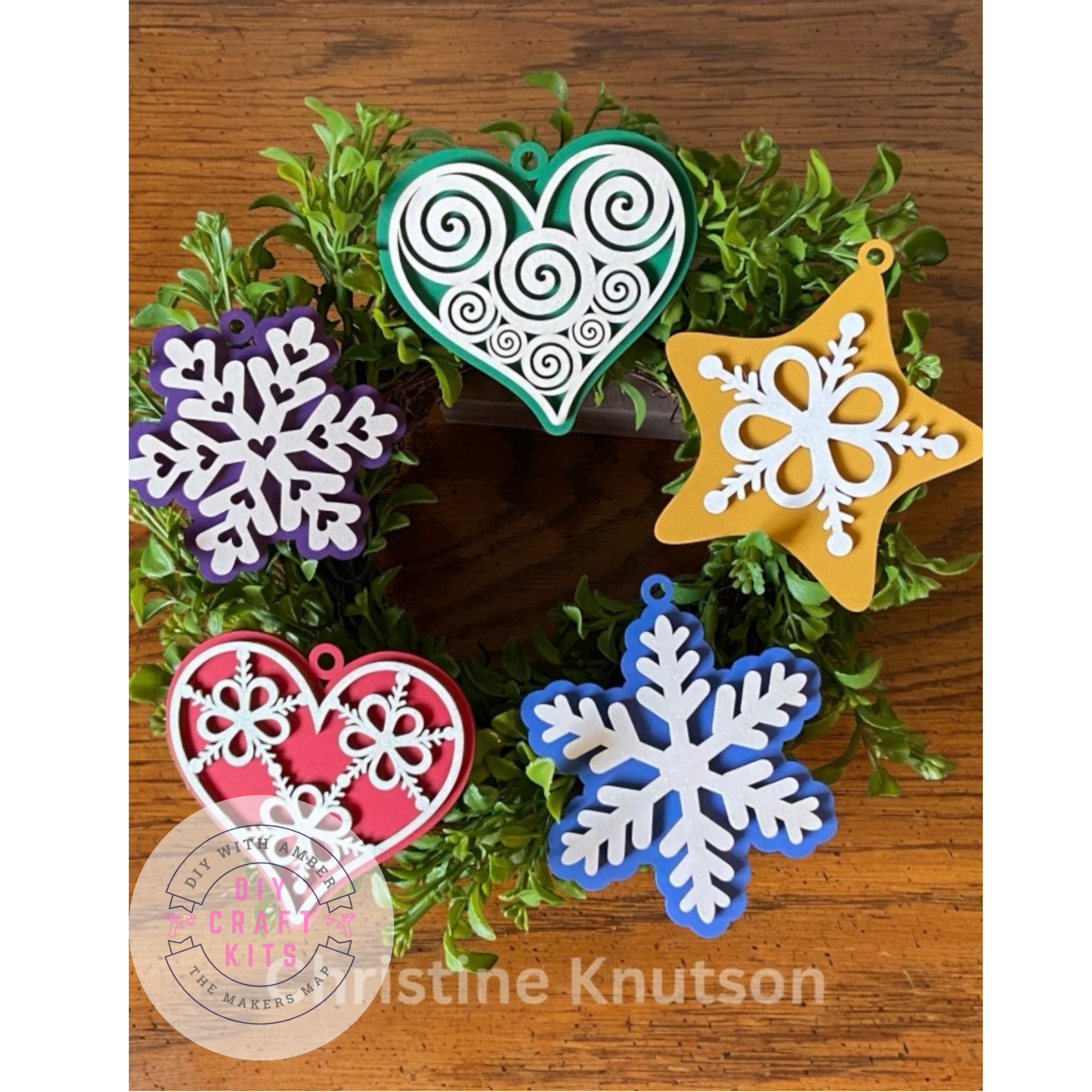 5 layered ornament shapes (2 snowflakes, 2 hearts, 1 star)