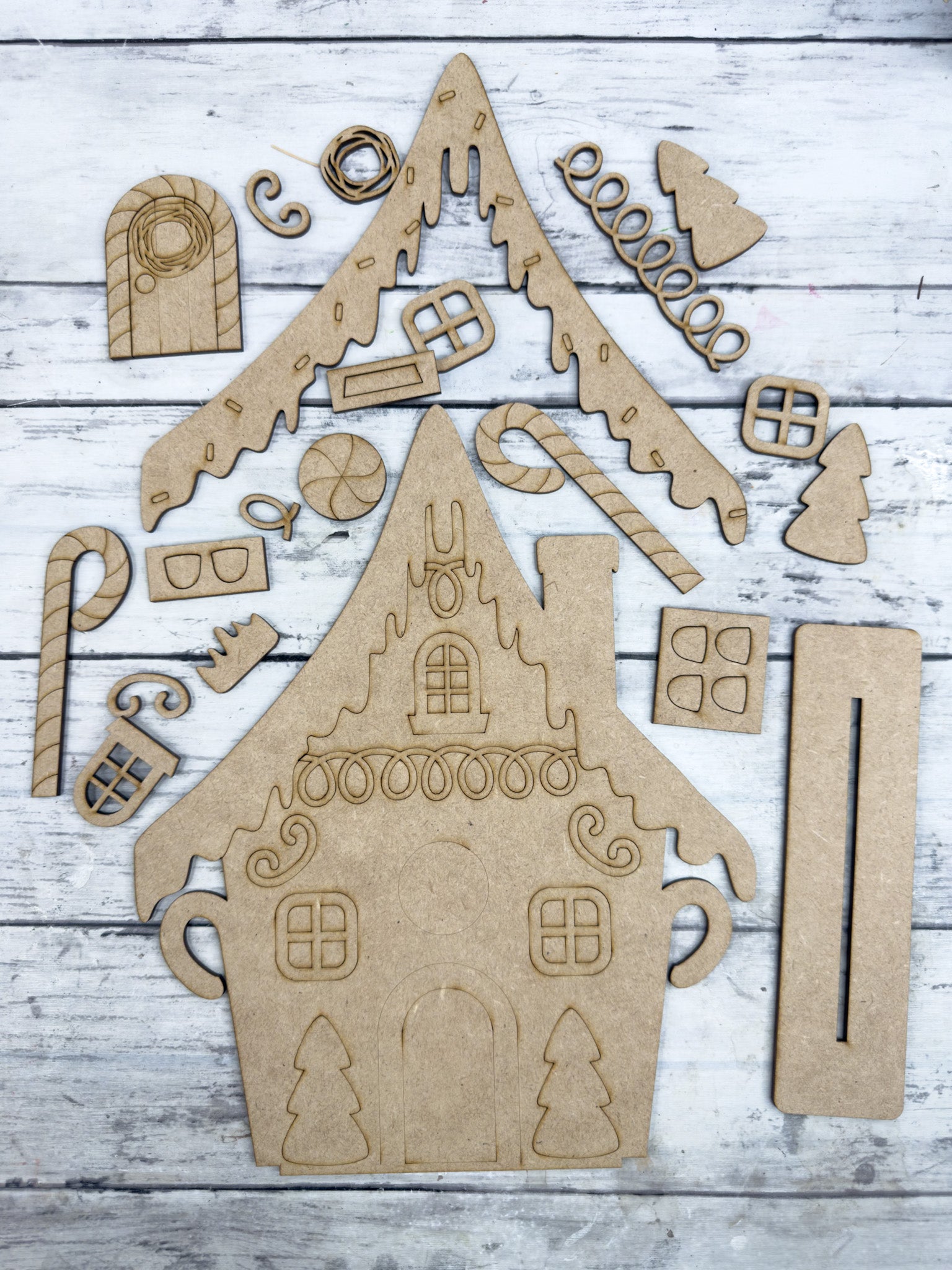 Create a festive centerpiece with this Christmas Gingerbread House DIY Craft Kit. Made from smooth laser-cut wood, this unfinished candy house features fun details like candy canes, gumdrops, peppermint swirls, and frosted roof lines—perfect for painting, staining, glittering, or embellishing with your favorite craft supplies.