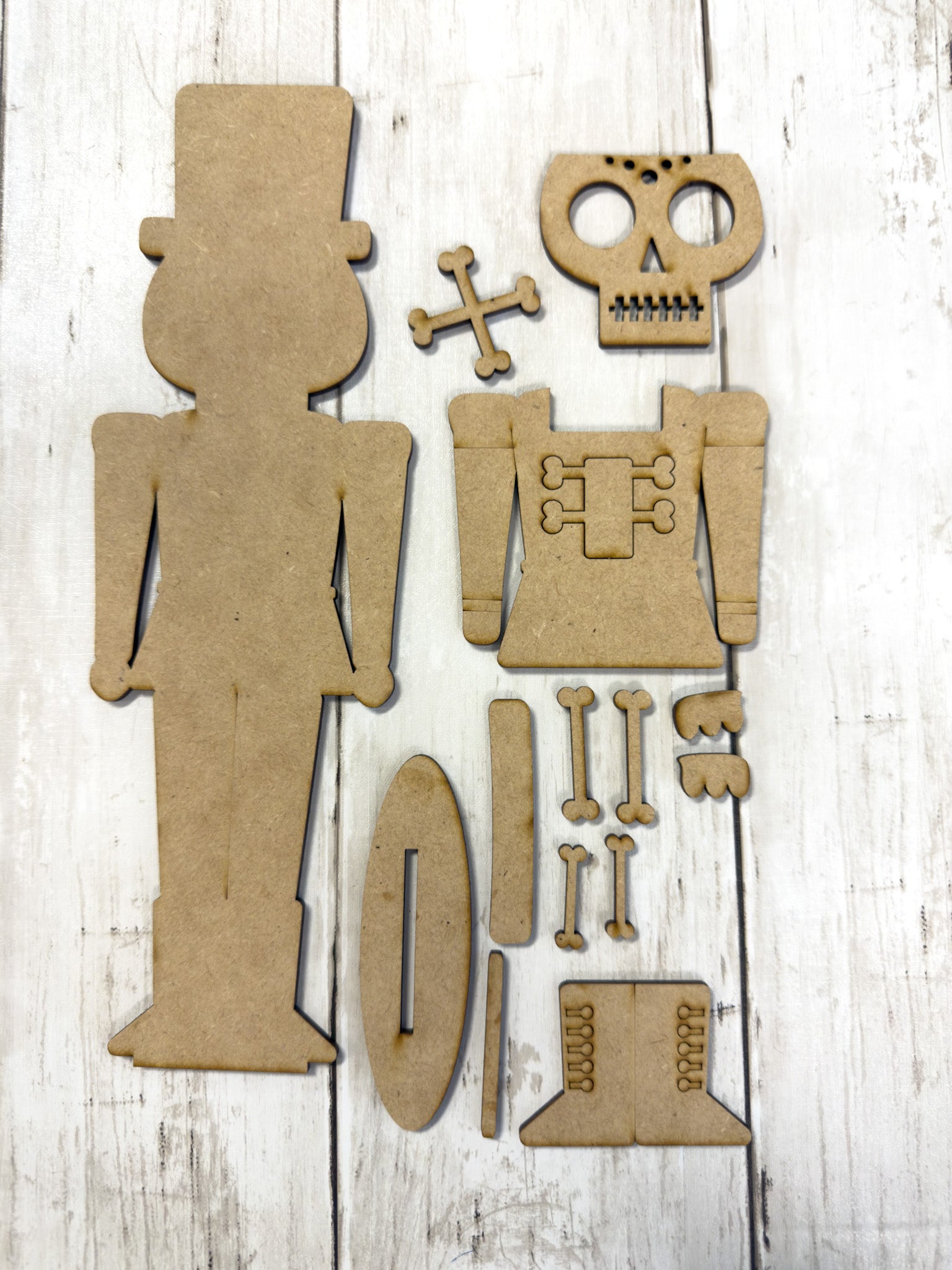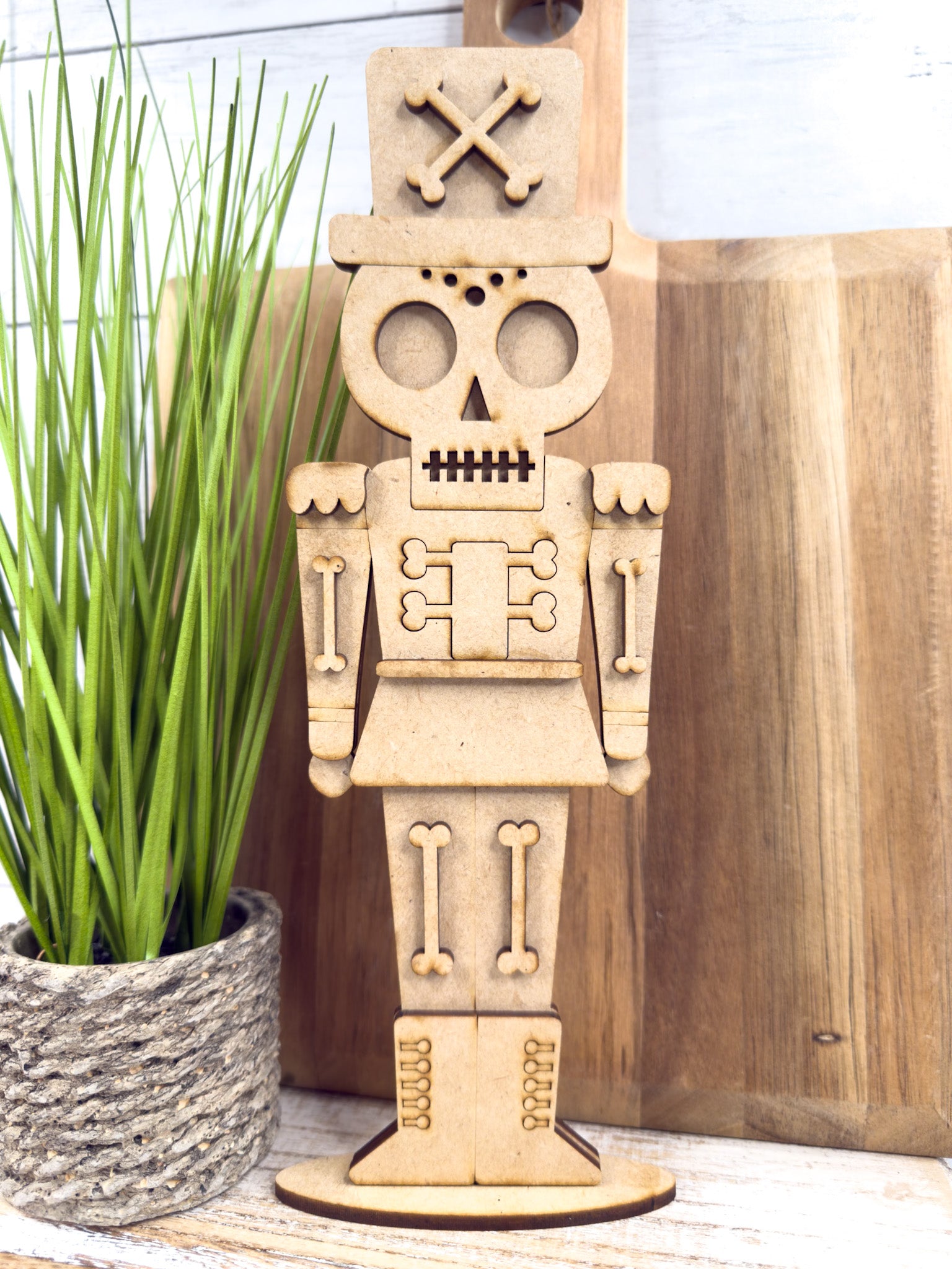 Each cutout is laser cut from smooth MDF wood in the USA and ships unfinished, making it easy to paint, stain, glitter, or embellish to your taste. The layered details create dimension, making this nutcracker a standout shelf sitter for mantels, tiered trays, or Halloween displays.