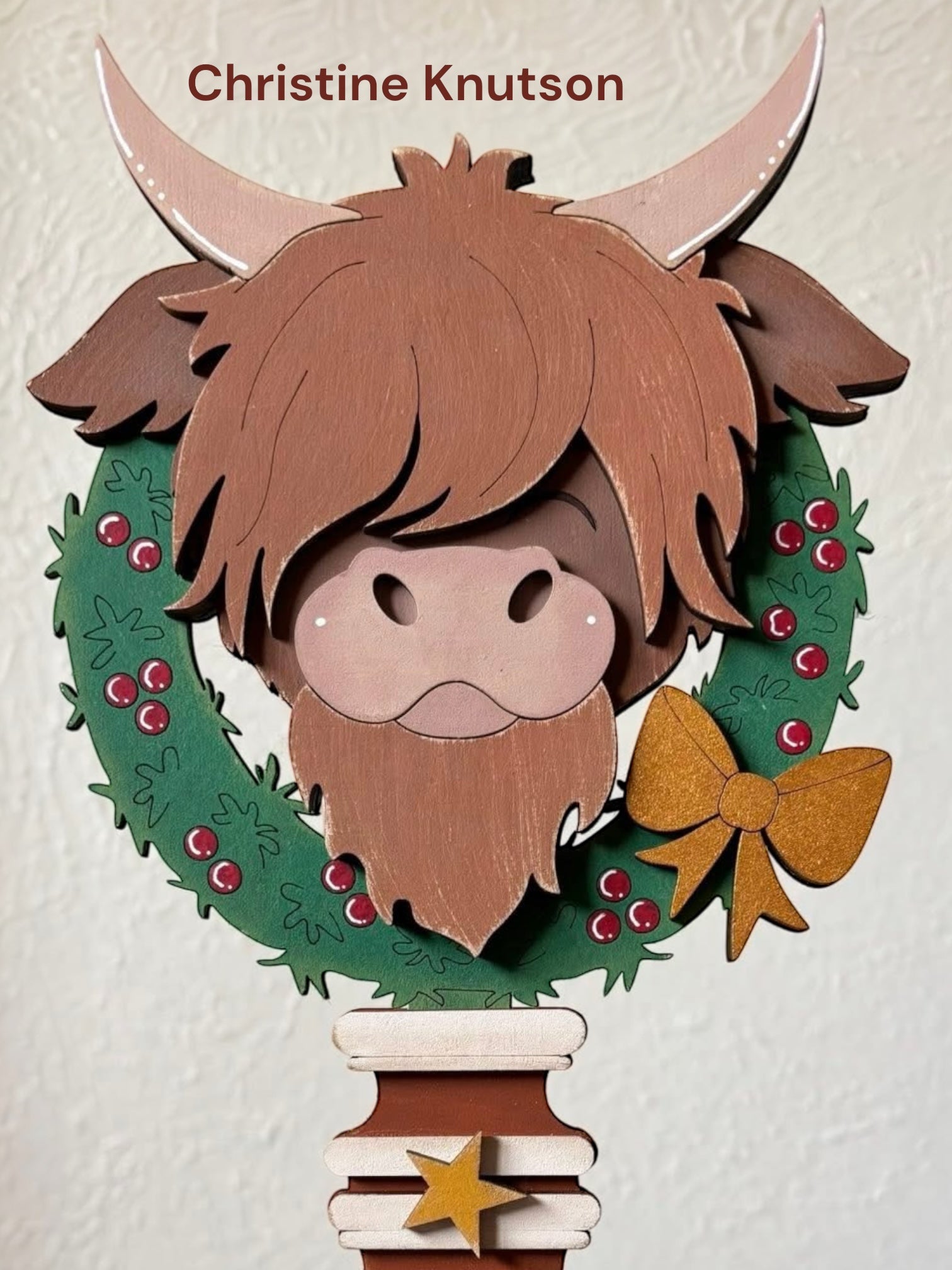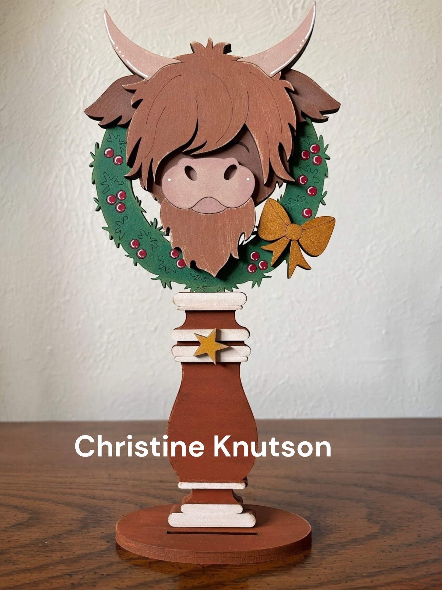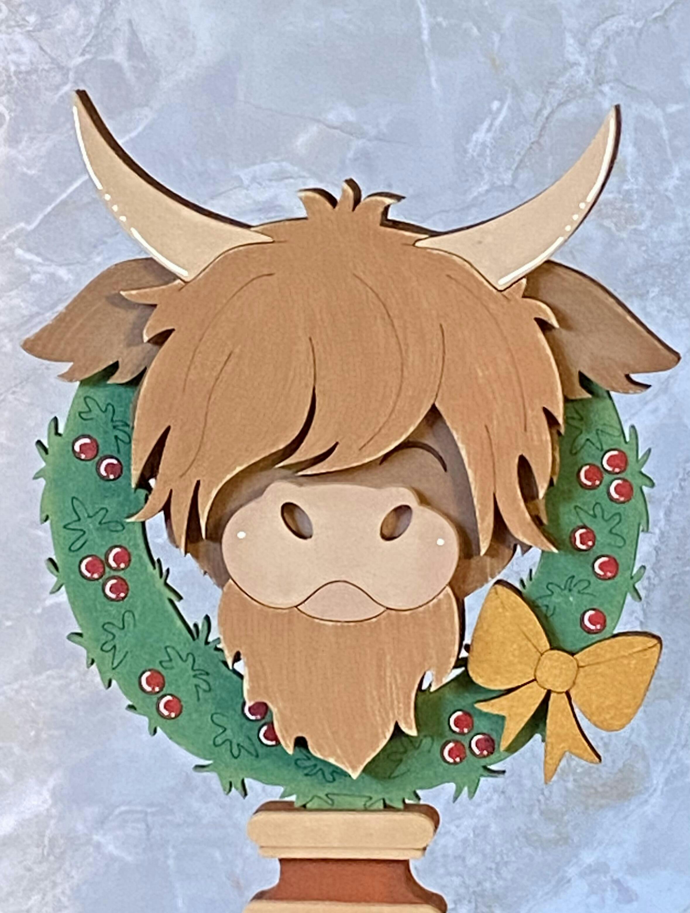 This Highland Cow Wreath insert for our Interchangeable Spindle Base would look amazing added into your Christmas decor or mixed in with the decor on your shelves.
