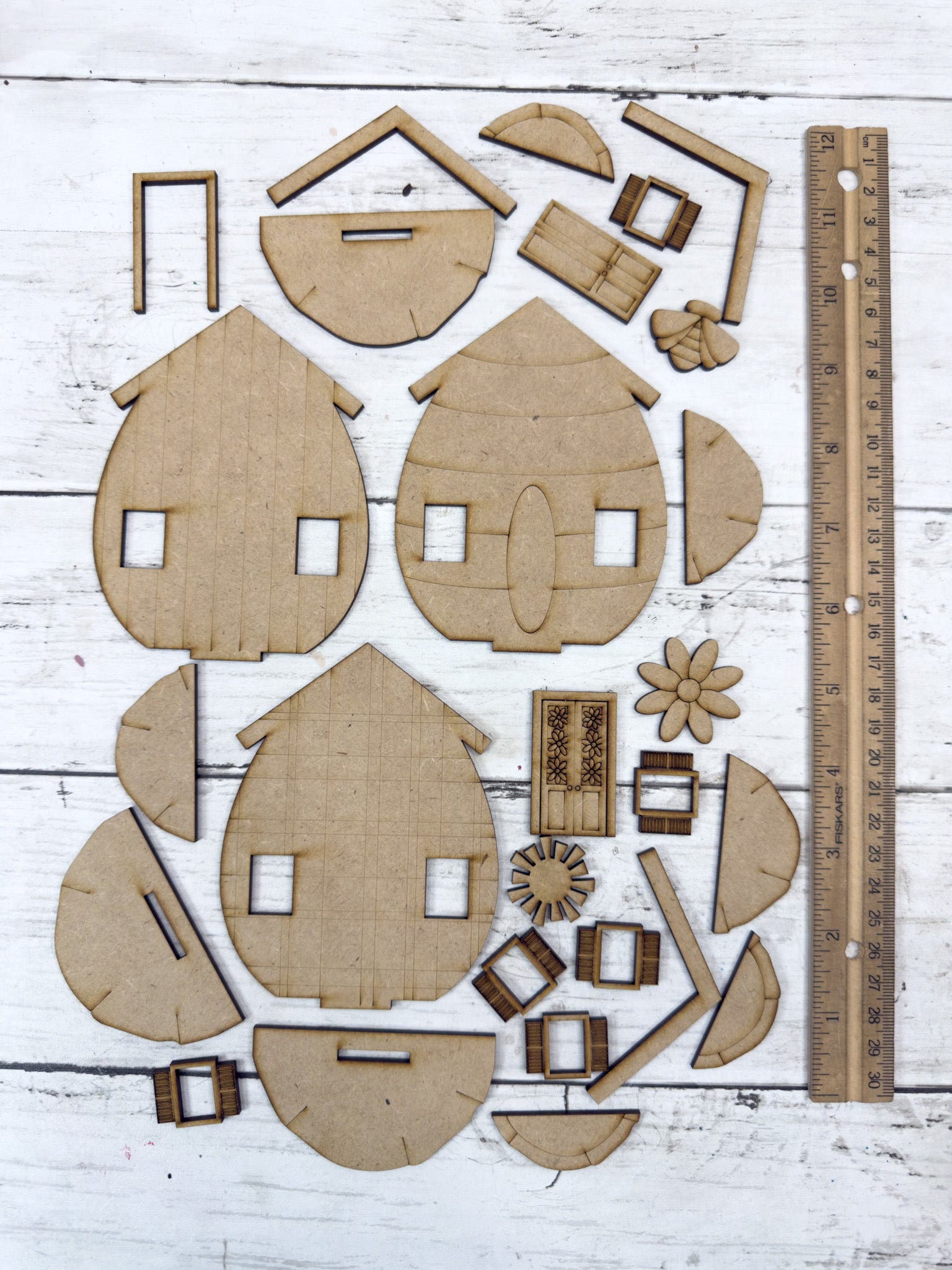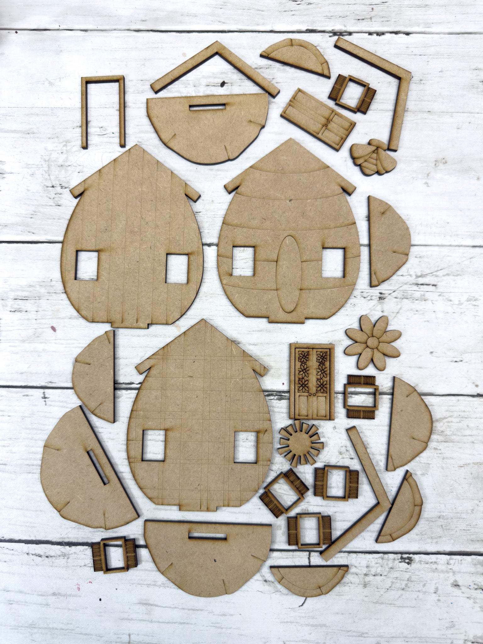 • All laser-cut wood pieces shown for all three houses