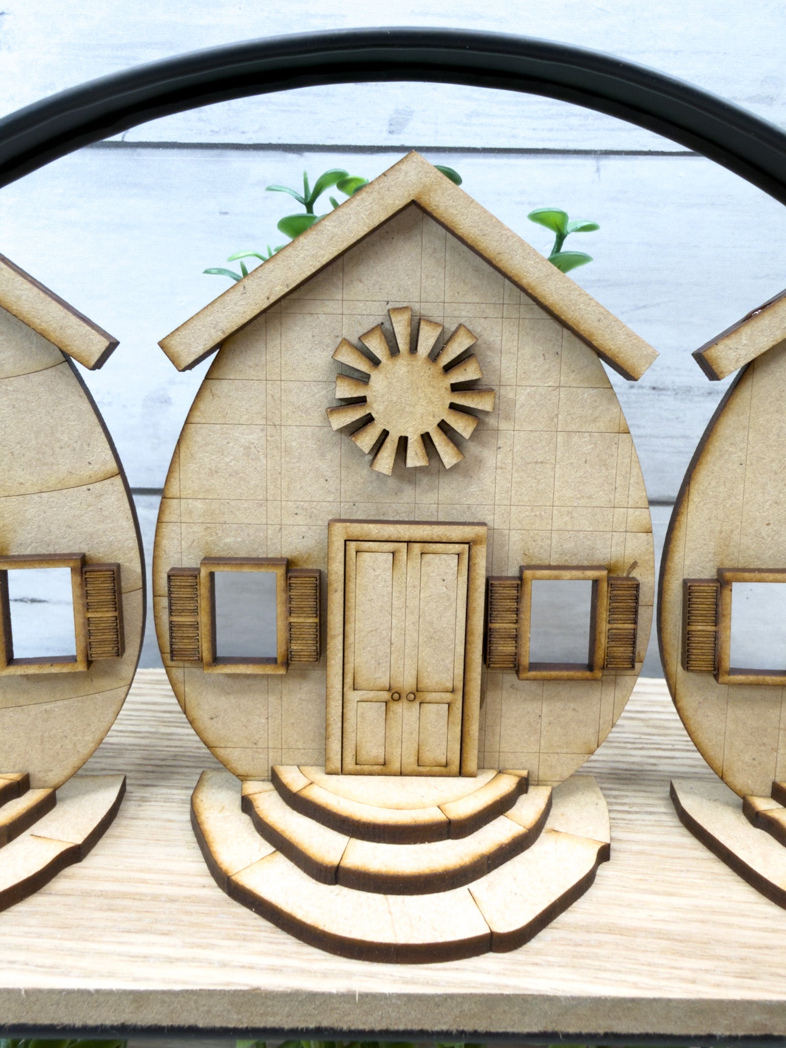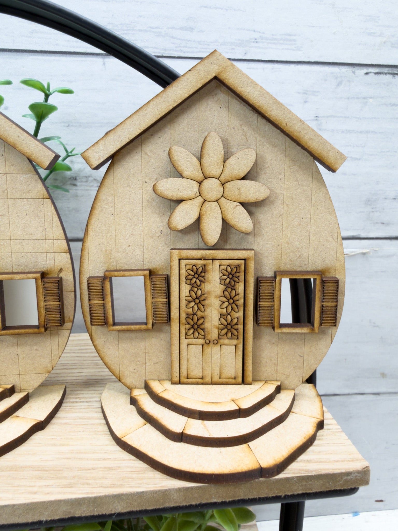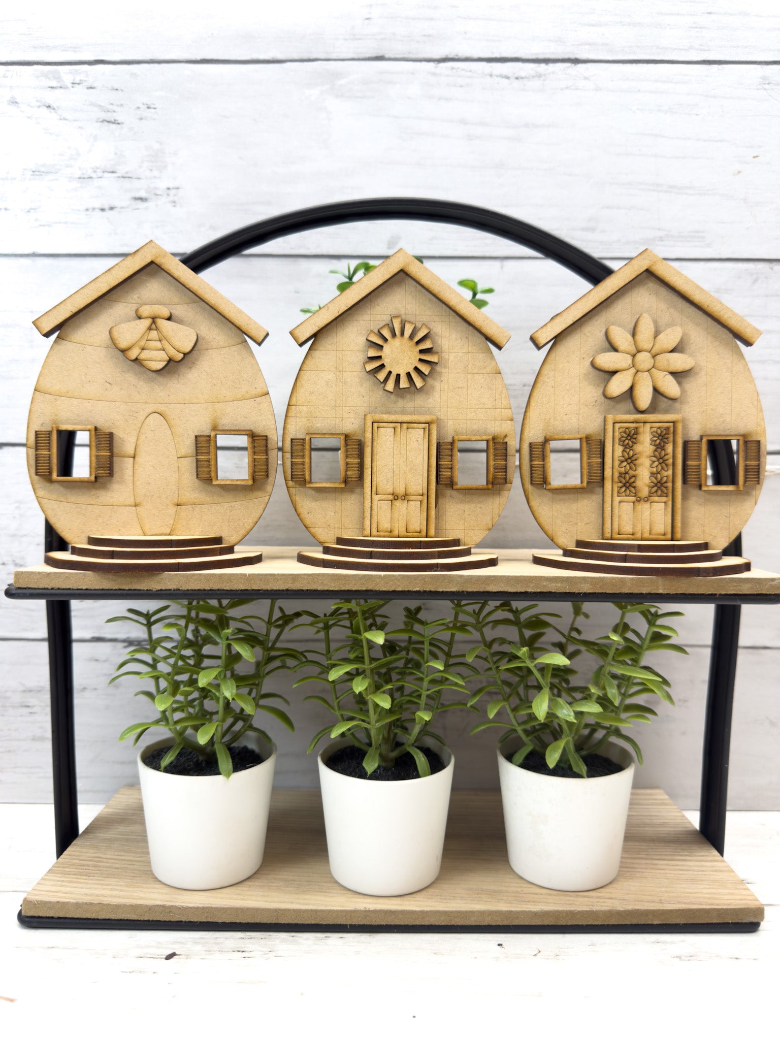 This coordinated set features three sweet house designs with layered details, shutters, doors, and decorative accents—perfect for painting and displaying together or styling individually.