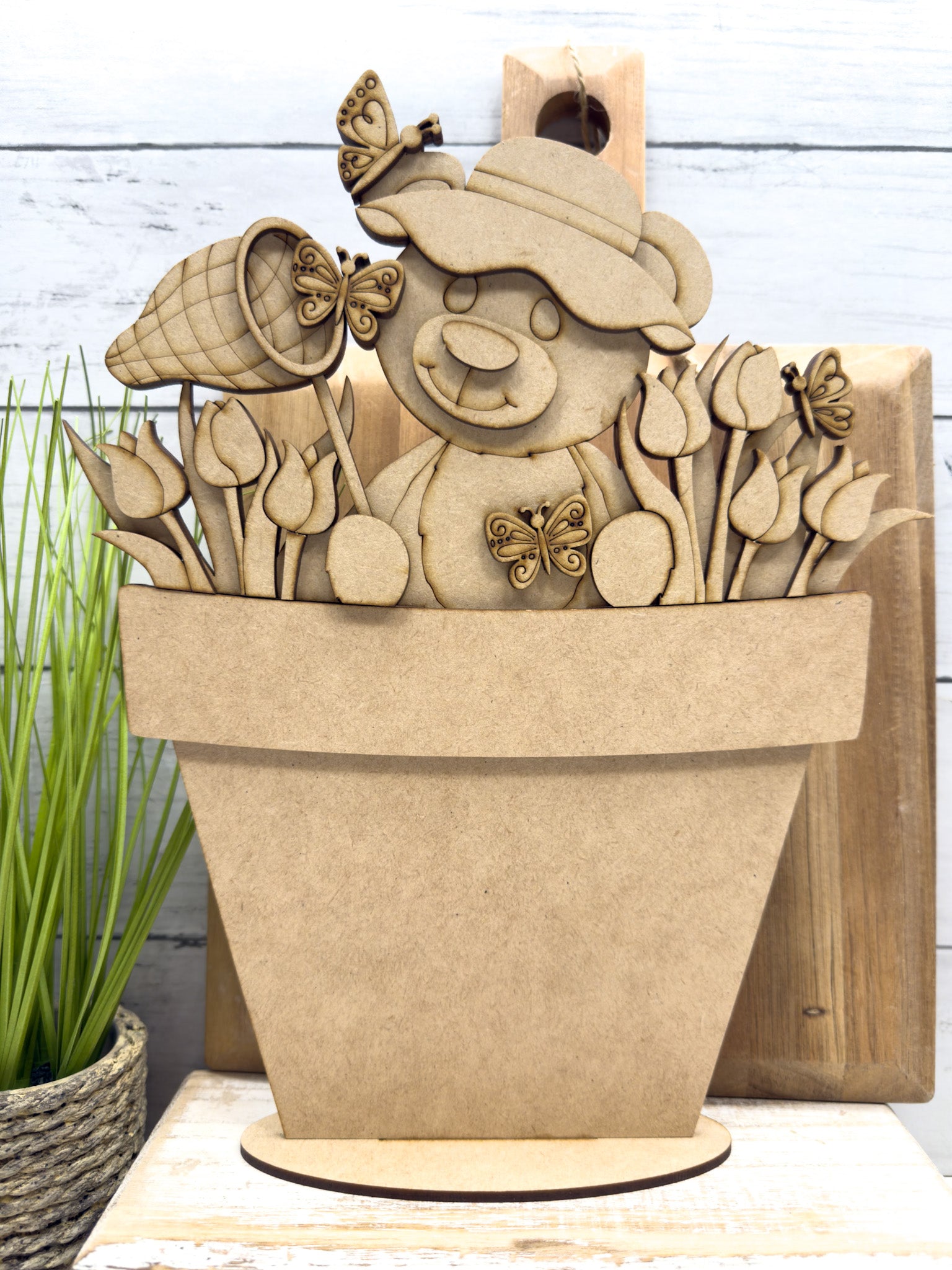 Designed to fit perfectly in your slot/tab base, this interchangeable insert features a lovable bear surrounded by blooming tulips, butterflies, and a garden net - bringing a soft, cheerful farmhouse feel to your decor.