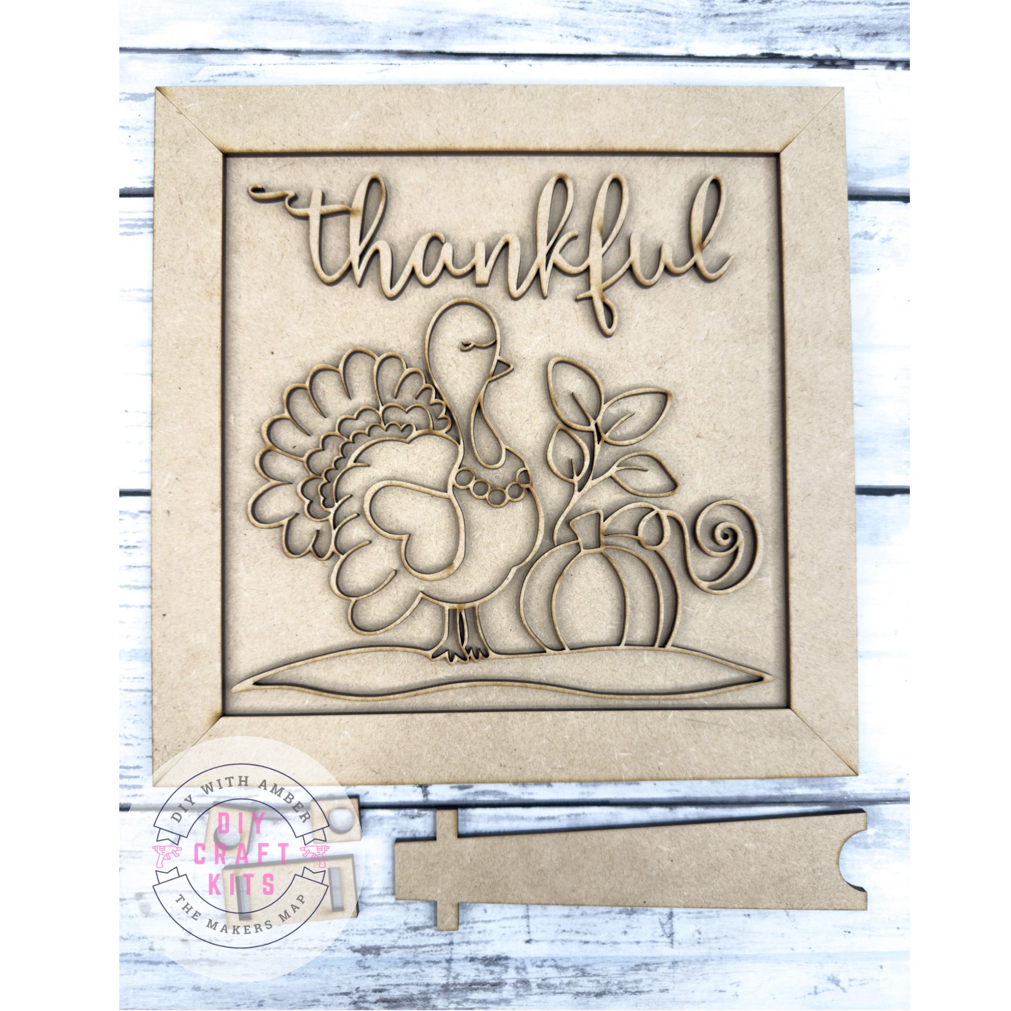 Unfinished wood pieces for framed turkey thankful sign with stand