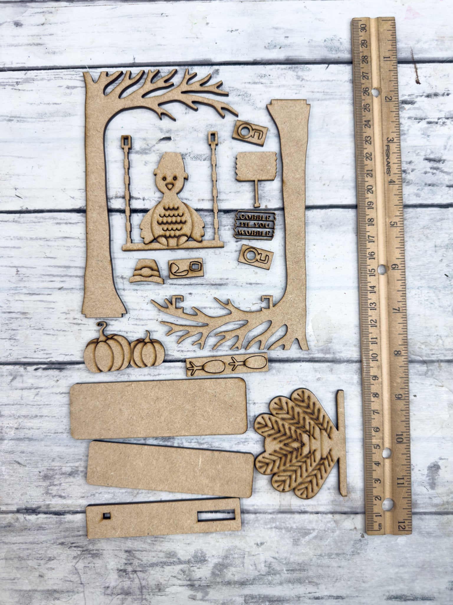 Laser cut from smooth 1/8” HDF (High-Density Fiberboard), each piece comes unfinished and ready for you to paint, stain, or embellish in your own creative style. Whether you keep it rustic or add bold fall colors, this kit makes a delightful holiday display for shelves, tables, or mantels.