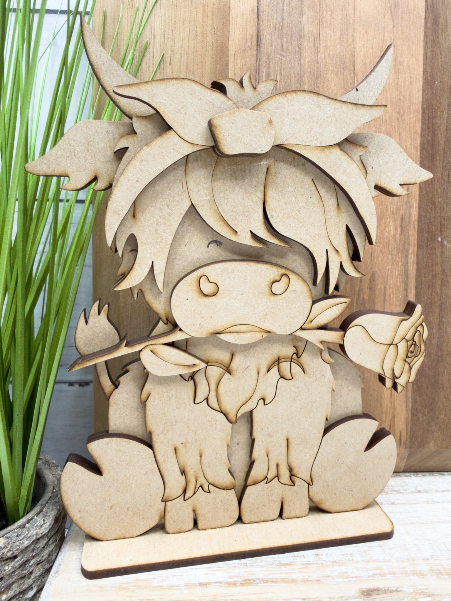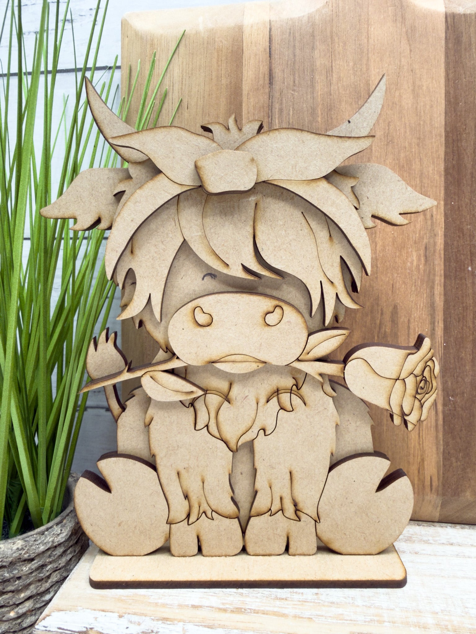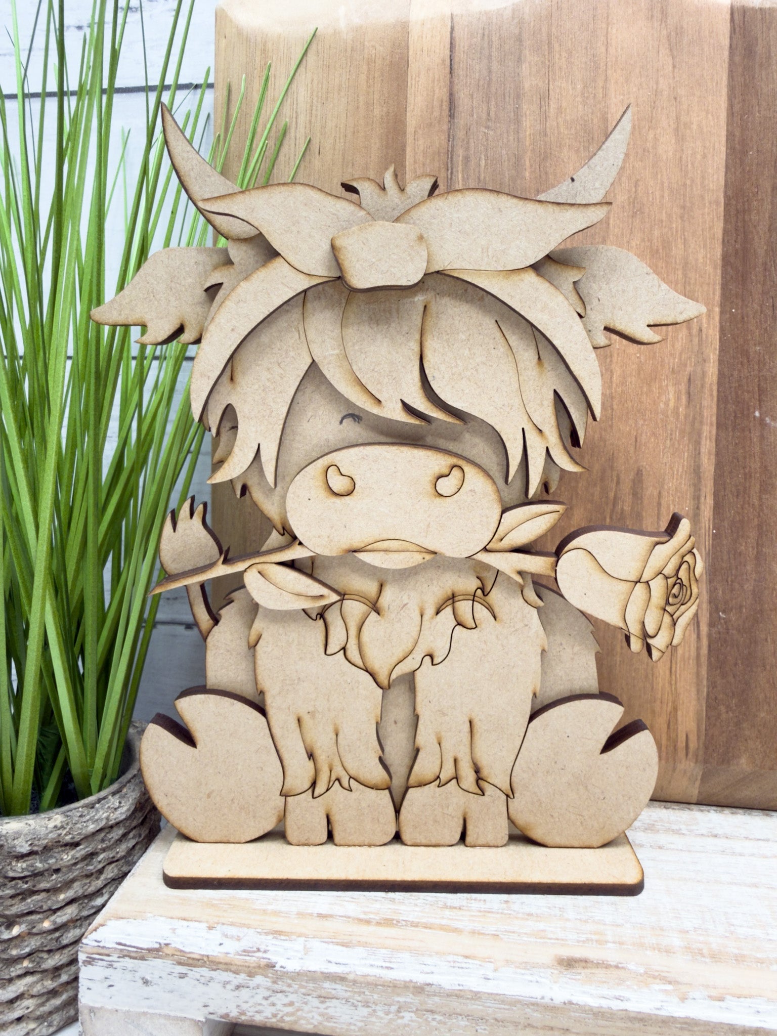 Add rustic charm and cottage style to your home with our Highland Cow and Rose Sitter DIY Kit. This beautiful layered wood design features a sweet Highland cow holding a rose, topped with a flowing bow for a soft and elegant farmhouse look.