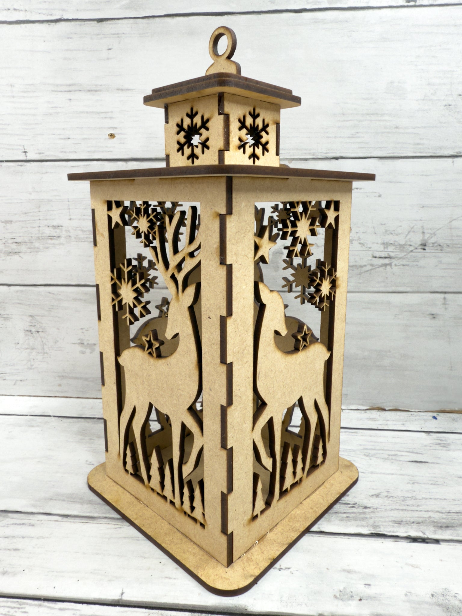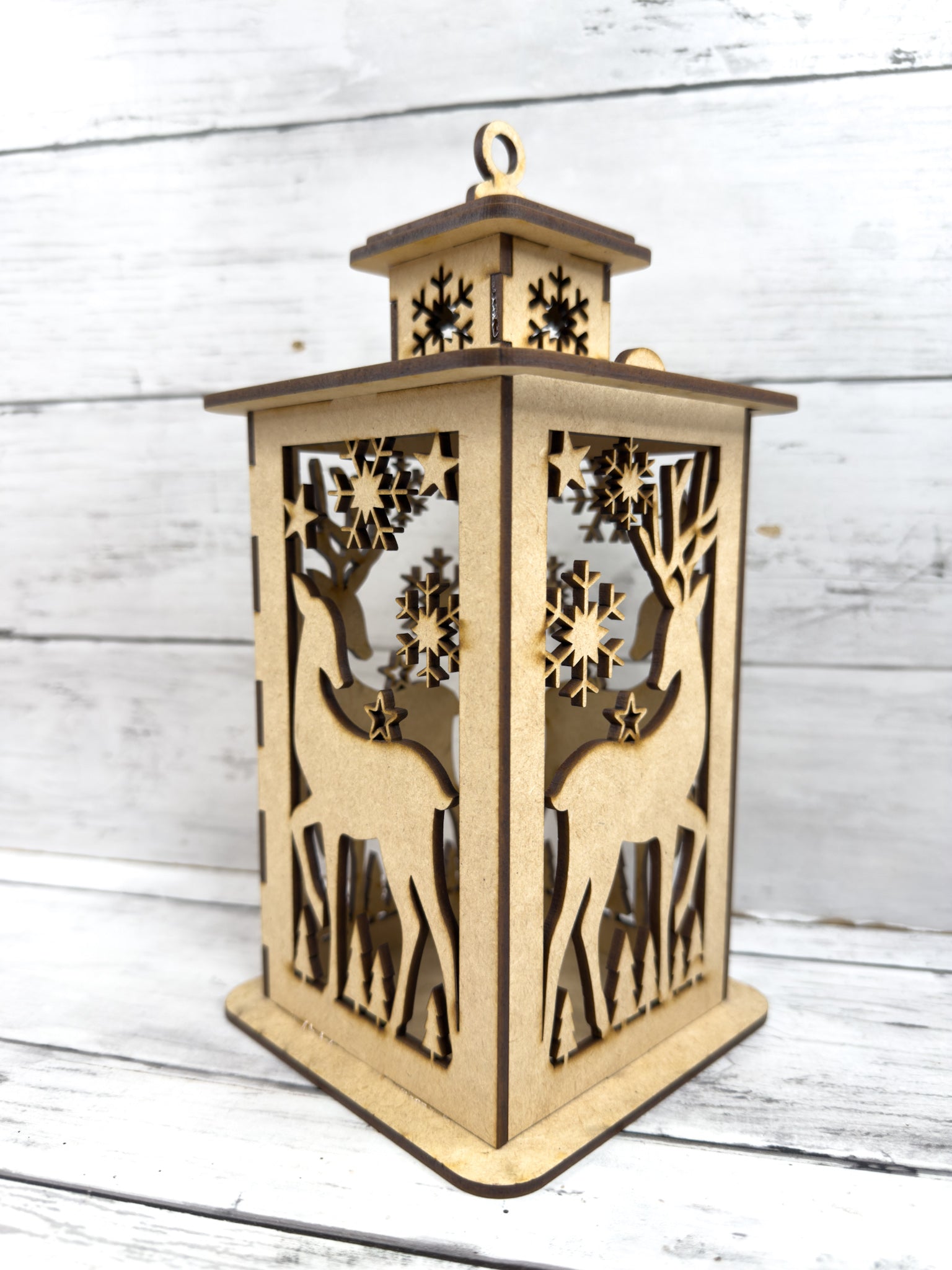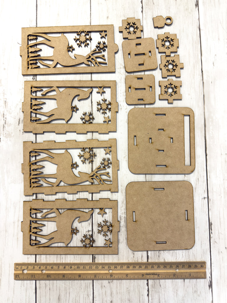 1 unfinished laser-cut wood lantern kit featuring deer and snowflake details
