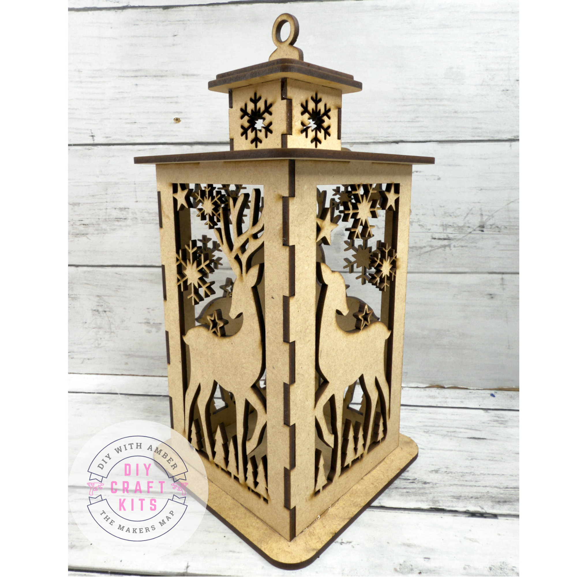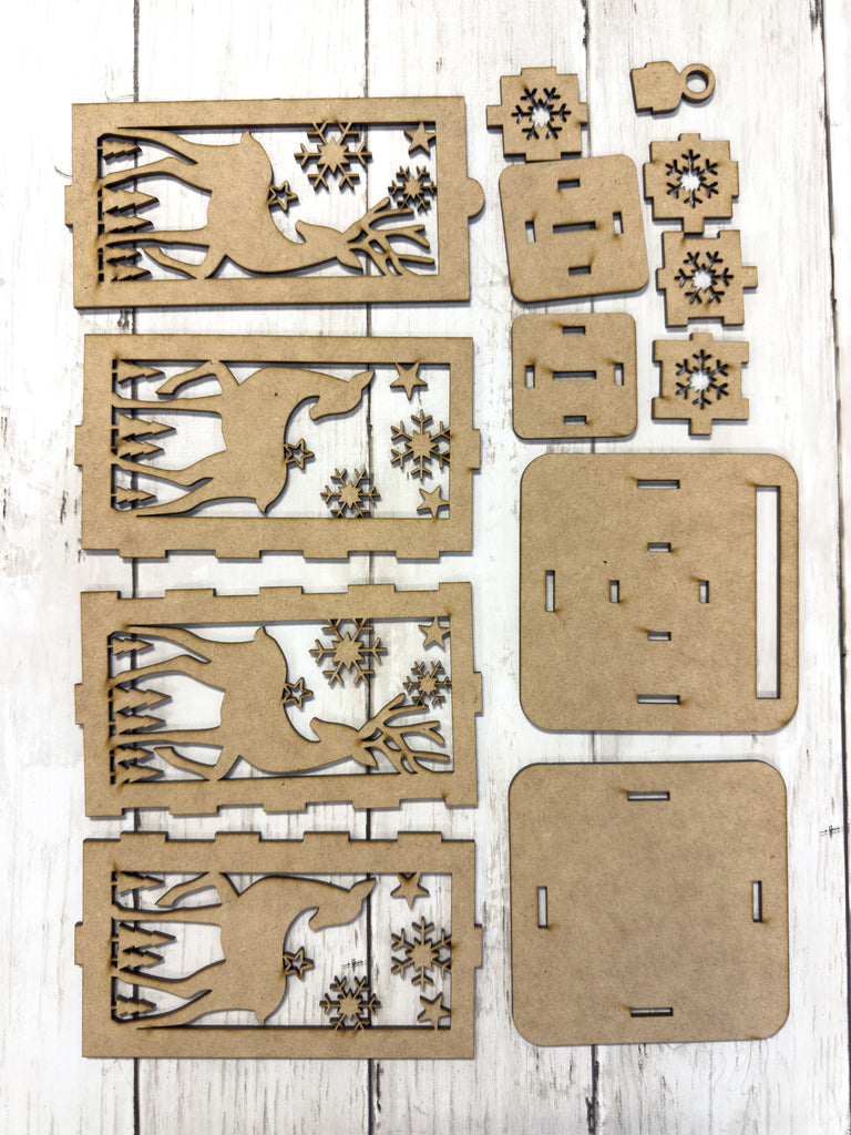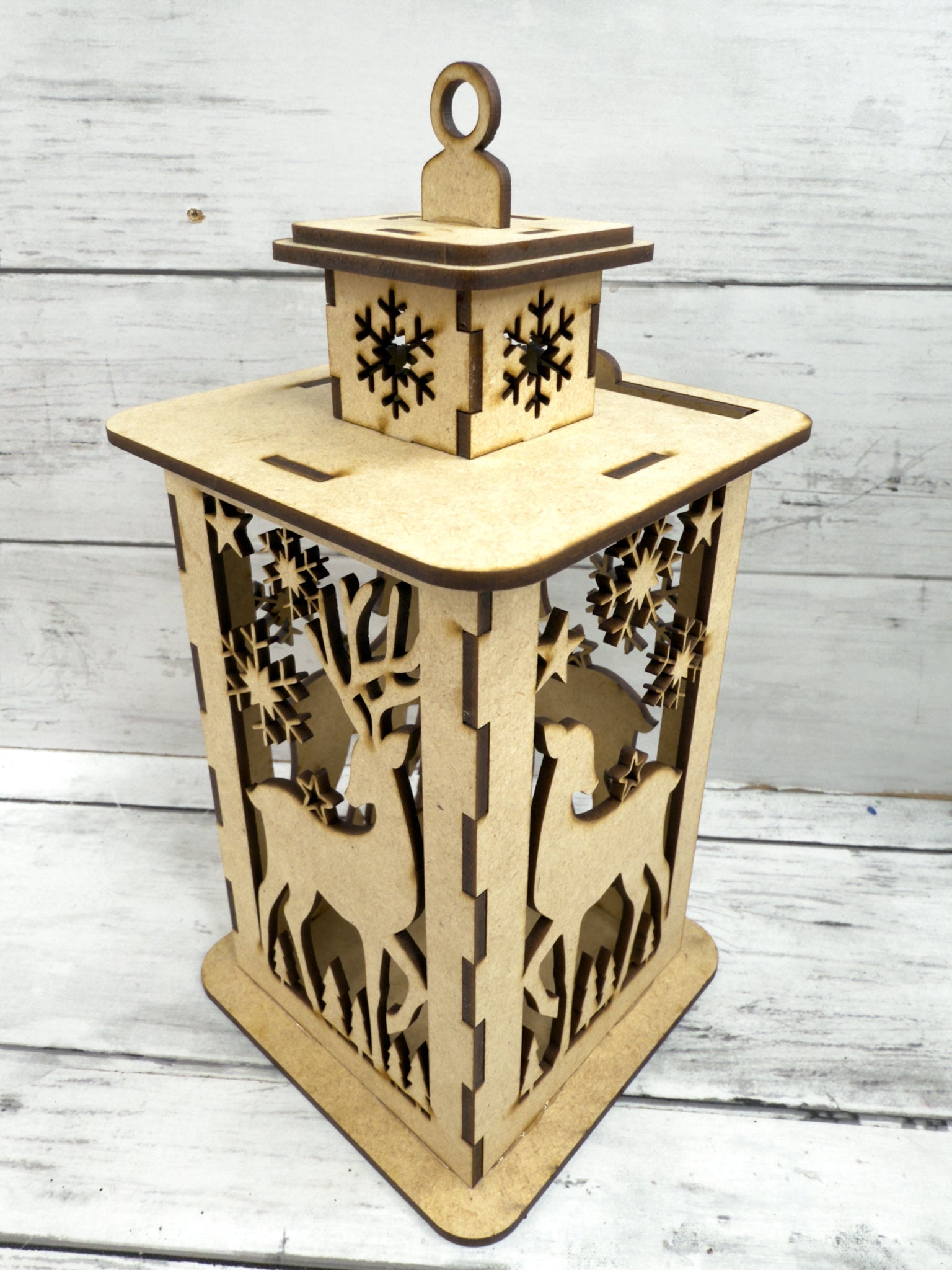 1 unfinished laser-cut wood lantern kit featuring deer and snowflake details