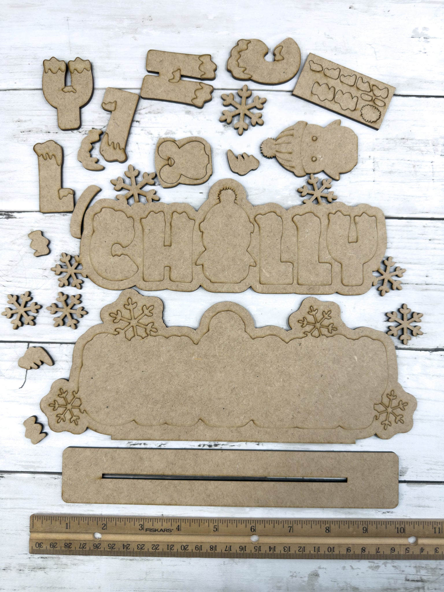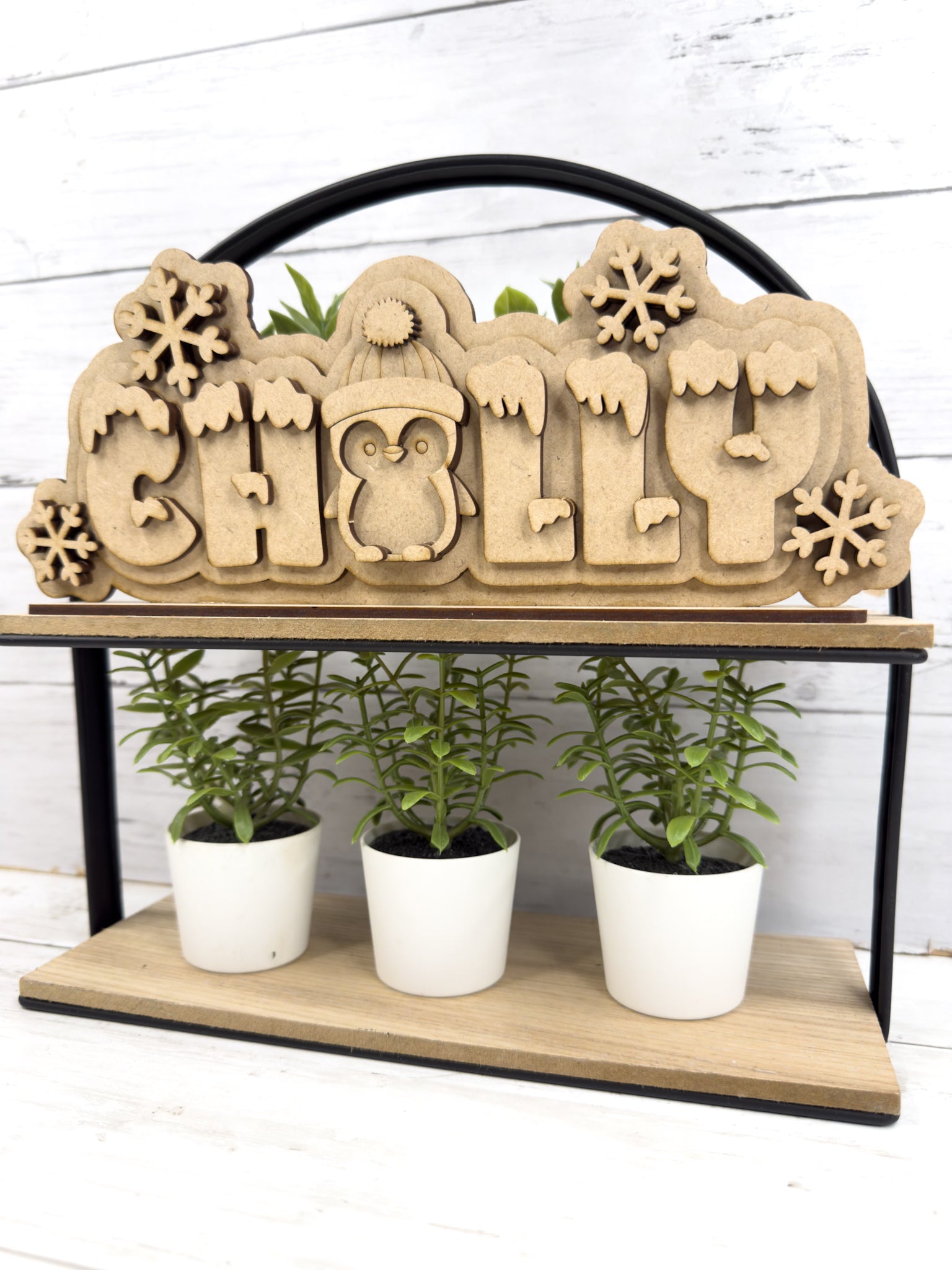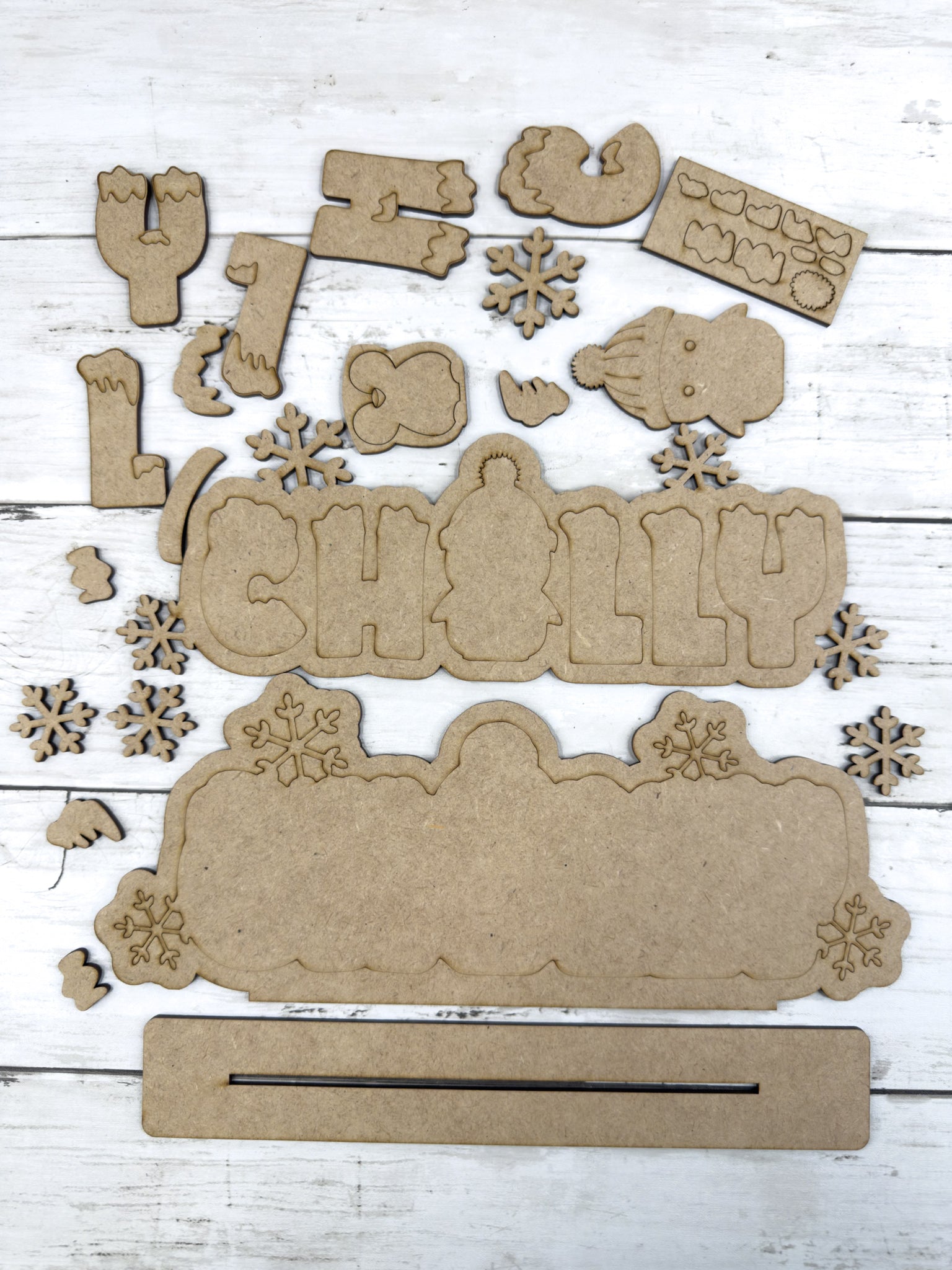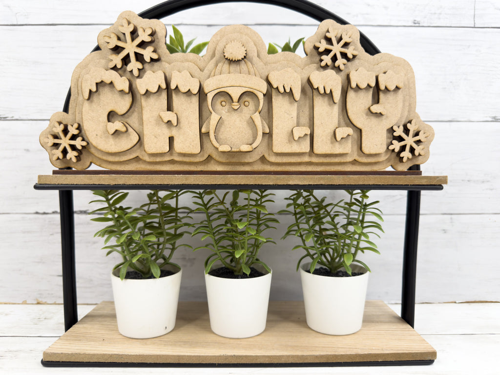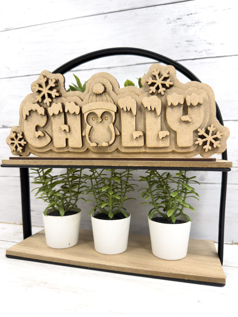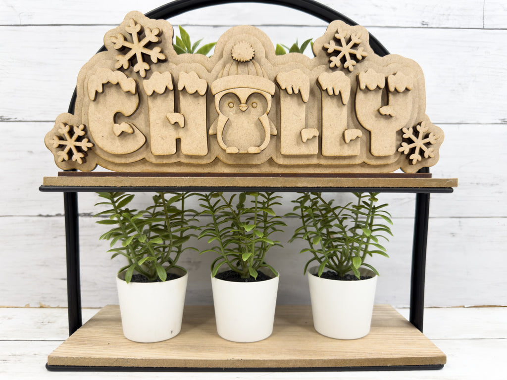 This layered wood sign spells out “CHILLY” with a cute penguin in the middle, surrounded by snowflakes and snowy details. It’s the perfect project for painting, staining, or decorating with crushed glass and resin to create a frosty winter display.